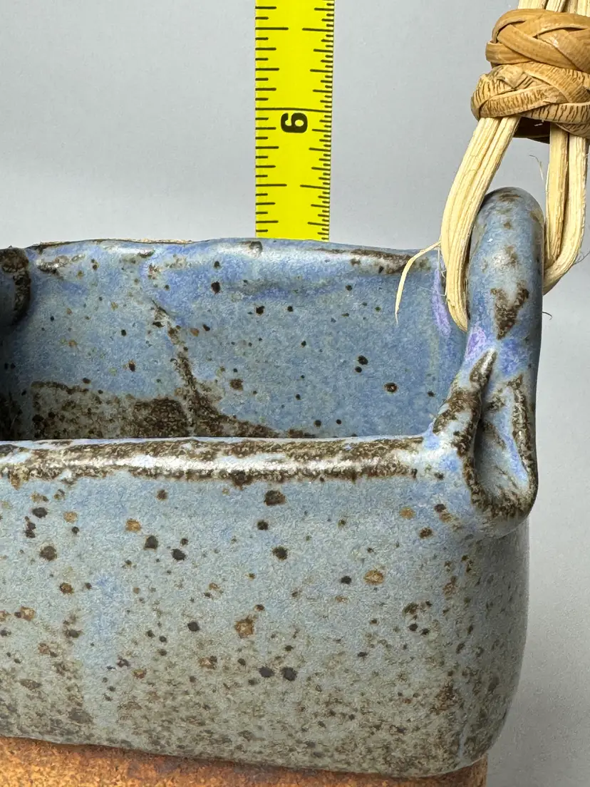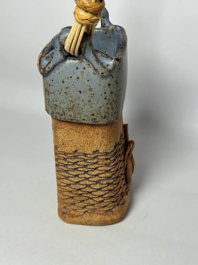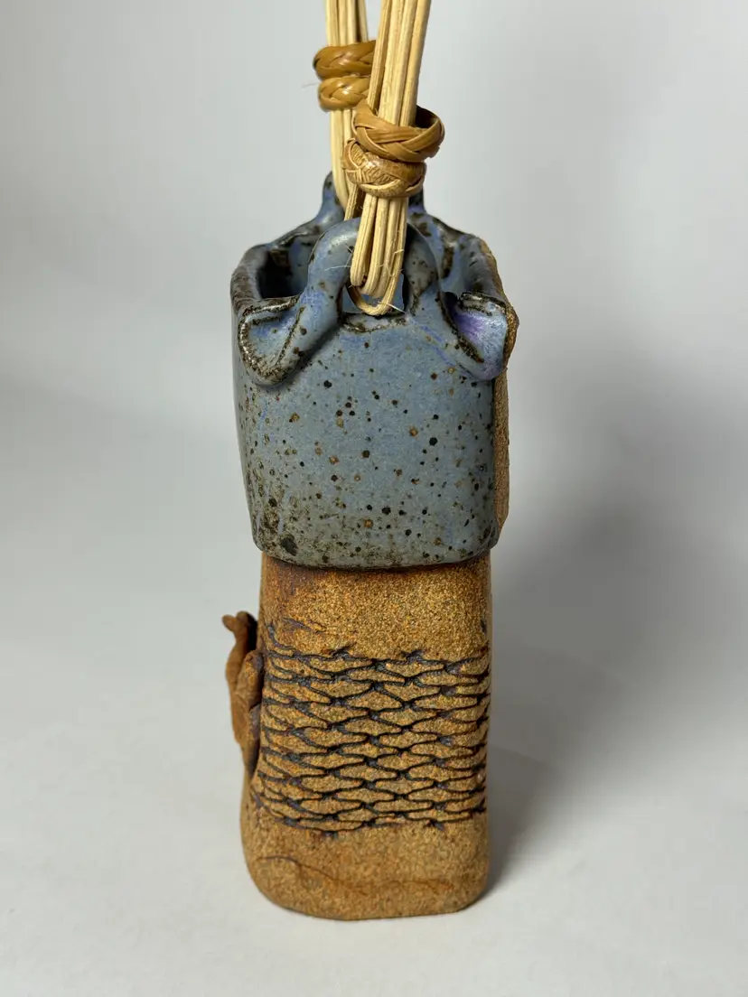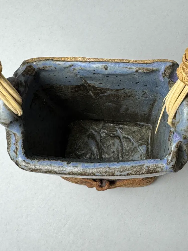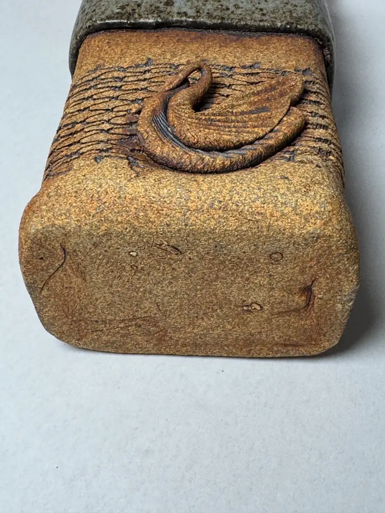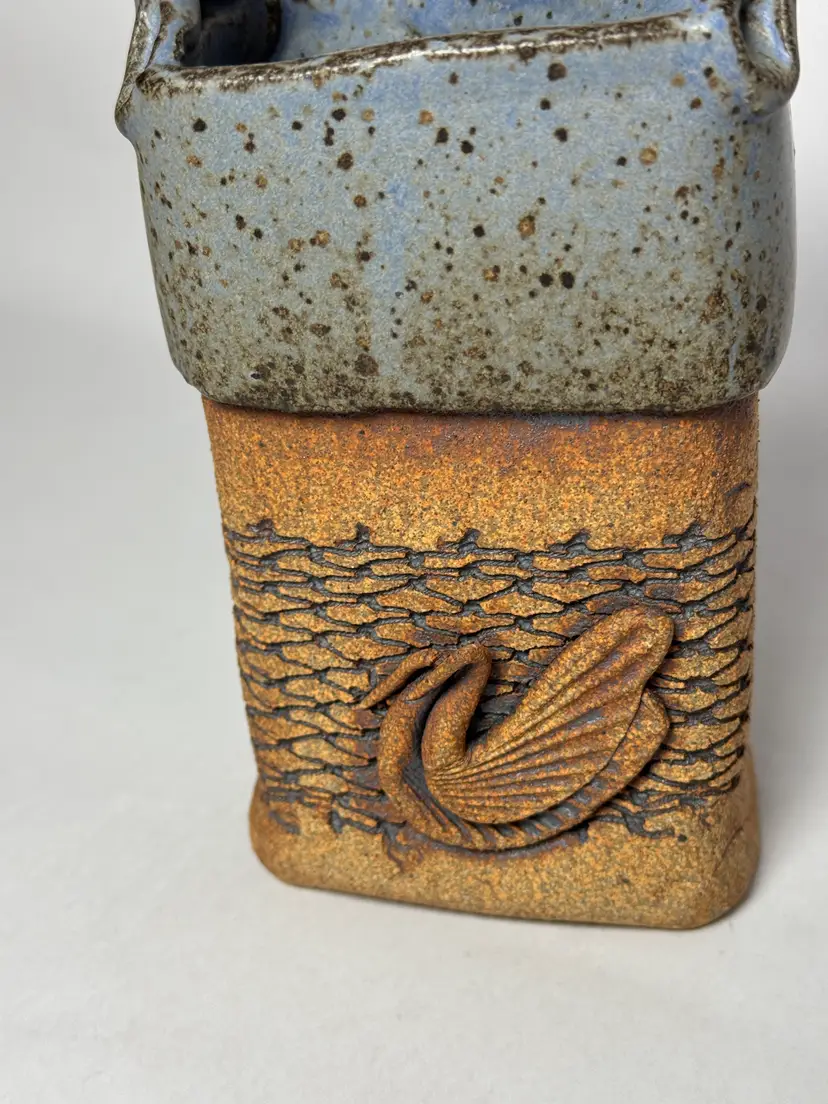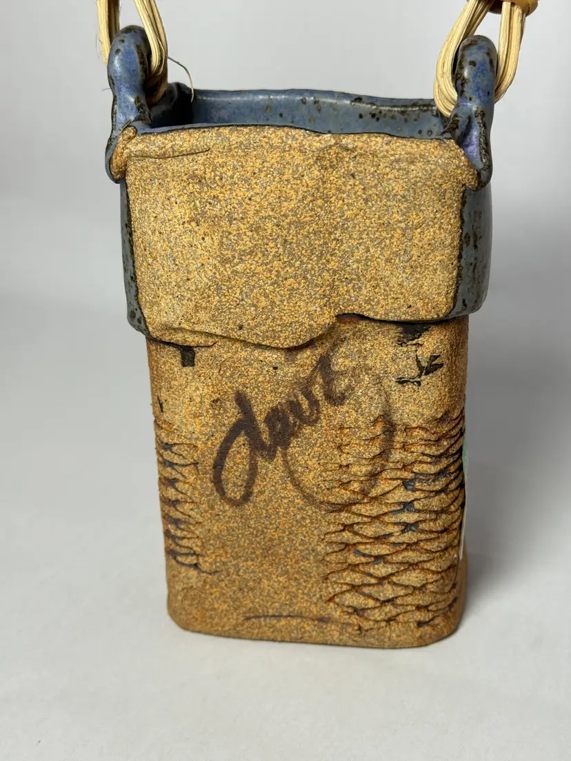 Studio art pottery vessel featuring applied swans, reed handle and signed "dave".