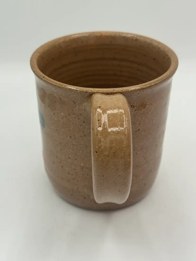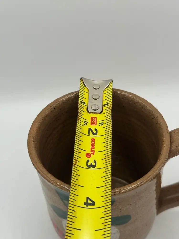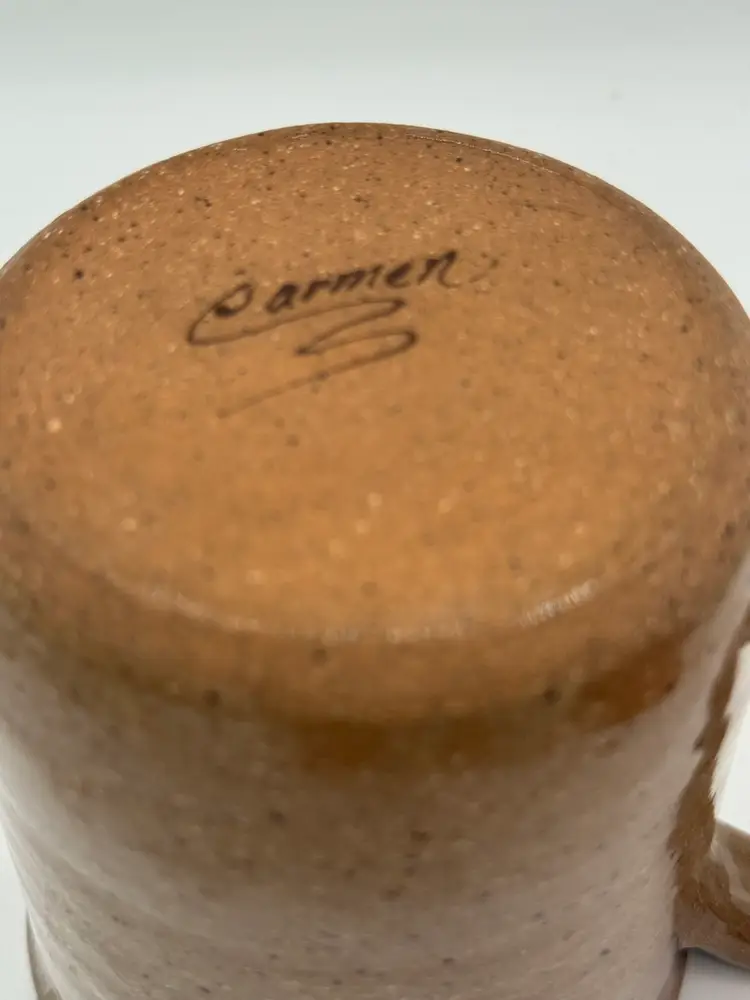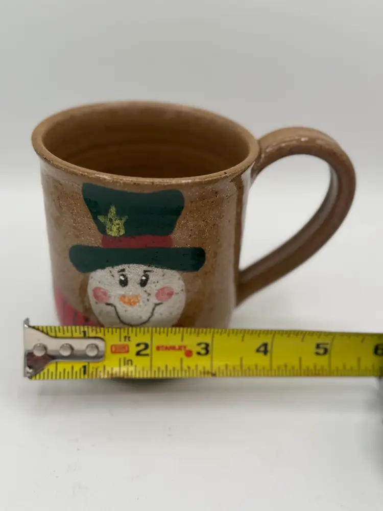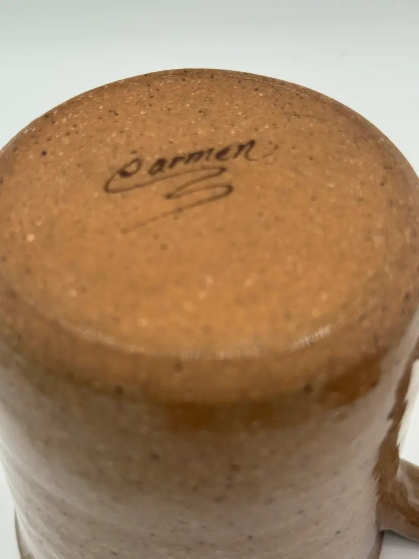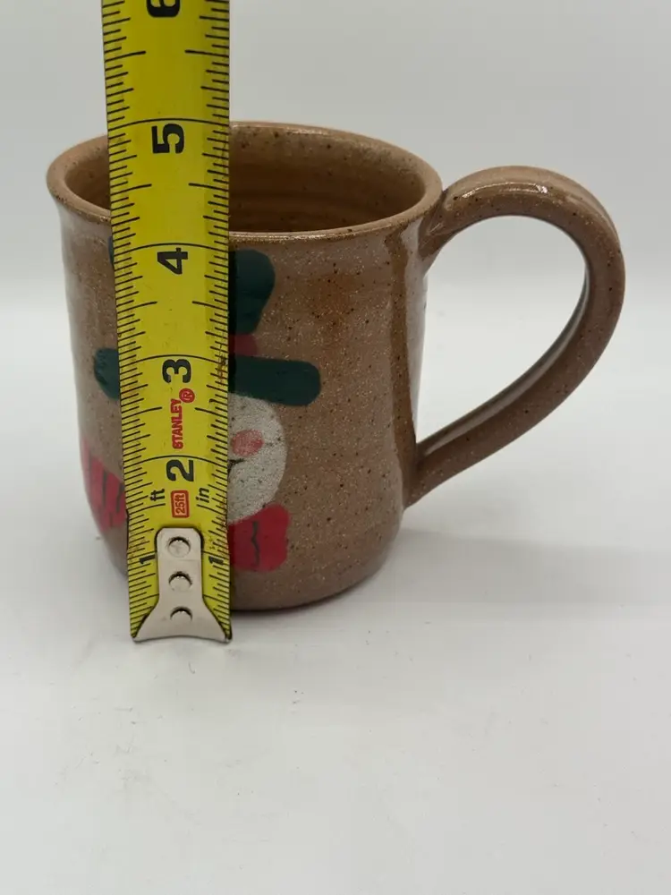 Carmen’s Pottery was sold in Athens Ohio. This whimsical holiday mug measures 4 1/4” tall with a 3 5/8” diameter.