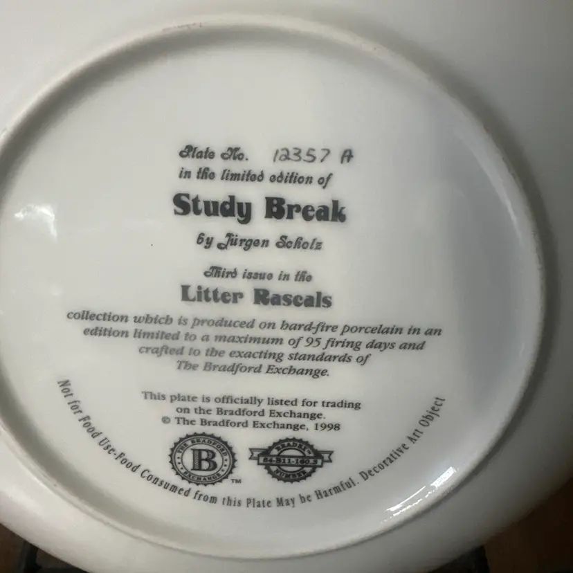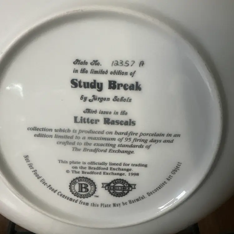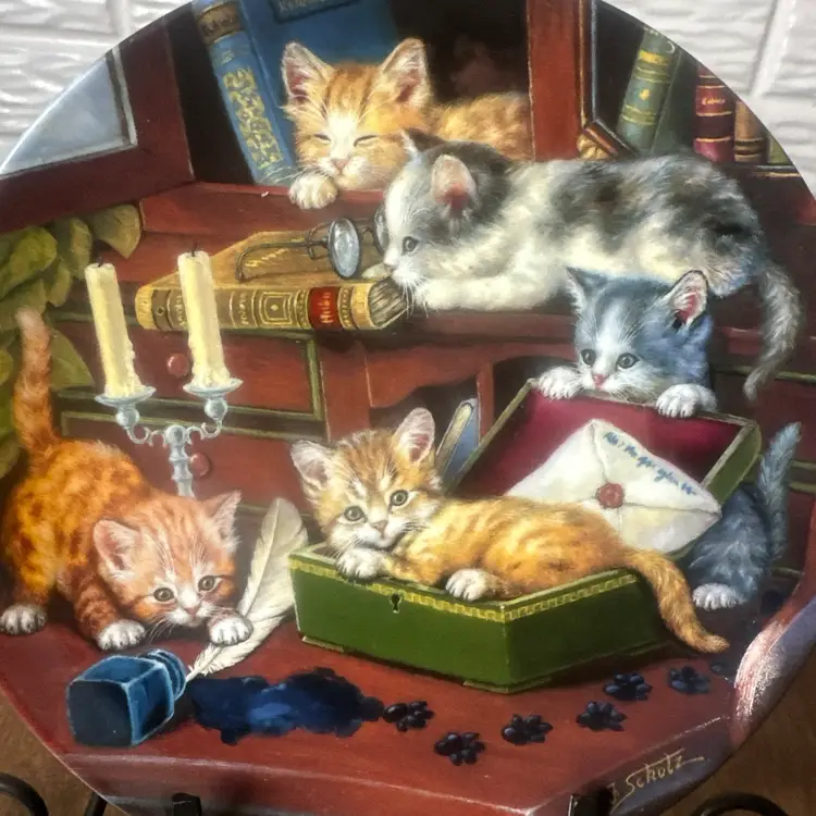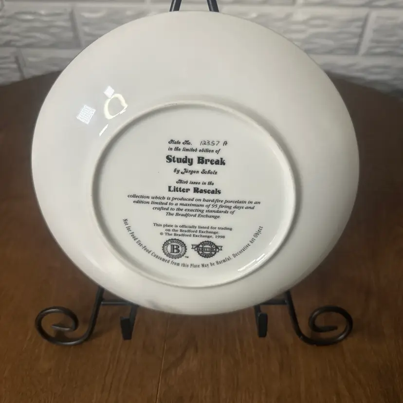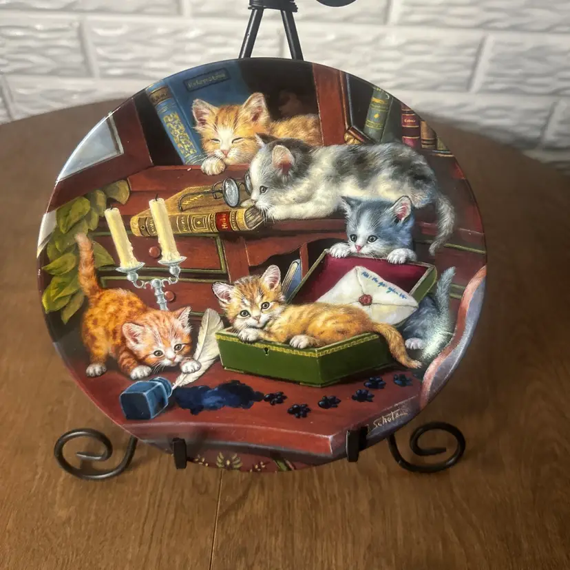 The 8" Kittens Bradford Exchange porcelain Litter Rascals plate is a decorative collector's item featuring a charming kittens pattern in multicolor. Made of porcelain and measuring 8 inches in diameter, this round plate is part of the Bradford Exchange product line and is styled as a decorative piece. With a theme centered around cats and an American culture influence, this contemporary collector's plate was manufactured in China during the 1990s. Perfect for any occasion, this plate is a delightful addition to any collection of decorative collectibles.