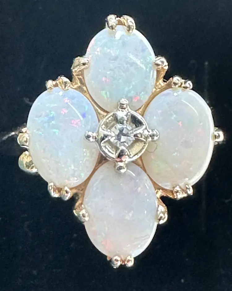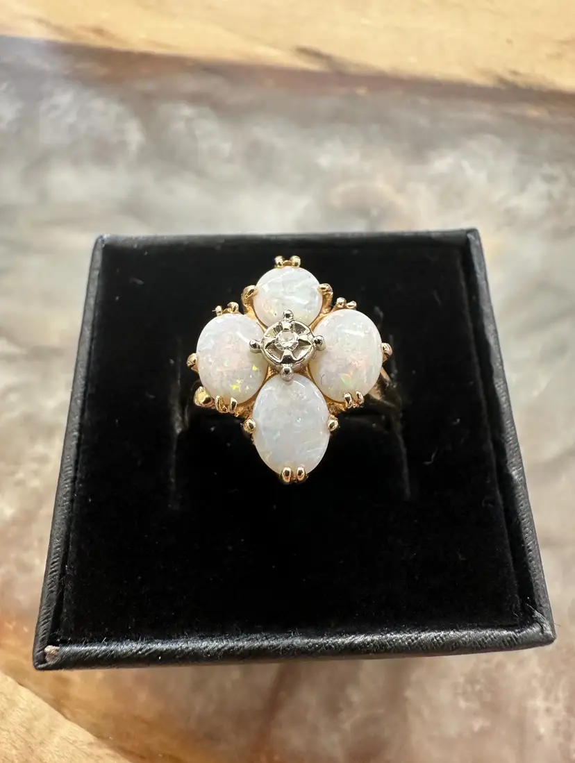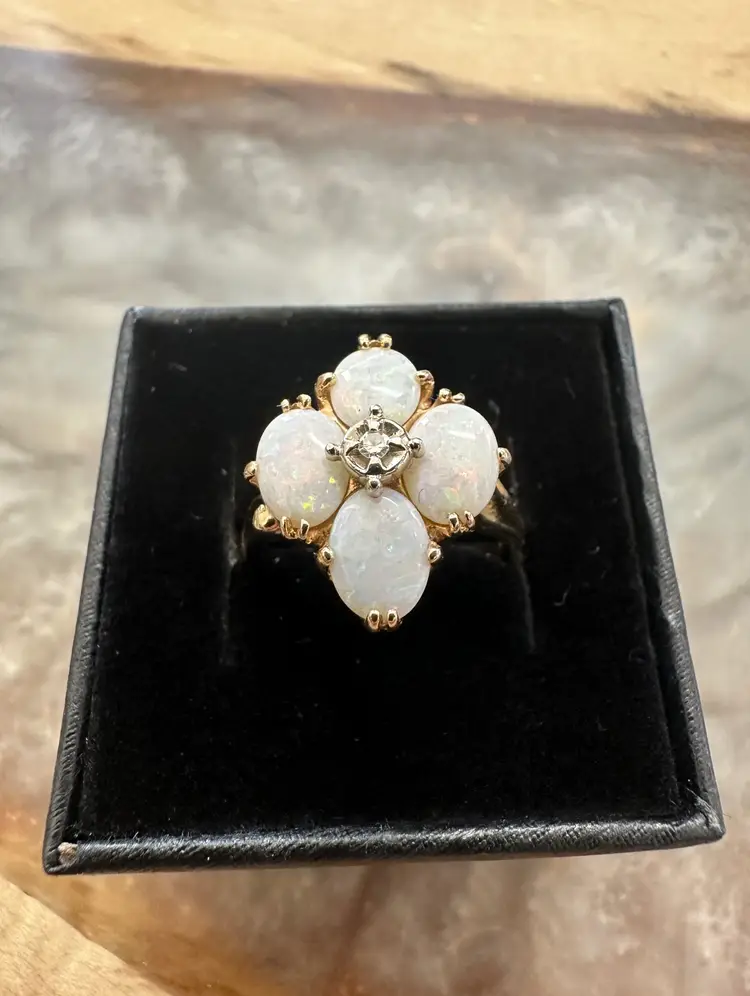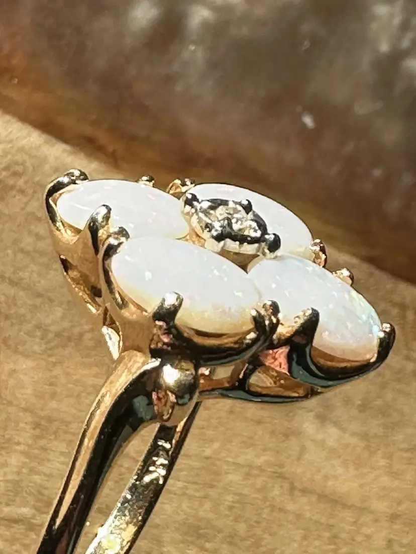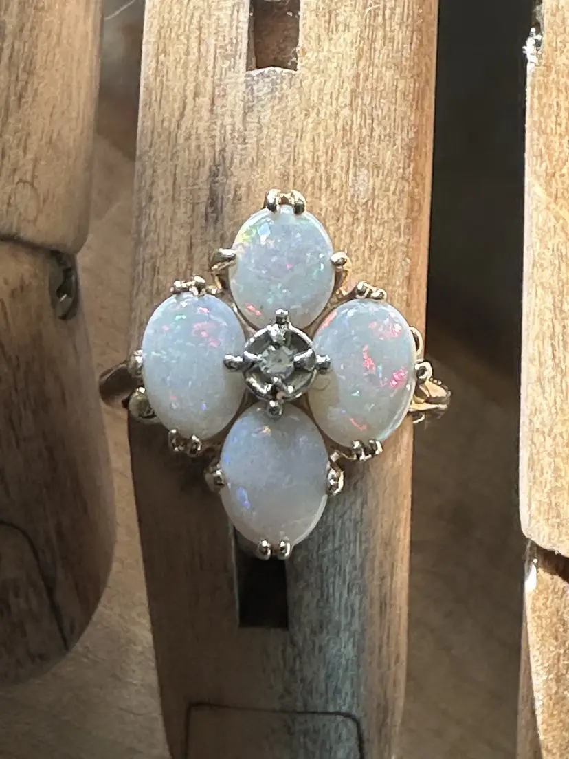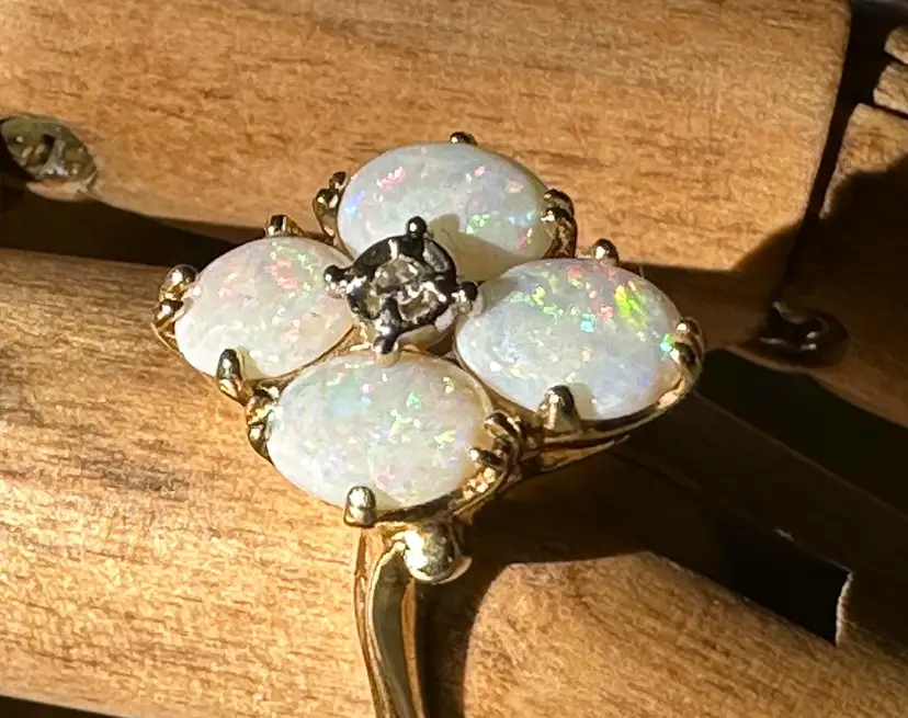 Beautiful vintage Opal Diamond ring. These natural opals are perfection with so much flash and play of color. Reds, greens, blues. Beautiful, with no cracks, crazing or issues. The diamond is the perfect accent to this stunning ring