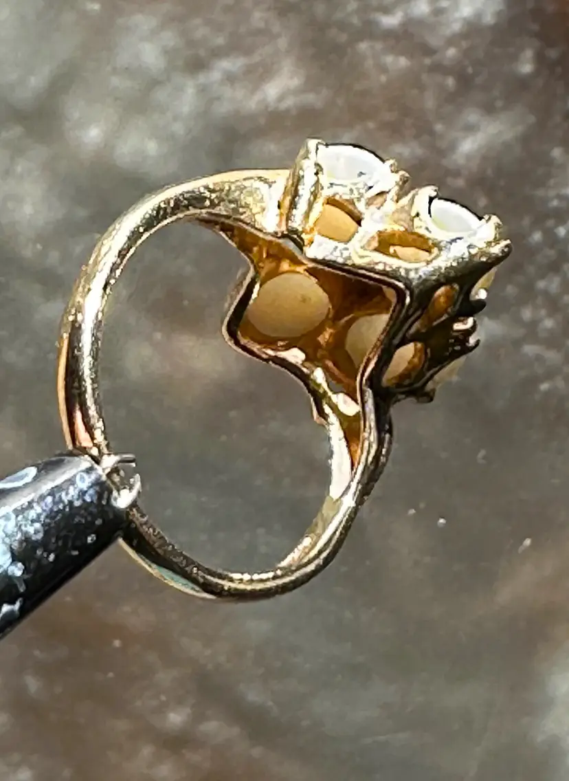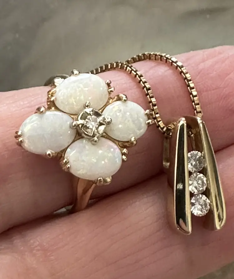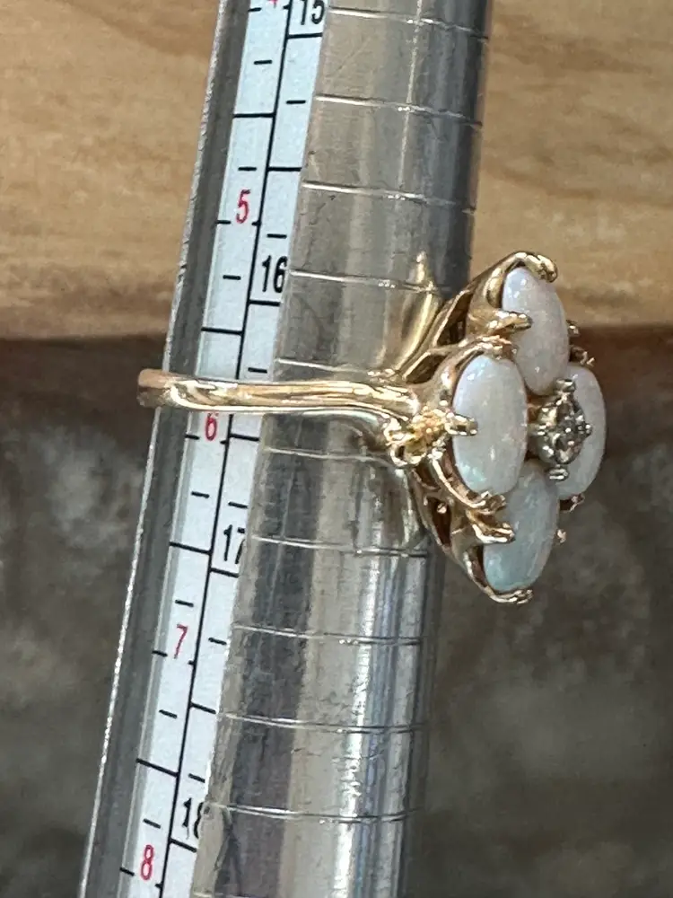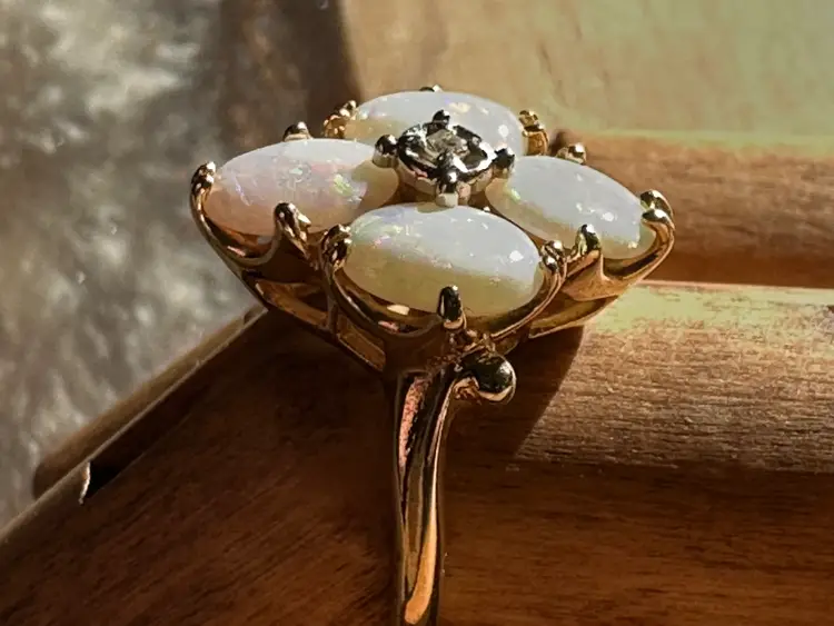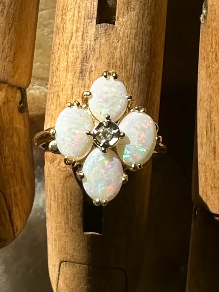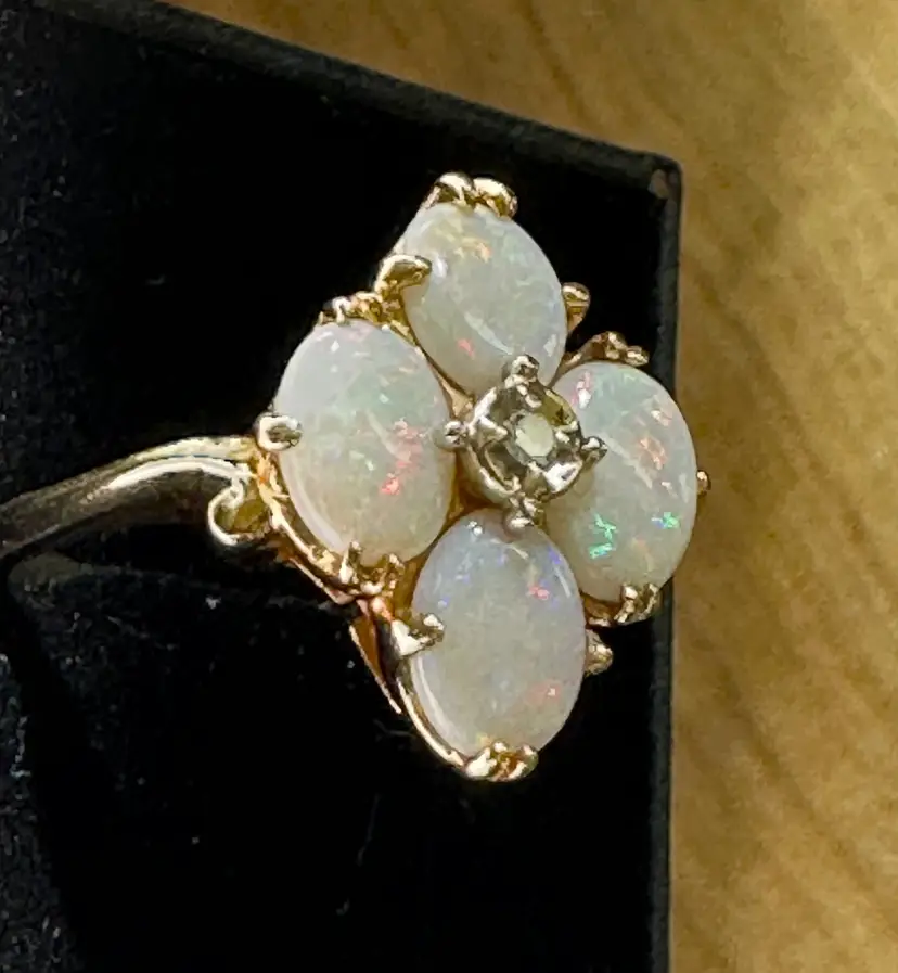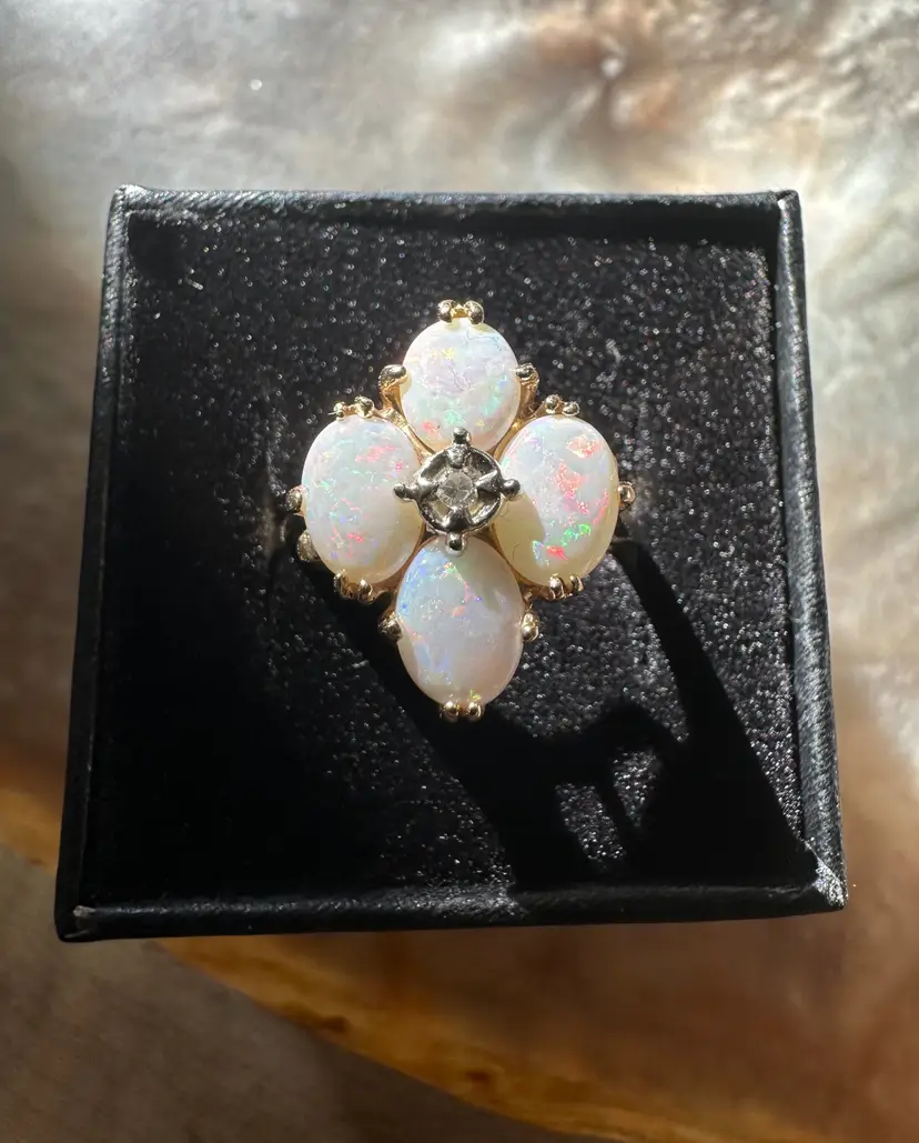 Beautiful vintage Opal Diamond ring. These natural opals are perfection with so much flash and play of color. Reds, greens, blues. Beautiful, with no cracks, crazing or issues. The diamond is the perfect accent to this stunning ring