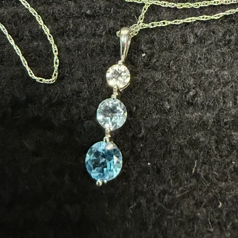 This stunning pendant features three beautiful blue topaz stones set in 925 sterling silver. The pendant comes with an 18-inch chain with a spring ring closure, making it easy to wear and versatile for any outfit. The elegant design and vibrant blue topaz stones add a touch of beauty to any ensemble, making it a perfect accessory for any occasion.