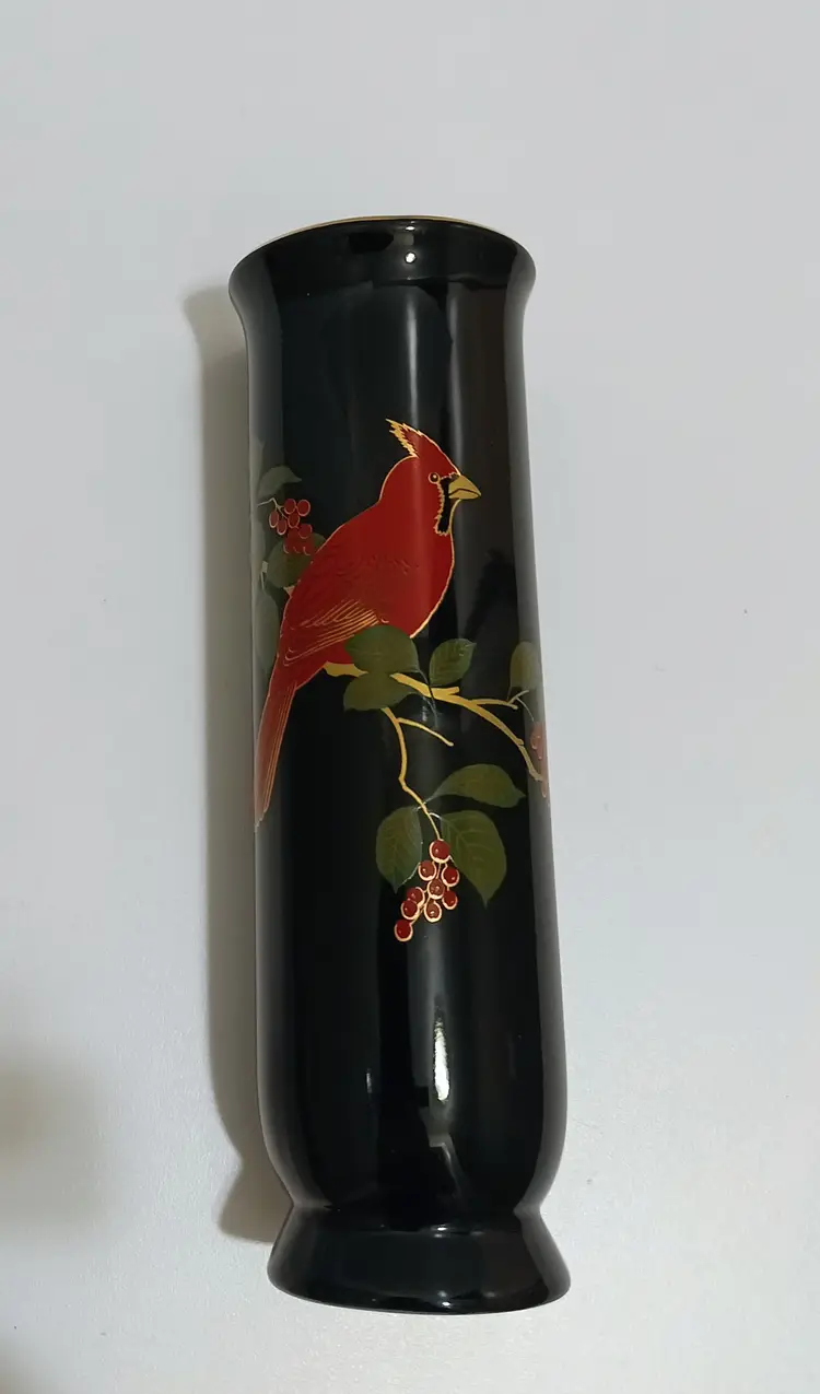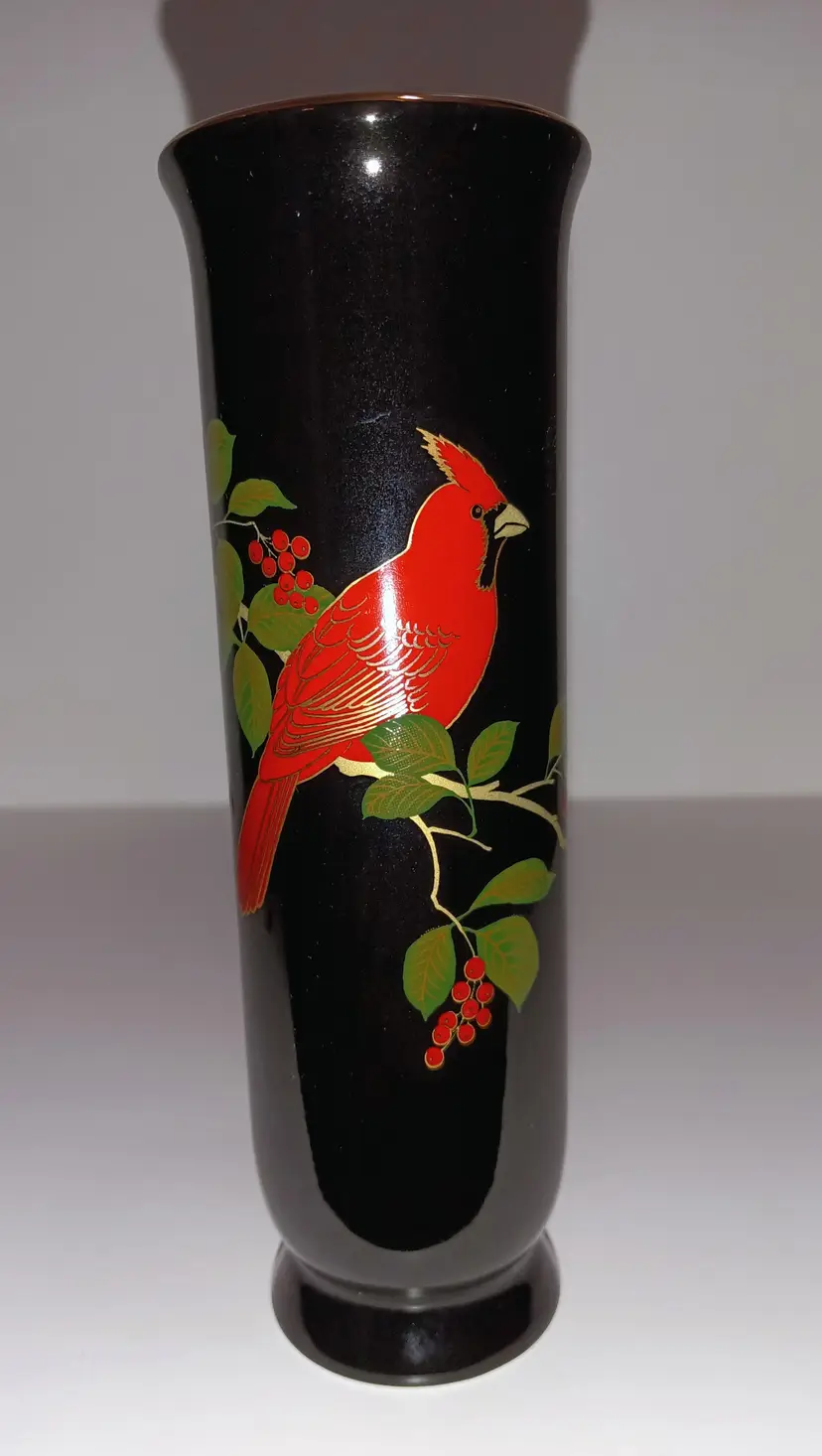 VTG Stunning Black Vase by Otagiri, Japan. Gorgeous Cardinal on a Branch of Berries Outlined in Gold! Excellent Condition! No Chips , Cracks or Scratches! 7" T x 2" W; Charming!