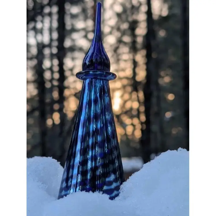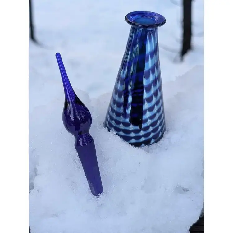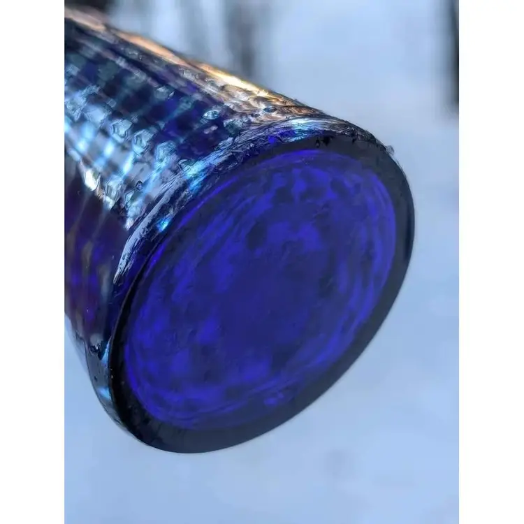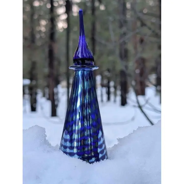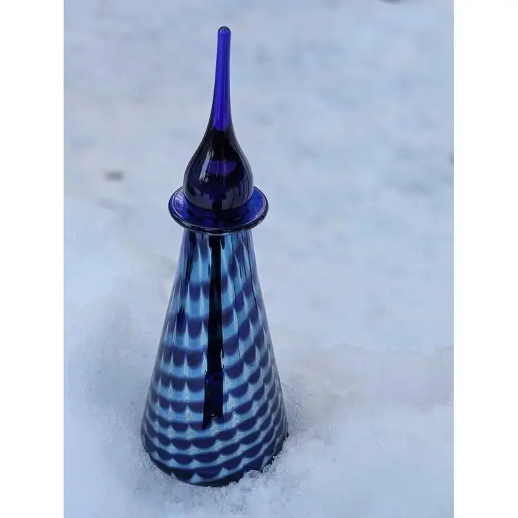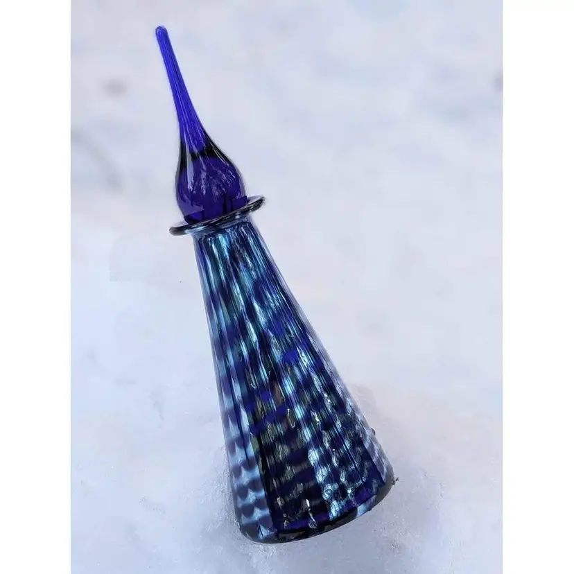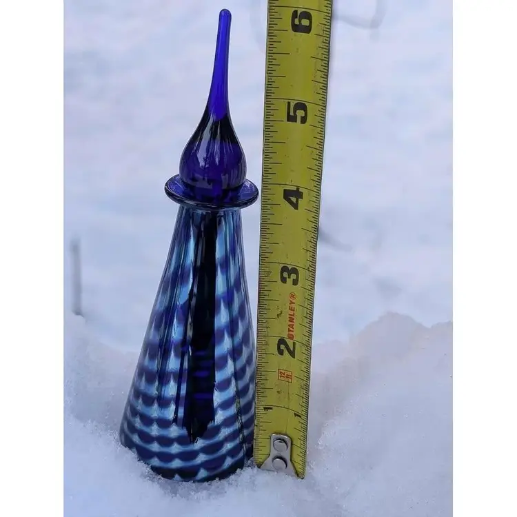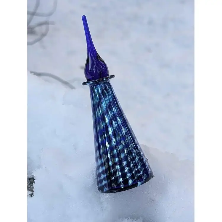 Stunning hand blown iridescent cobalt blue perfume bottle with stopper. This perfume bottle would make a gorgeous addition to any collection. It is in excellent condition and has a beautiful pattern throughout with iridescent accents. The deep cobalt blue color is throughout the piece and the stopper is solid cobalt. Excellent condition free of any imperfections - this stands just under 6" tall with the stopper on it. This piece isn't signed but looks very much like Steven Correia's work!