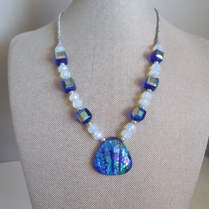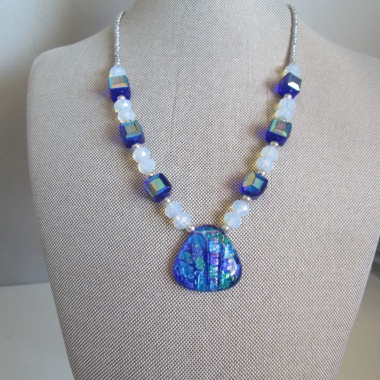 Stunning iridescent blue pendant necklace with Czech glass beads. The necklace measures 19" to 20". This is an upcycle design made with vintage beads.