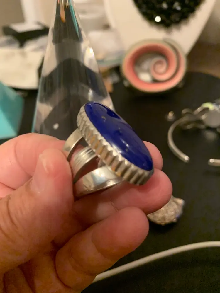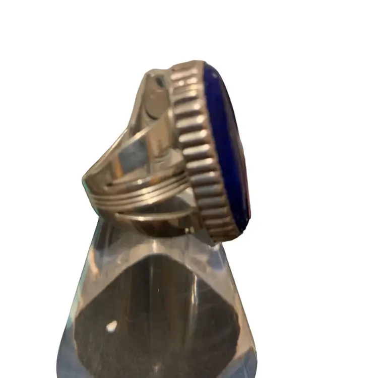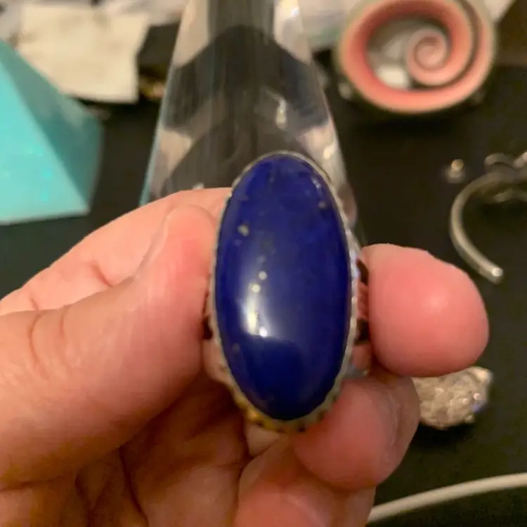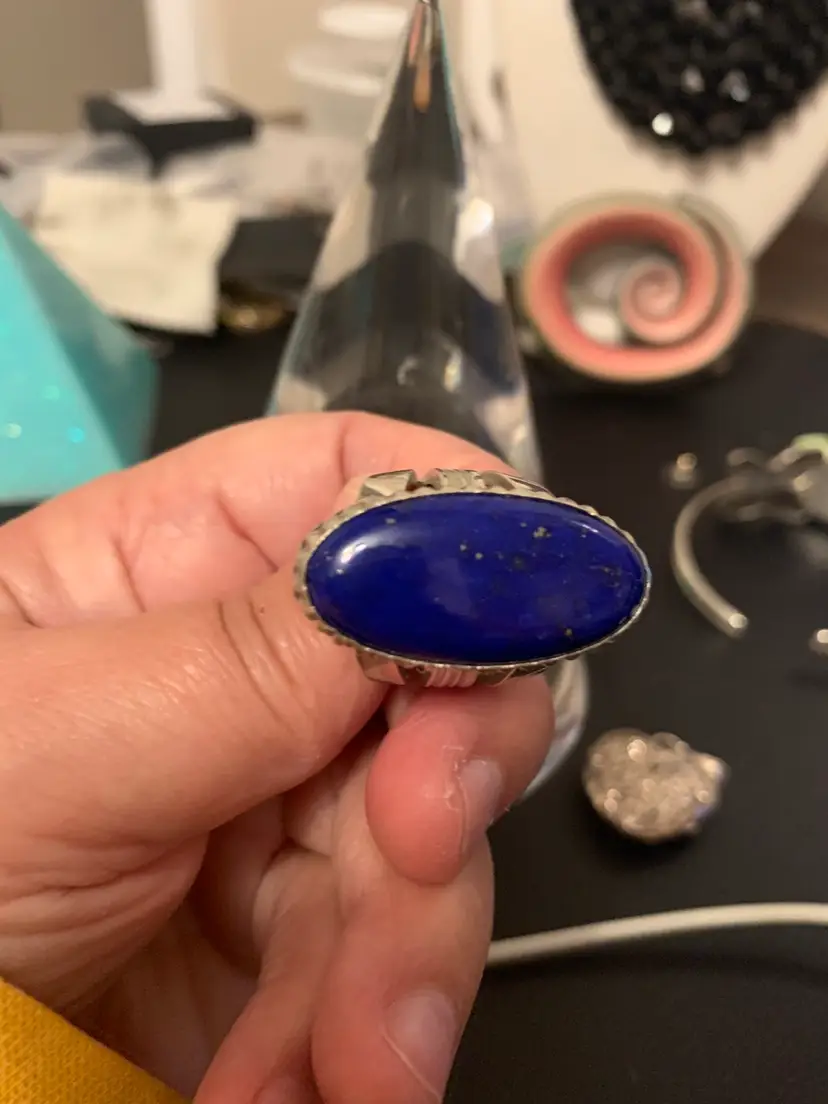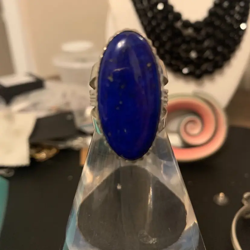 This ring is amazing and I would be keeping it if it fit me. It is a size 8 The vibrant blue stone has wonderful gold flecks The Sterling setting is substantial. Solid back and nice shank Made by Nez and marked in the back Excellent like new condition