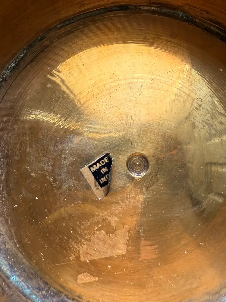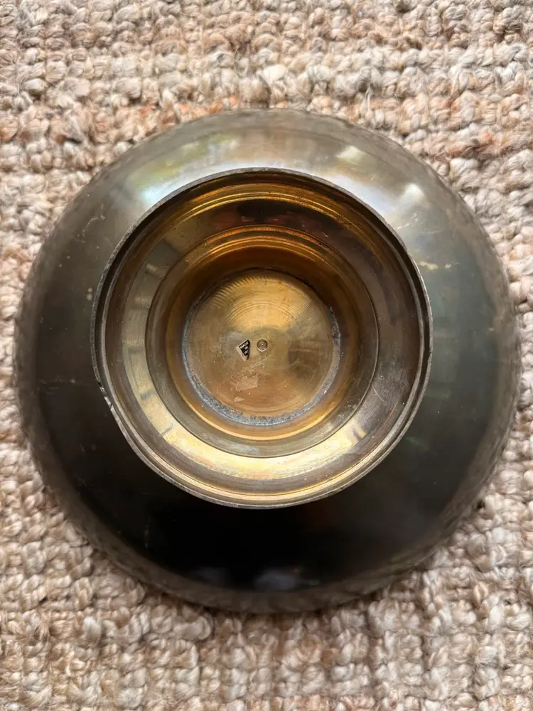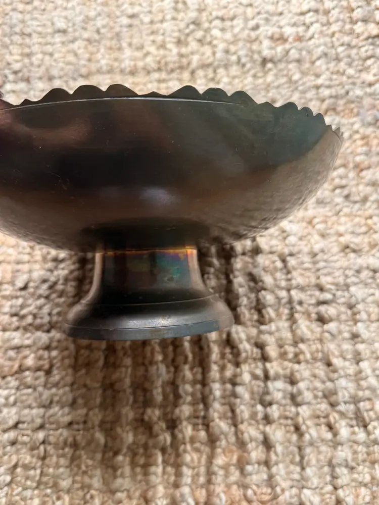 Details: • Marked Made in India on the base • Solid brass • Measures approx. 12” in diameter and 5” tall • Weight: 1380 grams • Gorgeous patina throughout