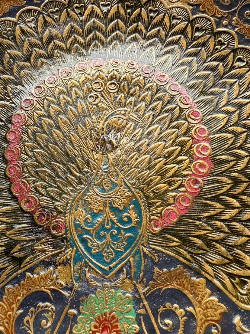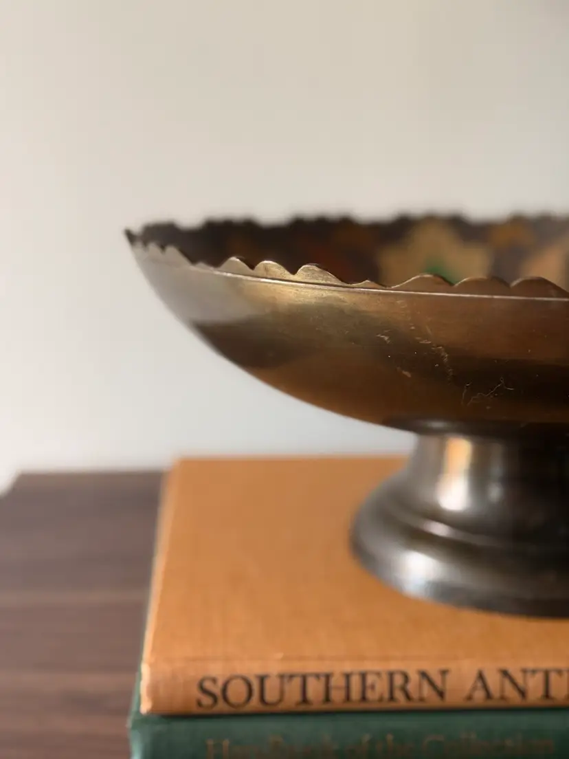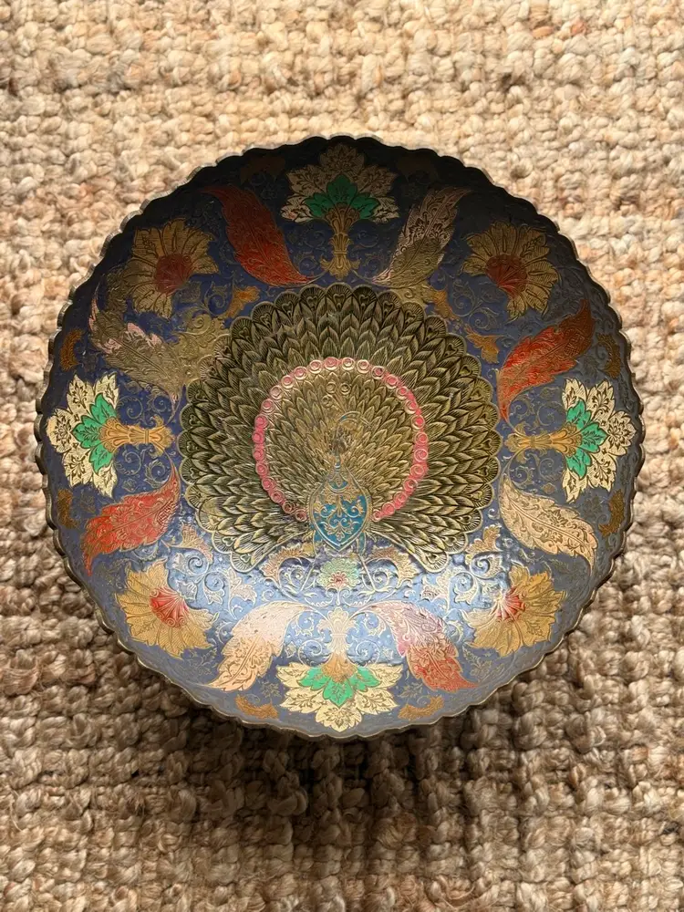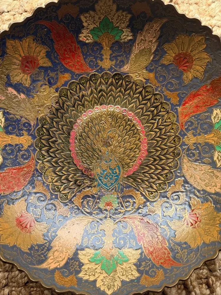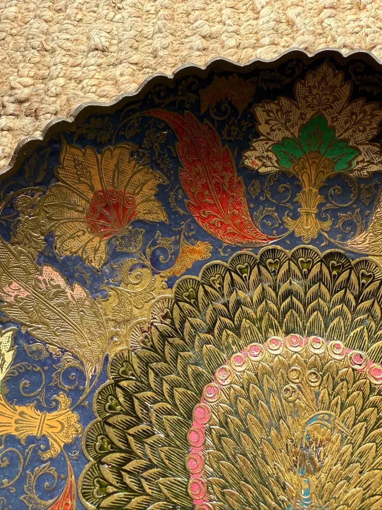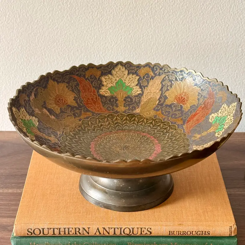 Beautiful, large hand-etched brass pedestal bowl featuring an ornate peacock motif with vibrant enamel accents in gold, red, green, and blue. The scalloped rim and intricate detailing make this a standout display piece for collectors of Indian brass, boho décor lovers, or anyone wanting a striking centerpiece.