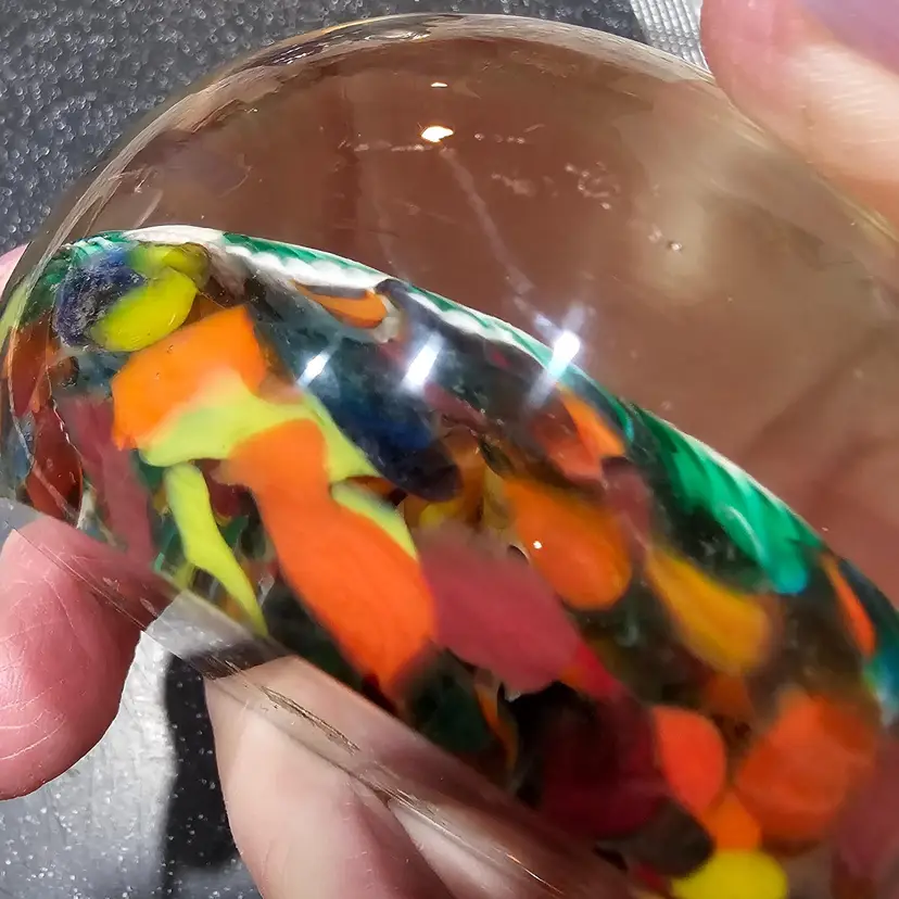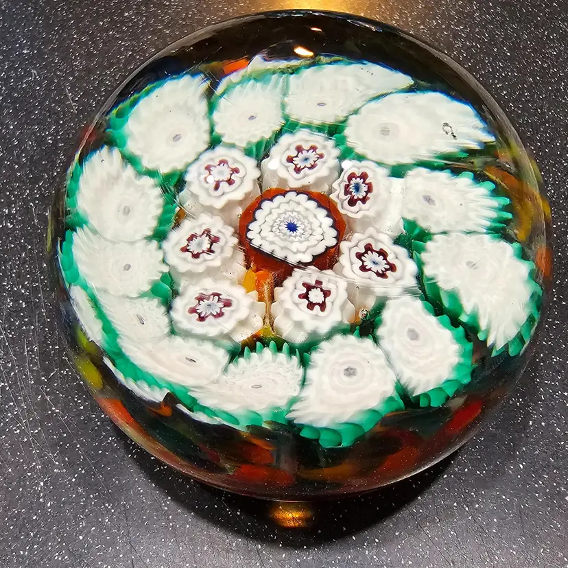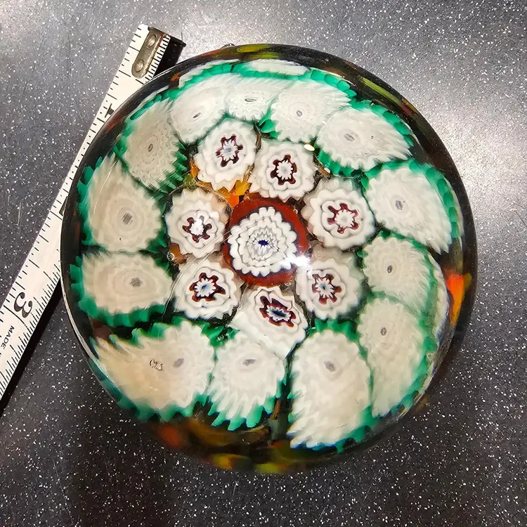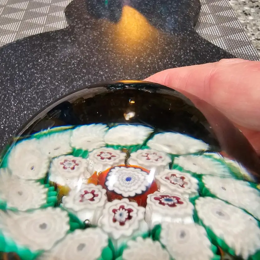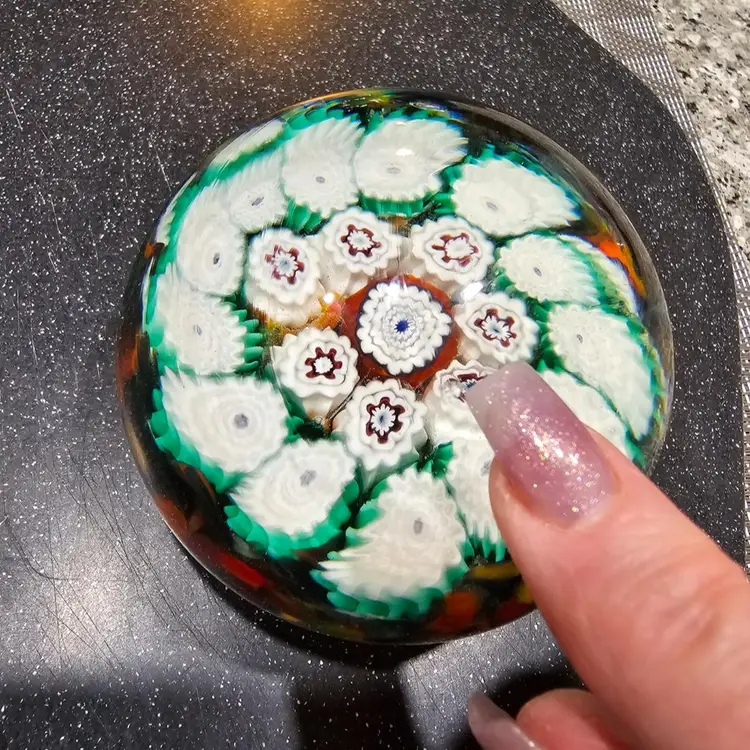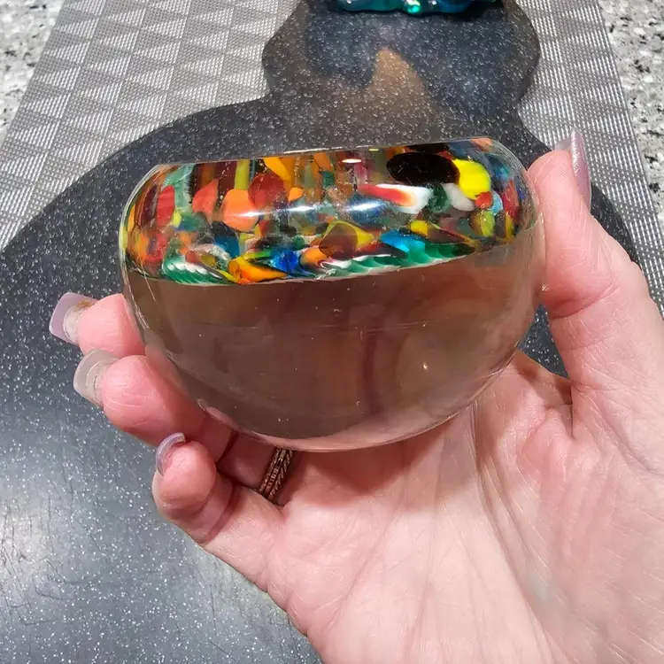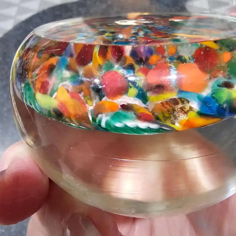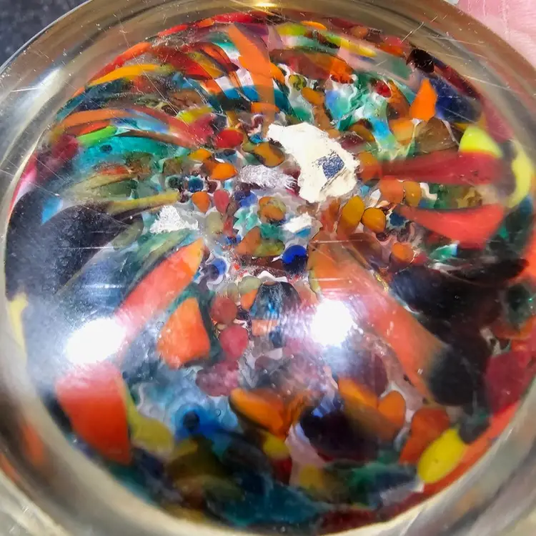 Sold to me as Murano. Only remnants of original sticker. Bottom is polished smooth with minor scratching. There is a bruise on arch. See pic. Hard to pic as it is very small. Some tiny scratches on side...which may come off as they feel kind of raised but leaving that for buyer. Sold to me as antique but may be only vintage. Beautiful colors and I love how the layers seem to be floating. :) No signatures.