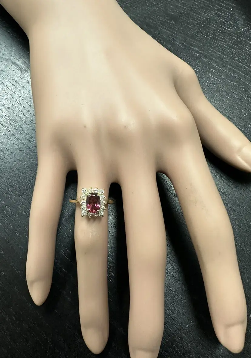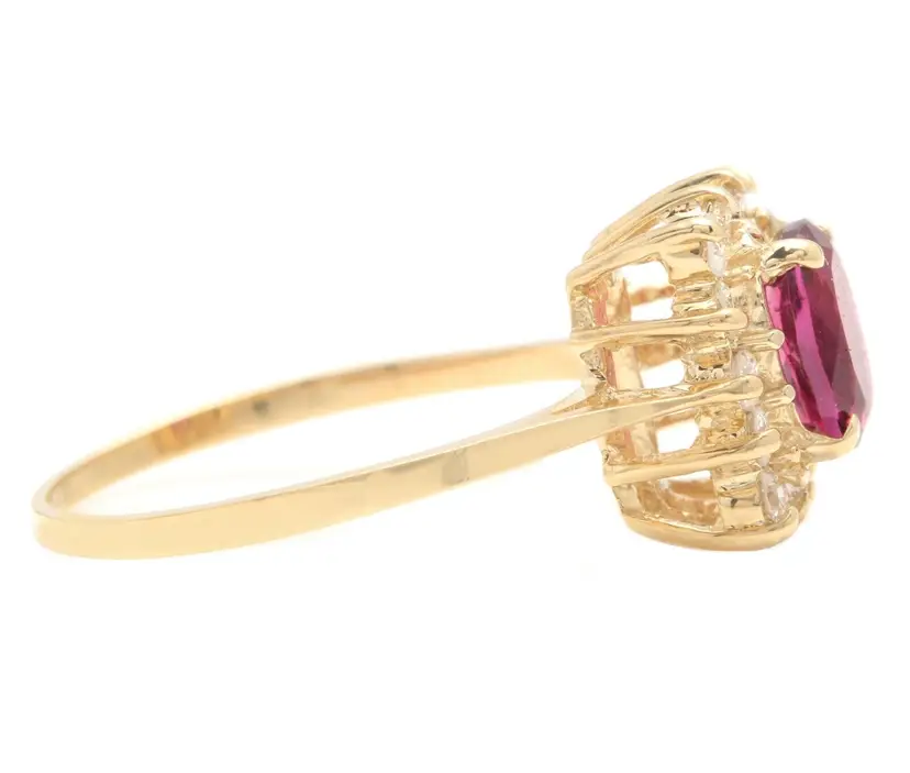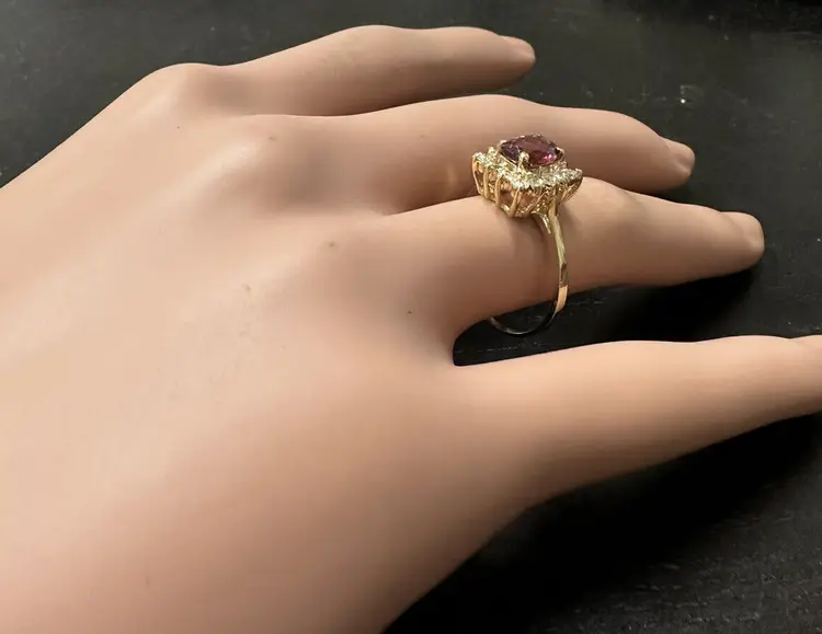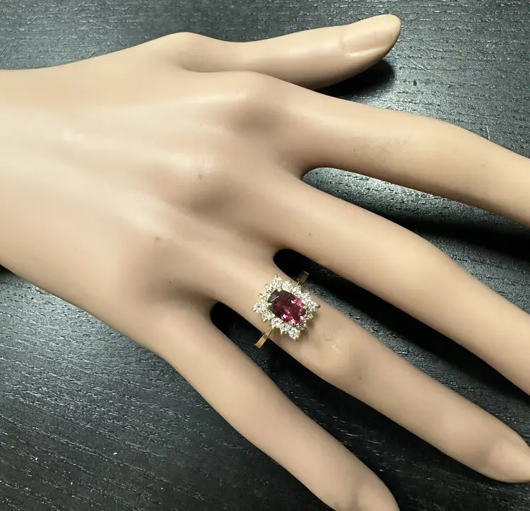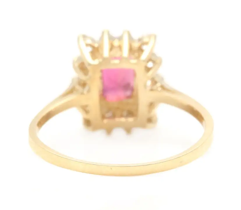 Main Stone Creation: Natural Sizable: Yes Main Stone Color: Pinkish Red Metal: Yellow Gold Secondary Stone: Tourmaline Main Stone: Tourmaline Ring Size: 7 Brand: Unbranded Main Stone Treatment: Heating Type: Ring Metal Purity: 14k Main Stone Shape: Cushion Theme: Nature Total Carat Weight (TCW): 0.75