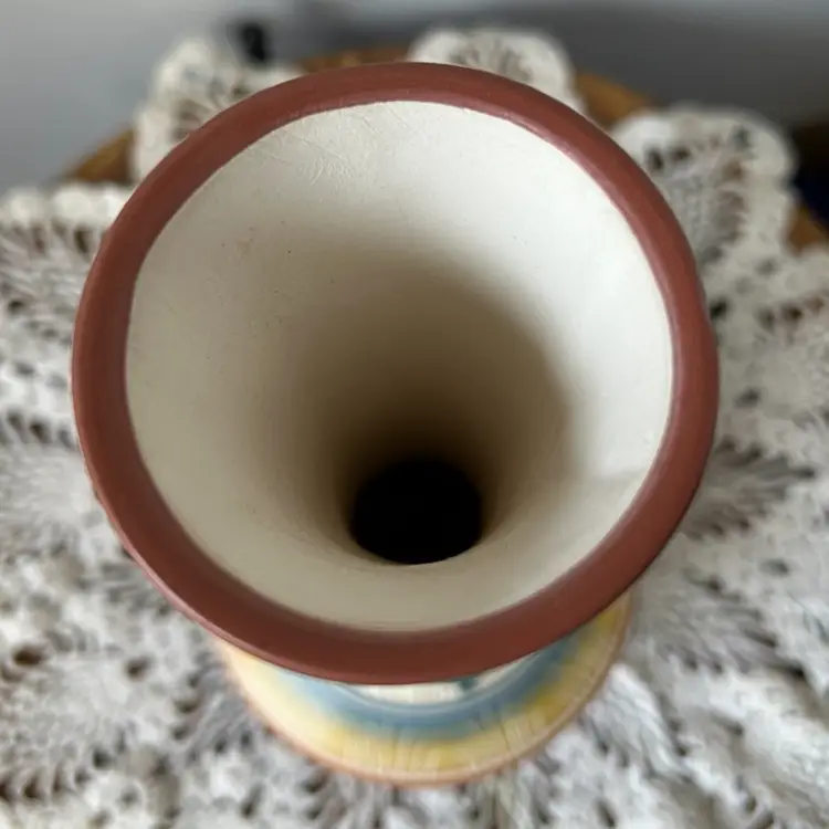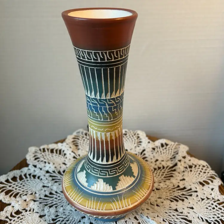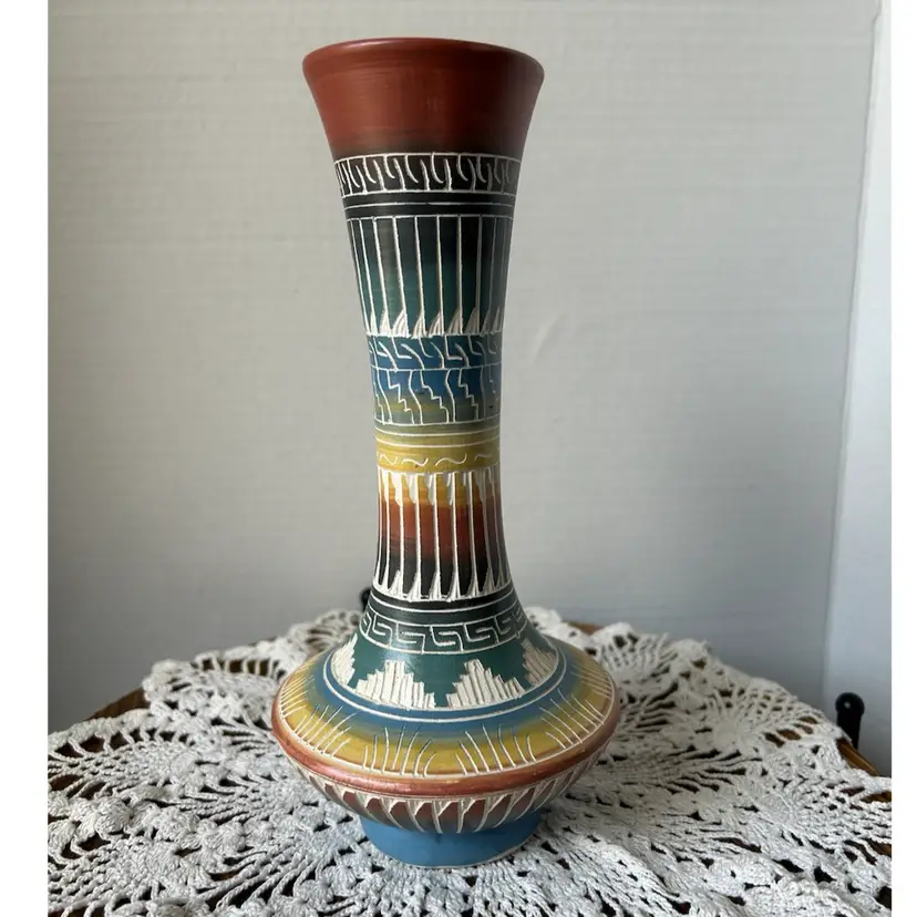 Beautiful Native American pottery vase was hand etched, hand thrown, and painted by V. King. It’s in excellent condition. Colors are vibrant.. dark turquoise, dark yellow, and brownish coral. Stands 9” tall by 4.5” at its widest. Believe to be from the 1990’s.