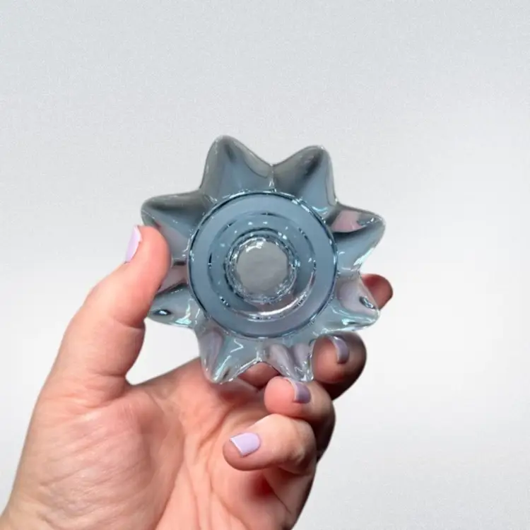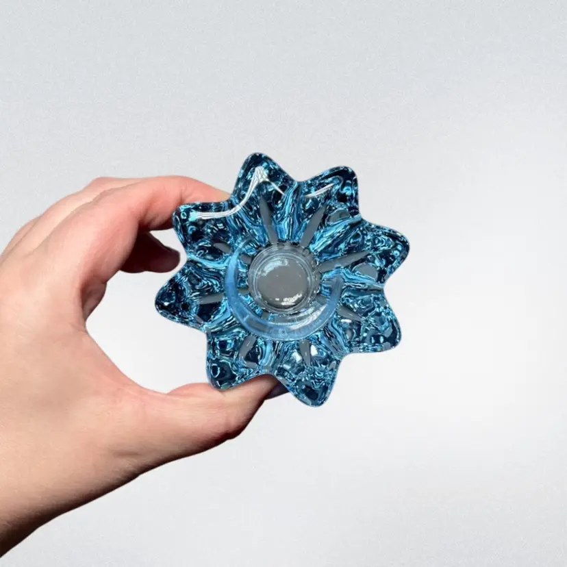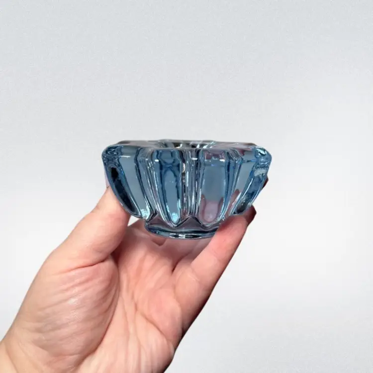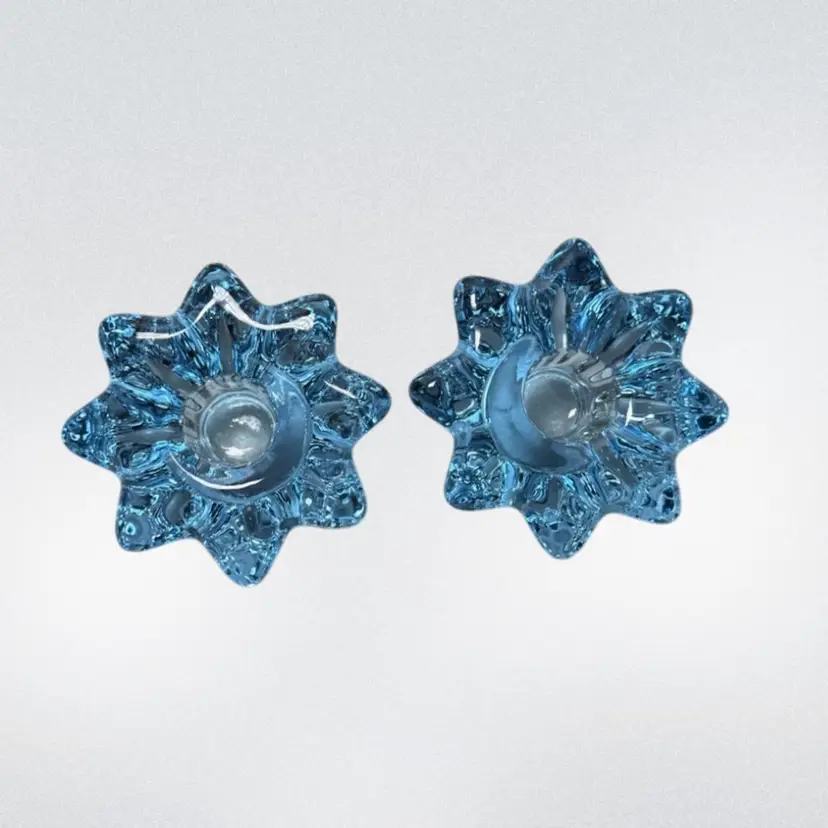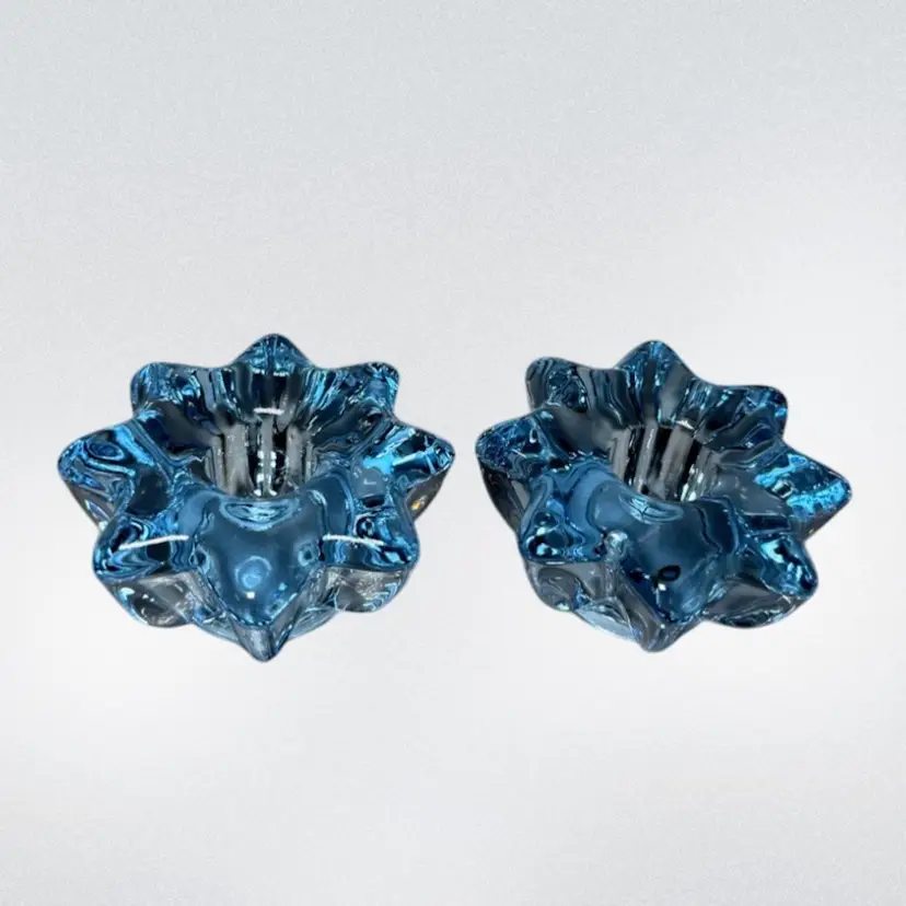 A beautiful pair of light blue crystal candle holders in a fun flower shape. Likely Scandinavian from the 1970’s. They are in great condition- no chips or cracks. Approximately 1.75in tall, 3.25in wide.