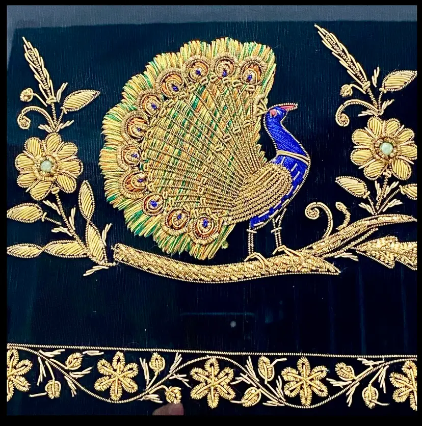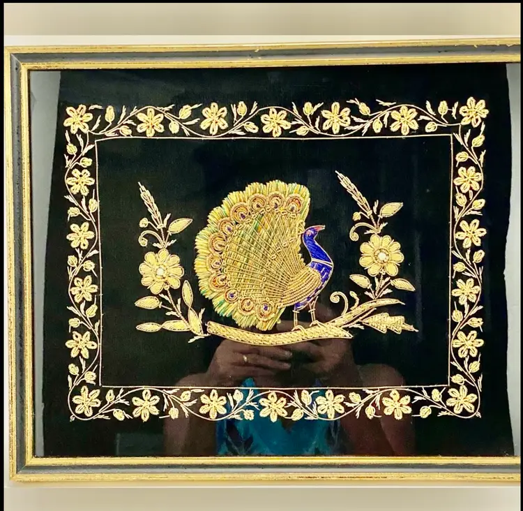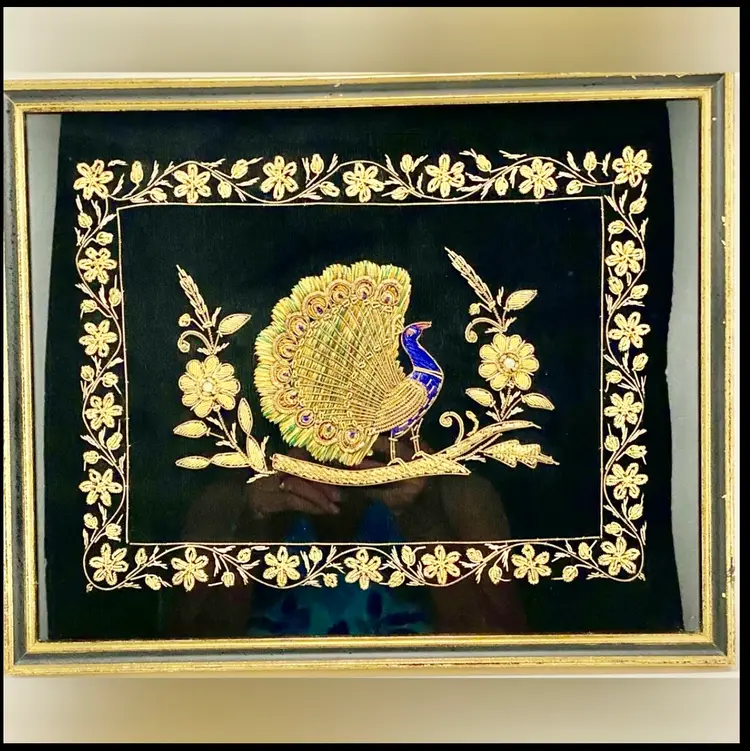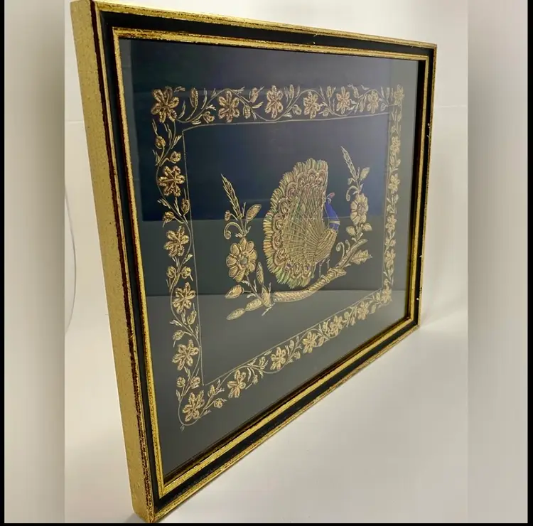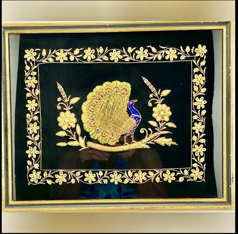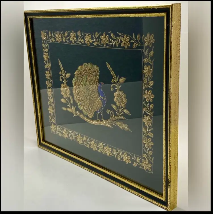 ✅ This Stunning Shimmering 100% Handcrafted Timeless Work of Ancient Art Known as Zardozi, Sarmadozi, Resham, Zari Work. Elegant Lightweight Framed Wall Hanging. Expertly Hand-Embroidered on Black Velvet by Highly Skilled Zardozi Artisans using Silk, Metallic Gold Threads called Zardozi, and Genuine Semi-Precious Stones. This Wall Art Hanging Design has a Beautiful Colorful Blue Peacock with Gold Floral. Truly a Work of Art!… This Unique 3D Luxury Effect Measures Framed 14 1/2” Wide and 11 3/4” High and is in Excellent Mint Condition!… It is a Great Piece of Work for Giving Any Home a Royal Look!... Makes an Extraordinary Gift for Anyone who Loves Peacocks, Birds or Embroidery!… It is Most Certain to Become a Modern Heirloom!…