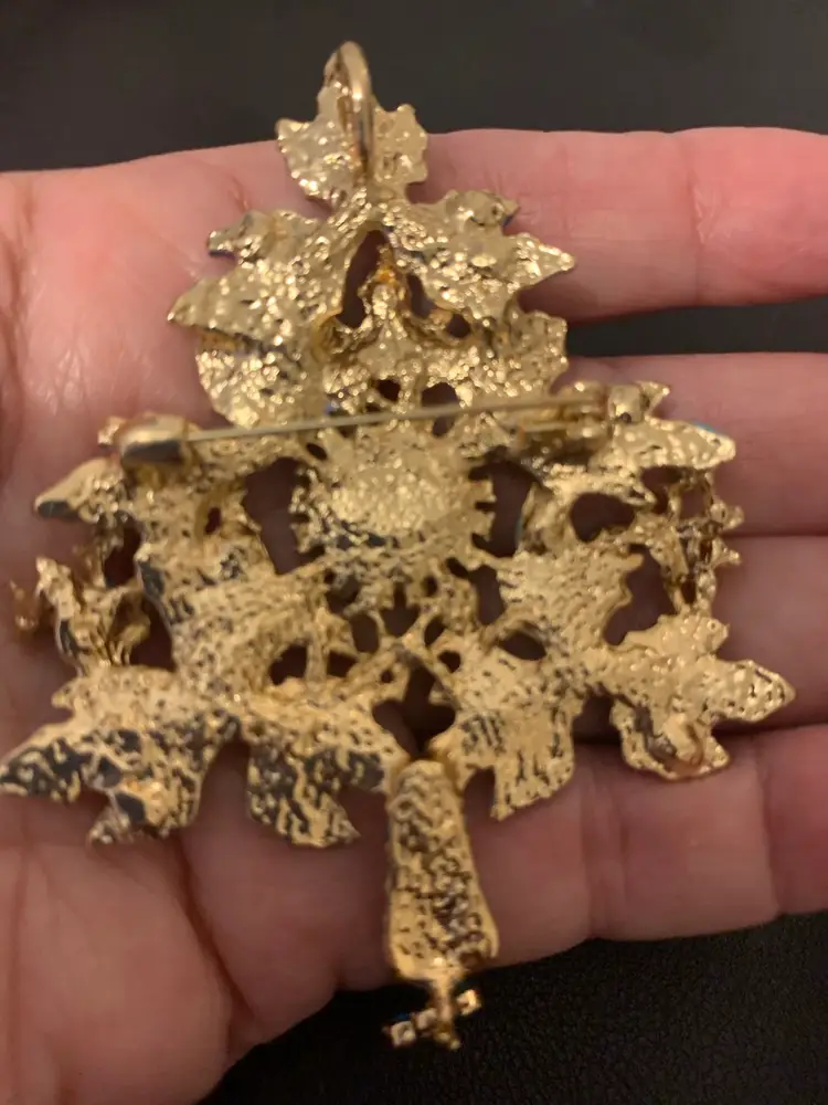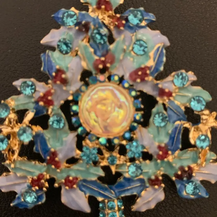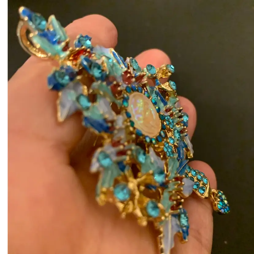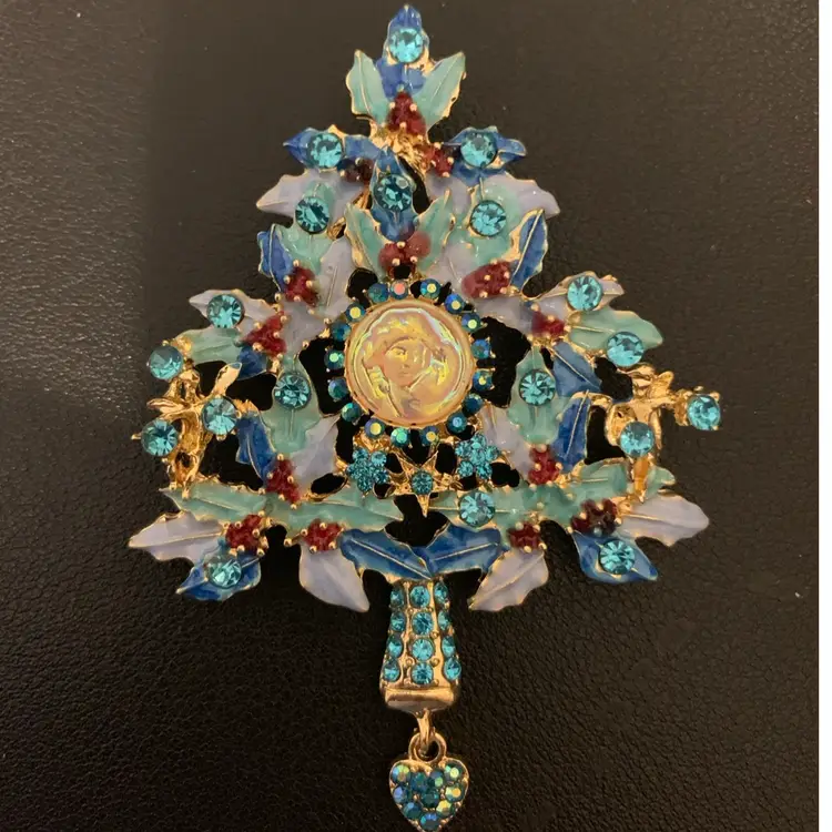 Absolutely gorgeous! The main colors are three different colors of blue Accented with red rhinestones The center is a woman’s face and appears to be mother of Pearl Small dangle heart at the bottom with blue rhinestones Gold tone metal. Excellent condition Measures 3 in from top to bottom of heart and 2 in wide at its widest point
