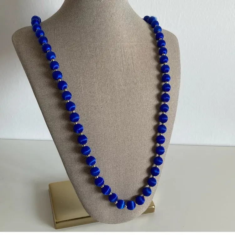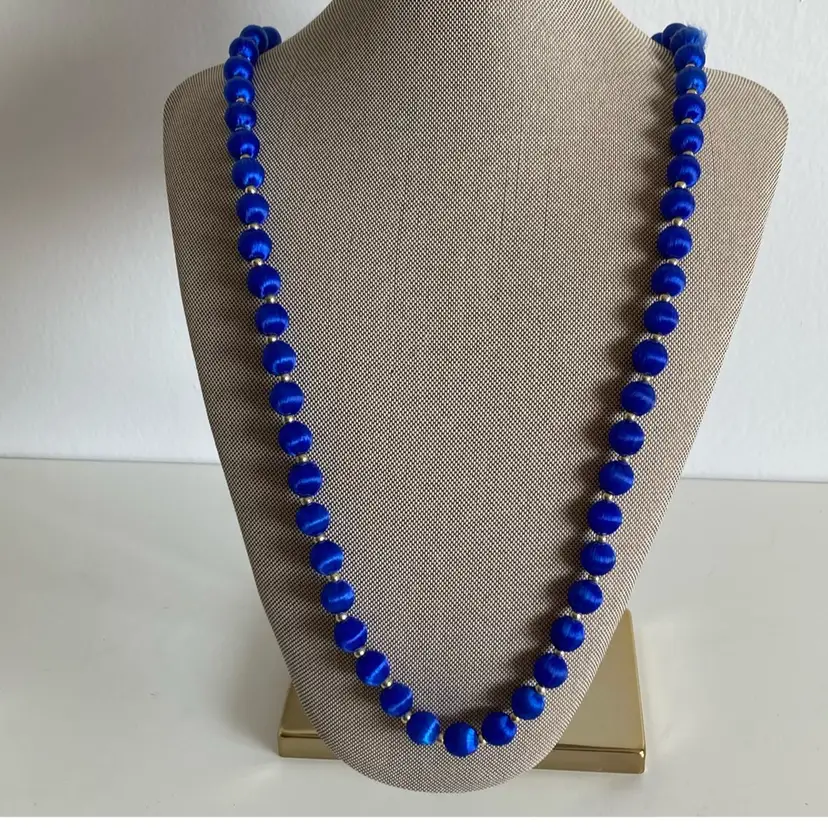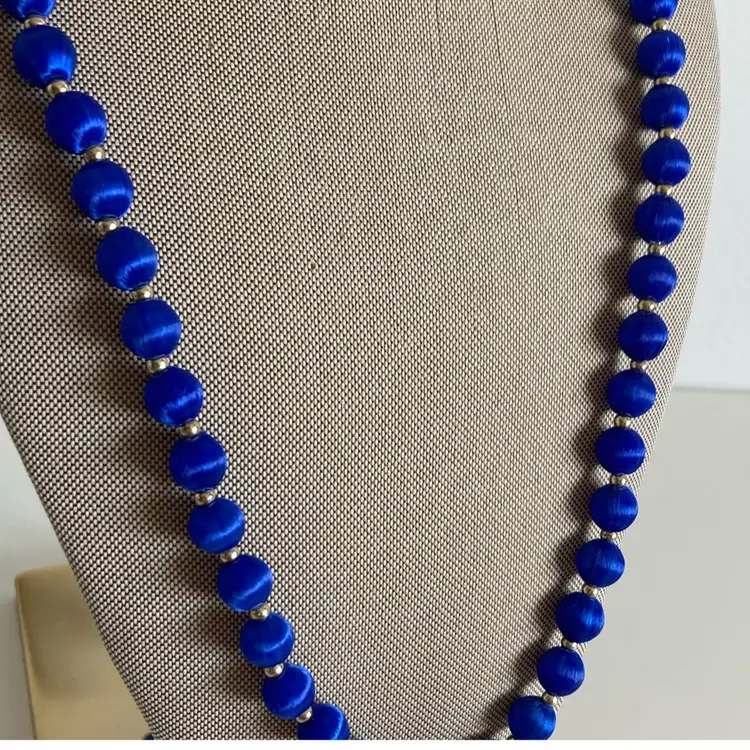 Stunning vintage blue silk covered beaded necklace. Length measures 30”. There is one bead that is slightly fuzzy, but you can place that section in the back.