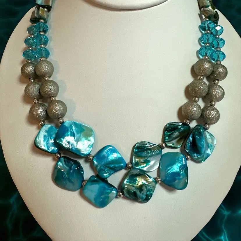 Stunning Vintage double strand, blue mother of pearl, sugar, beads, and rhinestone necklace. Adjustable length 18 to 21 inches. Lobster clasp.