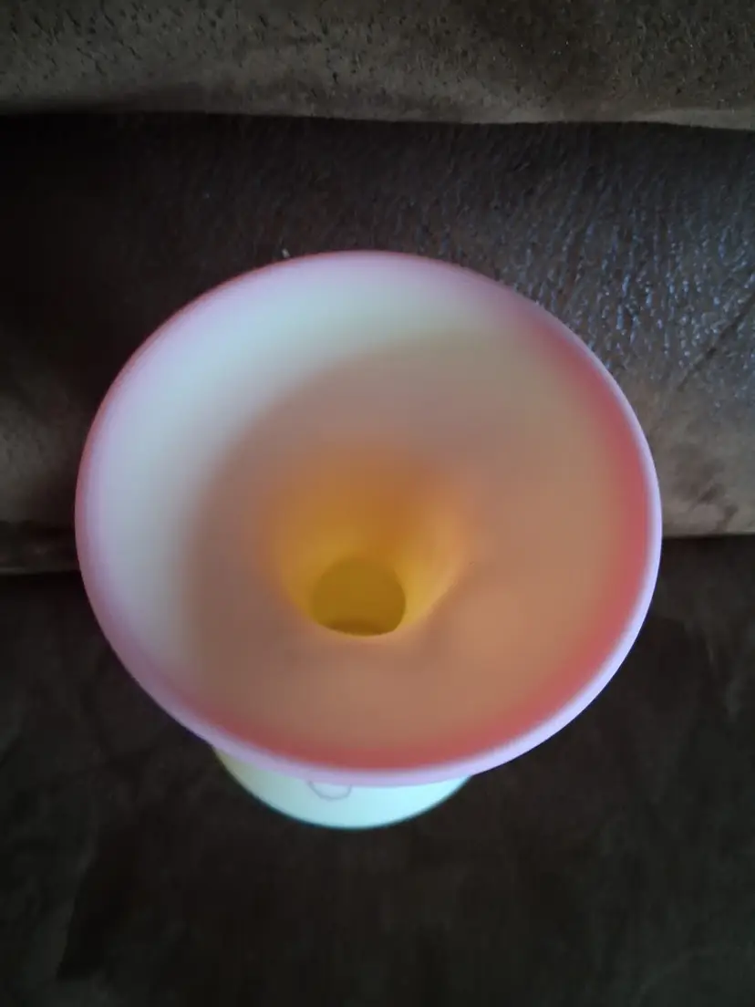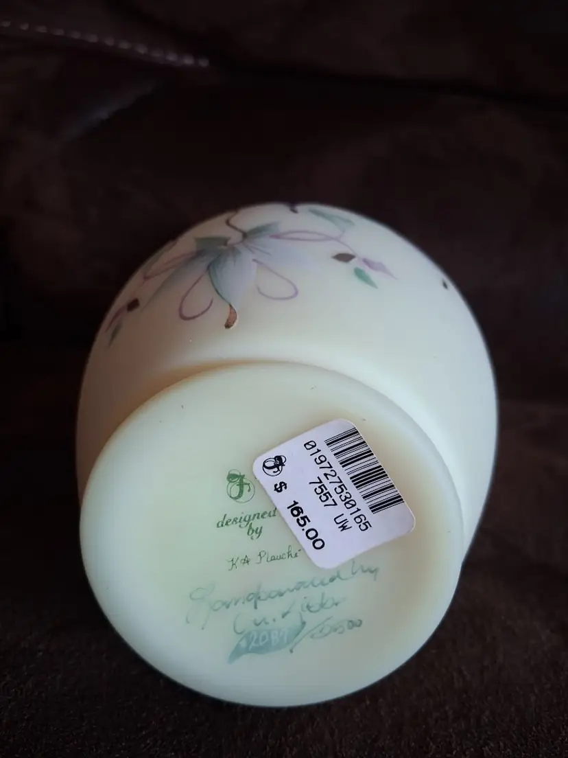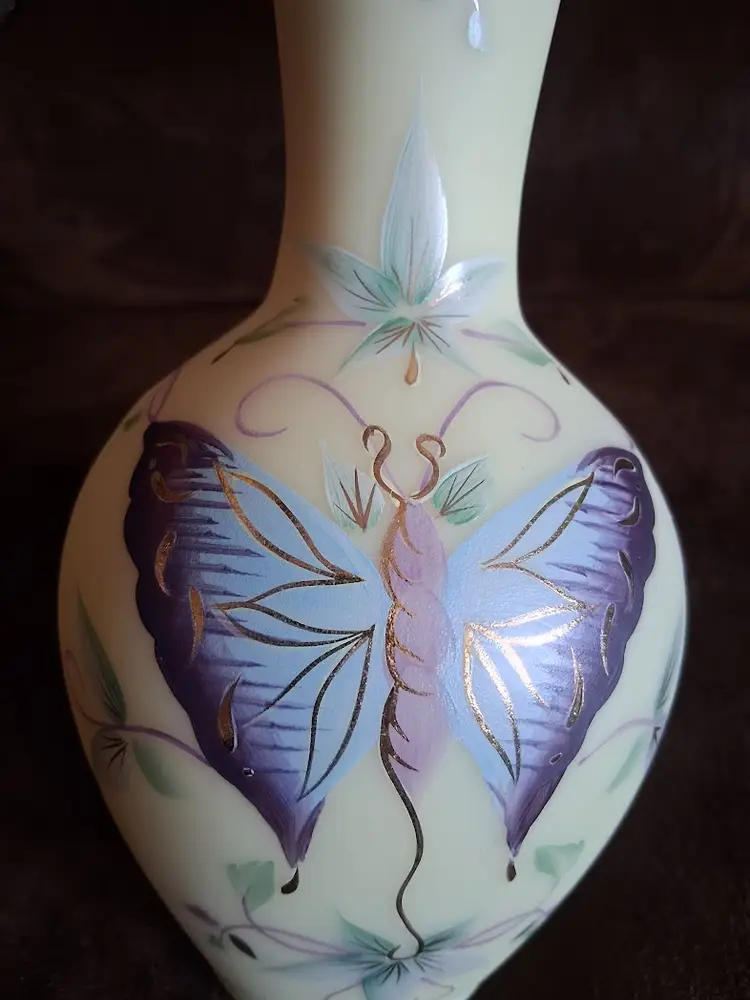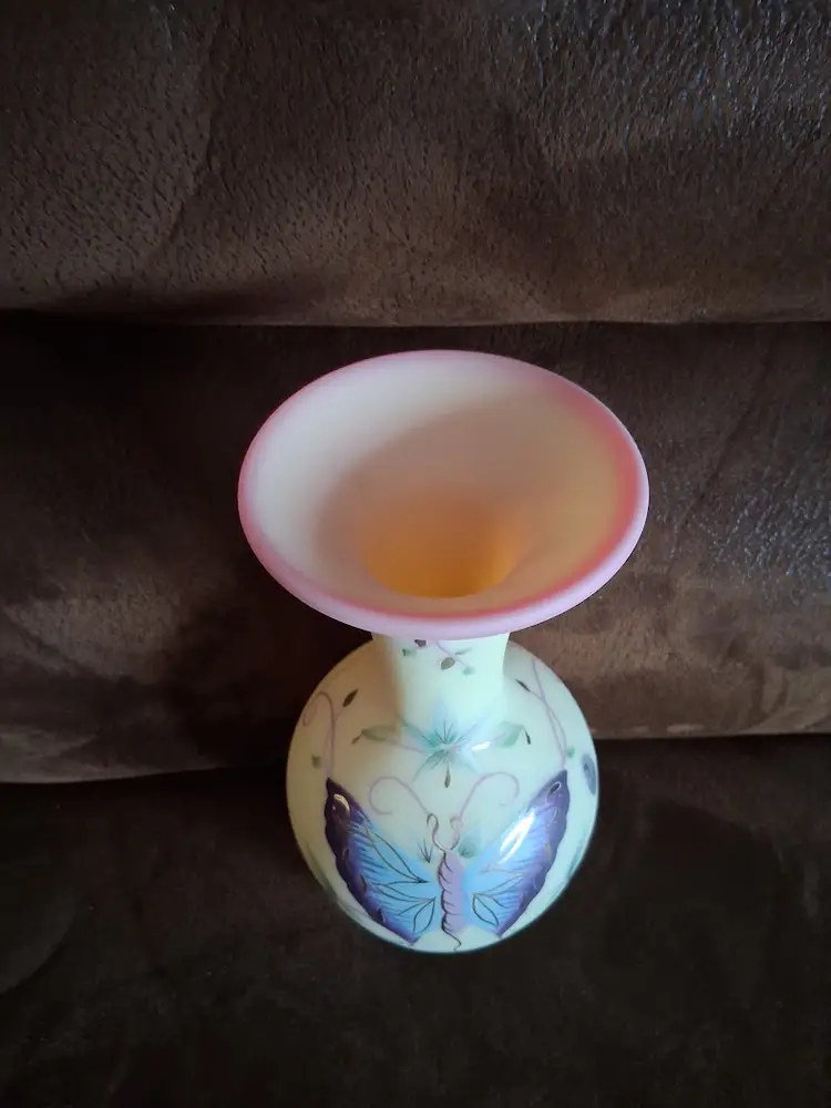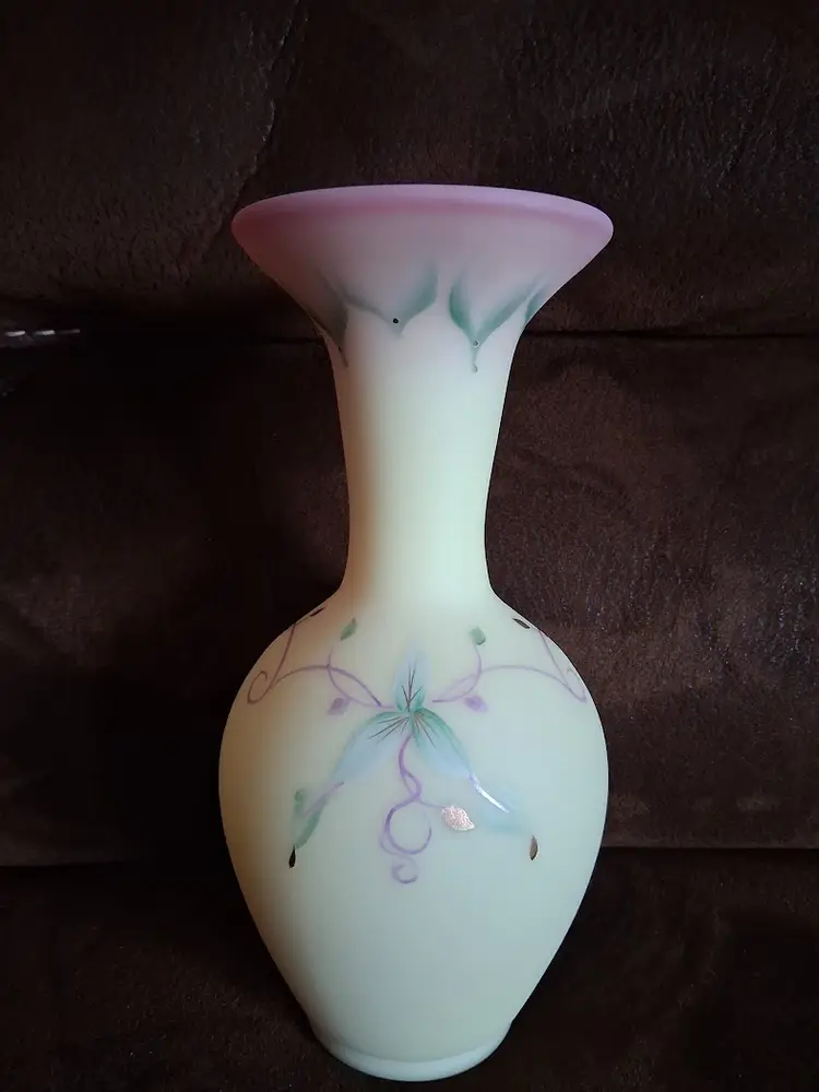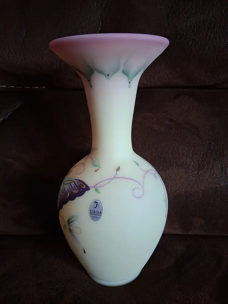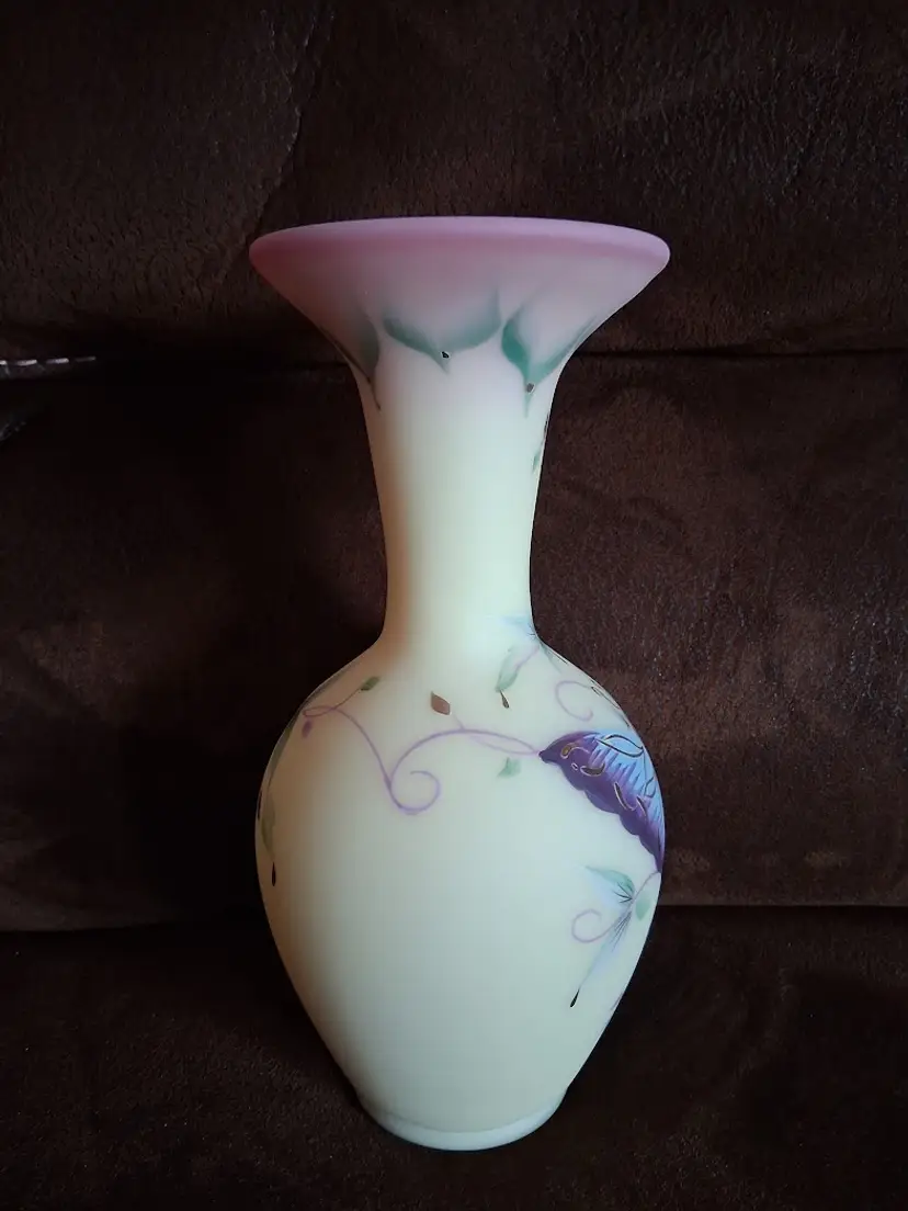 LE/Limited Edition (Only 2500 were made) Hand-Painted by Fenton Artist M. Kibbe (Michelle Kibbe) Designed by KA Plauche. 2087/2500. GORGEOUS UV REACTIVE BURMESE GLASS!! 10.0" TALL BY 4.5" DIAMETER @ WIDEST. LIKE NEW!!!