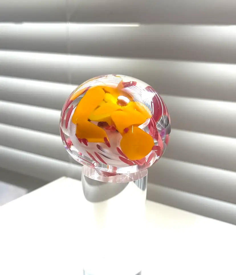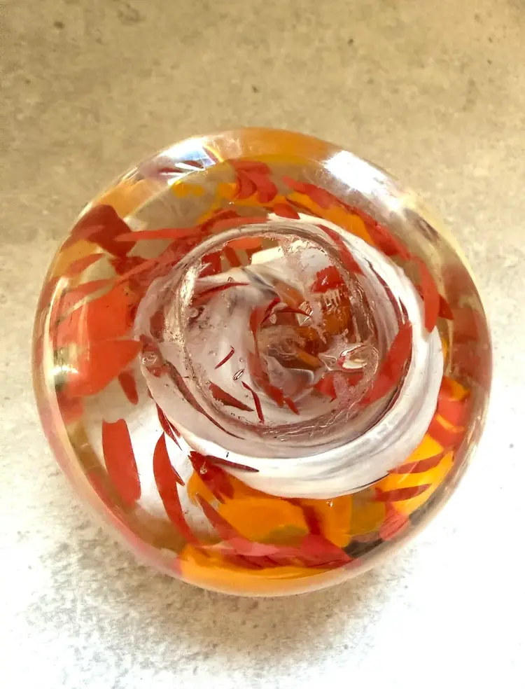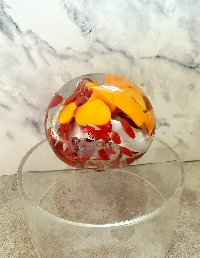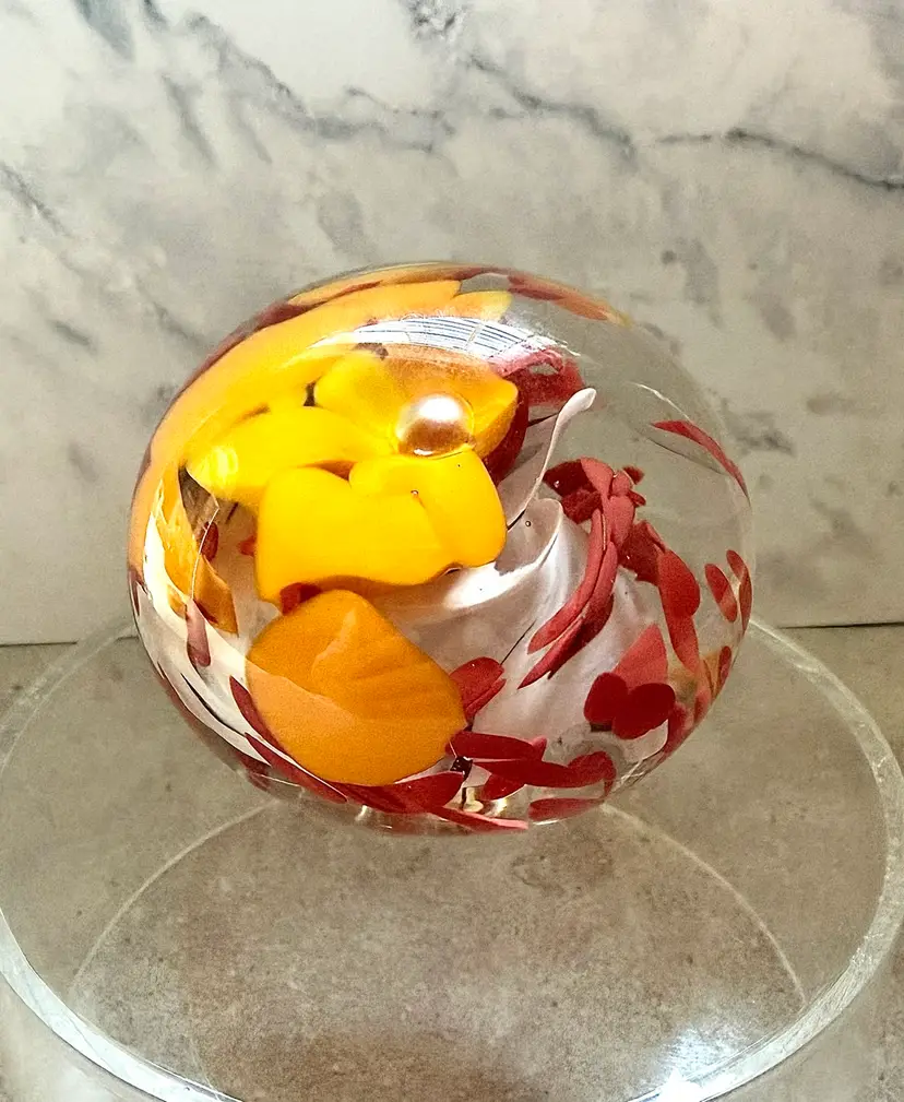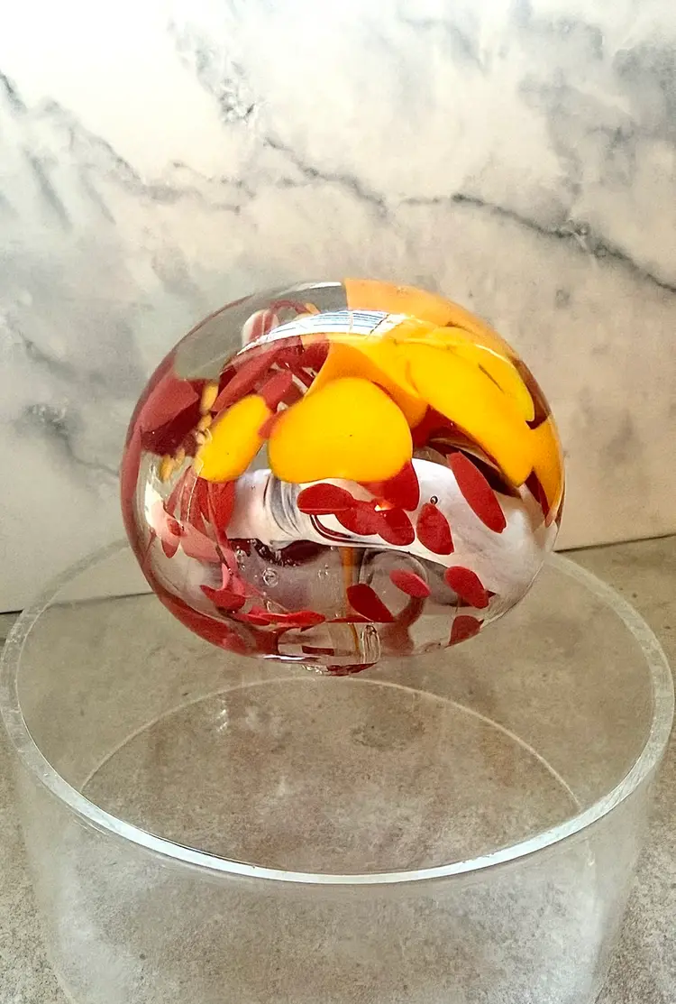 This stunning crystal clear paperweight w/red & yellow floral swirling would make a beautiful statement piece on any shelf or to any collection of art glass! EUC, no chips or cracks. 3”x3”
