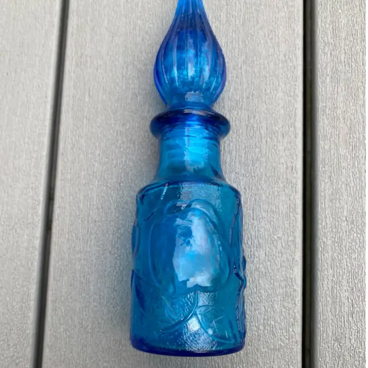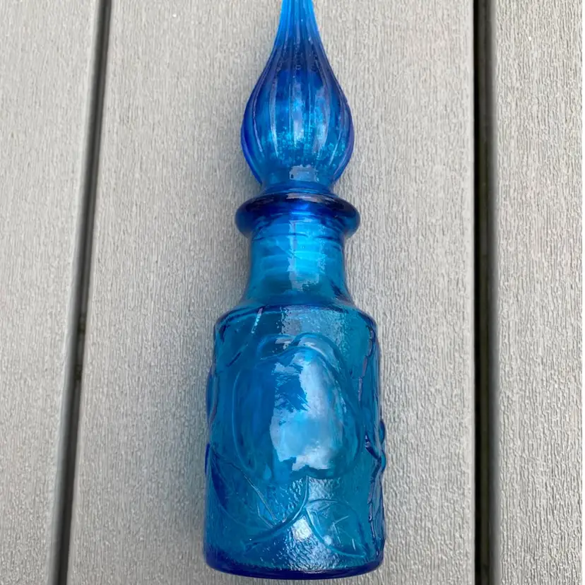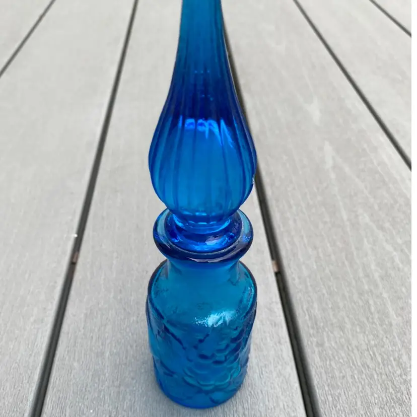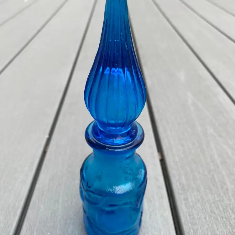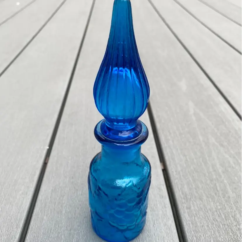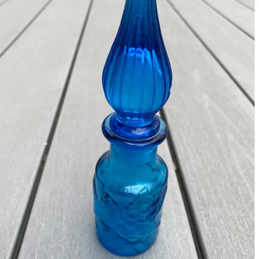 This is a stunning hard to find vintage ROYAL BLUE EMPOLI GENIE BOTTLE WITH STOPPER. The base has fruit pattern consisting of an apple, a pear and grapes.It measures 7-1/2” tall and 2” in diameter. It is in excellent vintage condition with no chips or scratches. This rare and unusual genie bottle would be a gorgeous piece to display in any home.