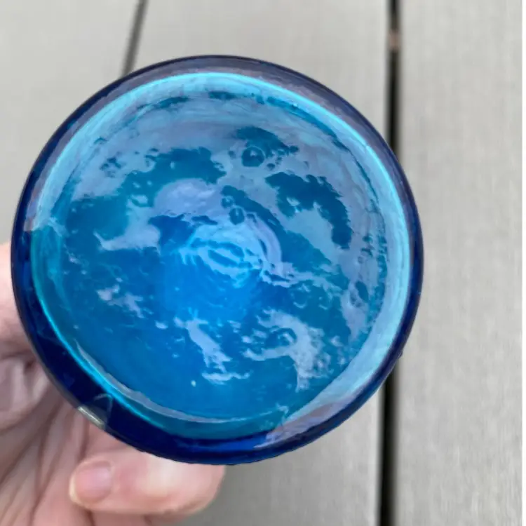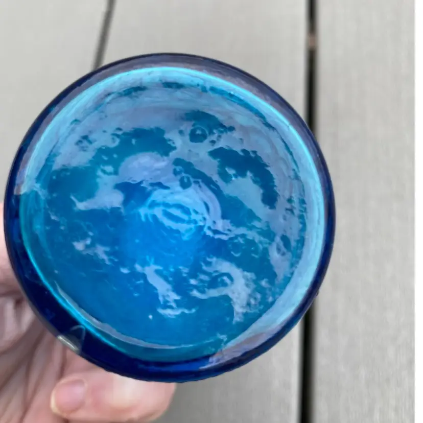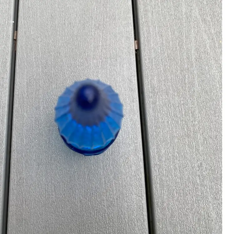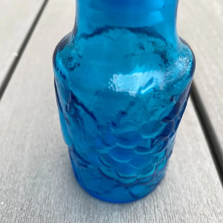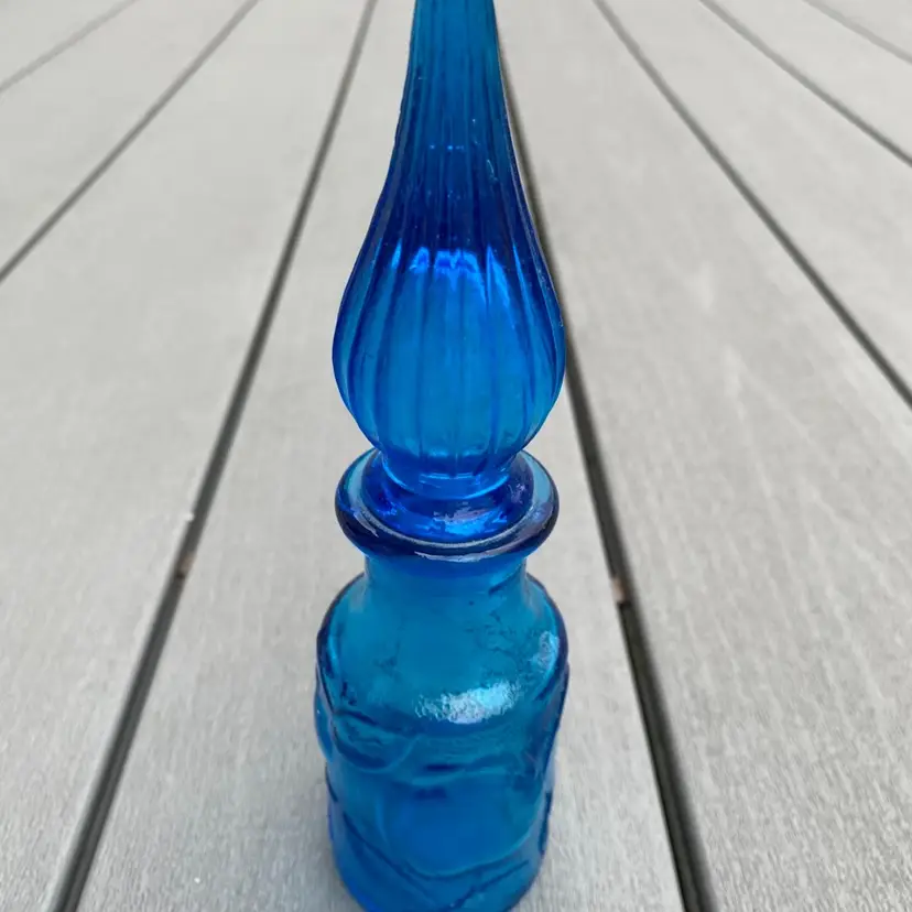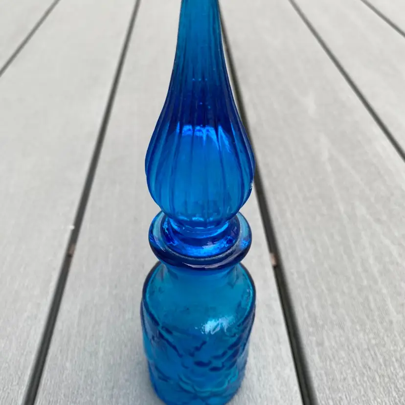This is a stunning hard to find vintage ROYAL BLUE EMPOLI GENIE BOTTLE WITH STOPPER. The base has fruit pattern consisting of an apple, a pear and grapes.It measures 7-1/2” tall and 2” in diameter. It is in excellent vintage condition with no chips or scratches. This rare and unusual genie bottle would be a gorgeous piece to display in any home.