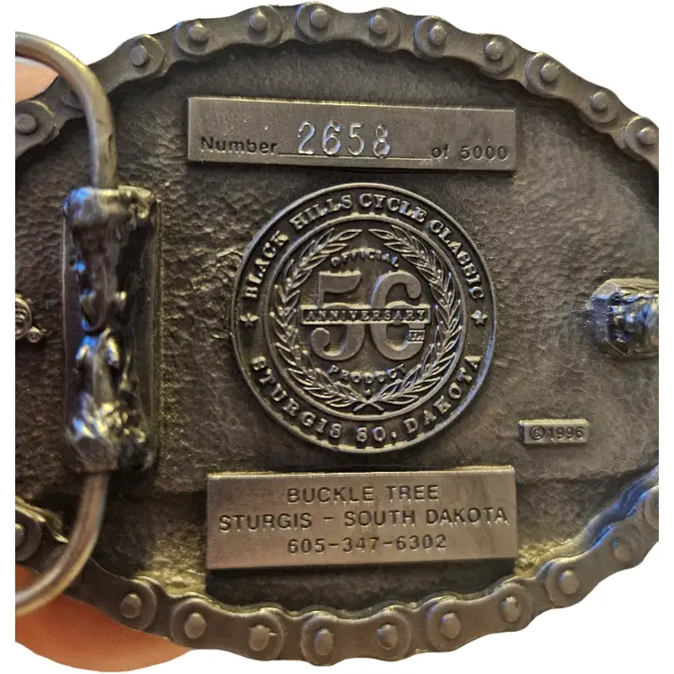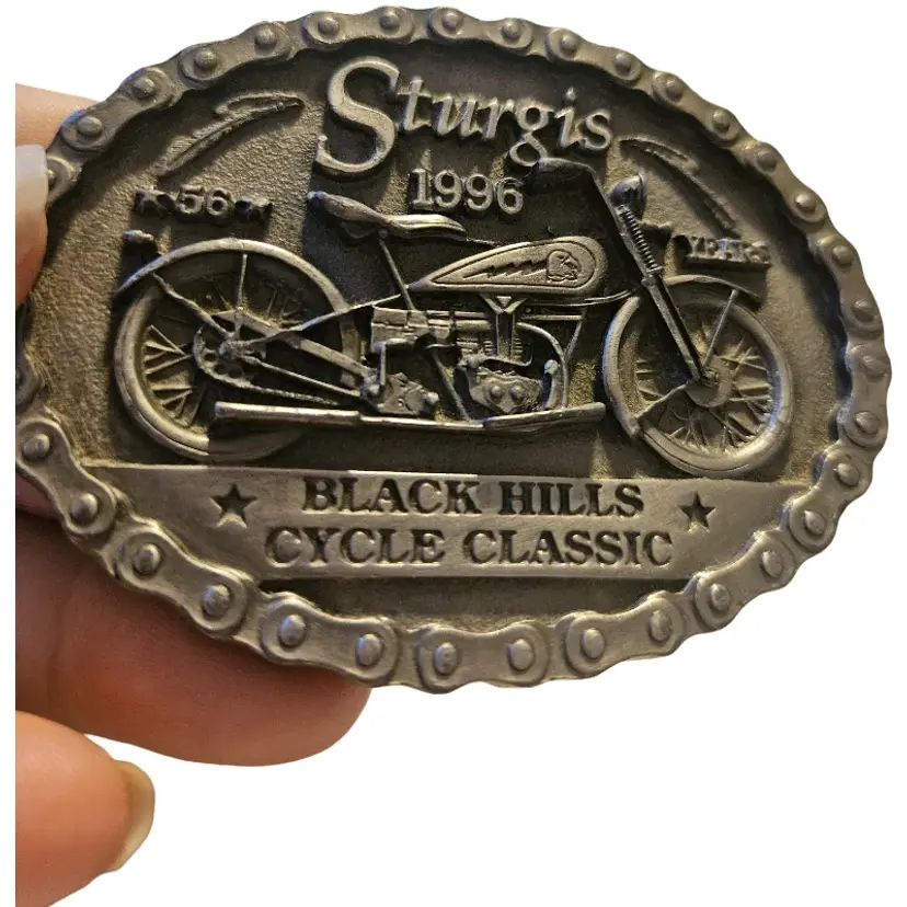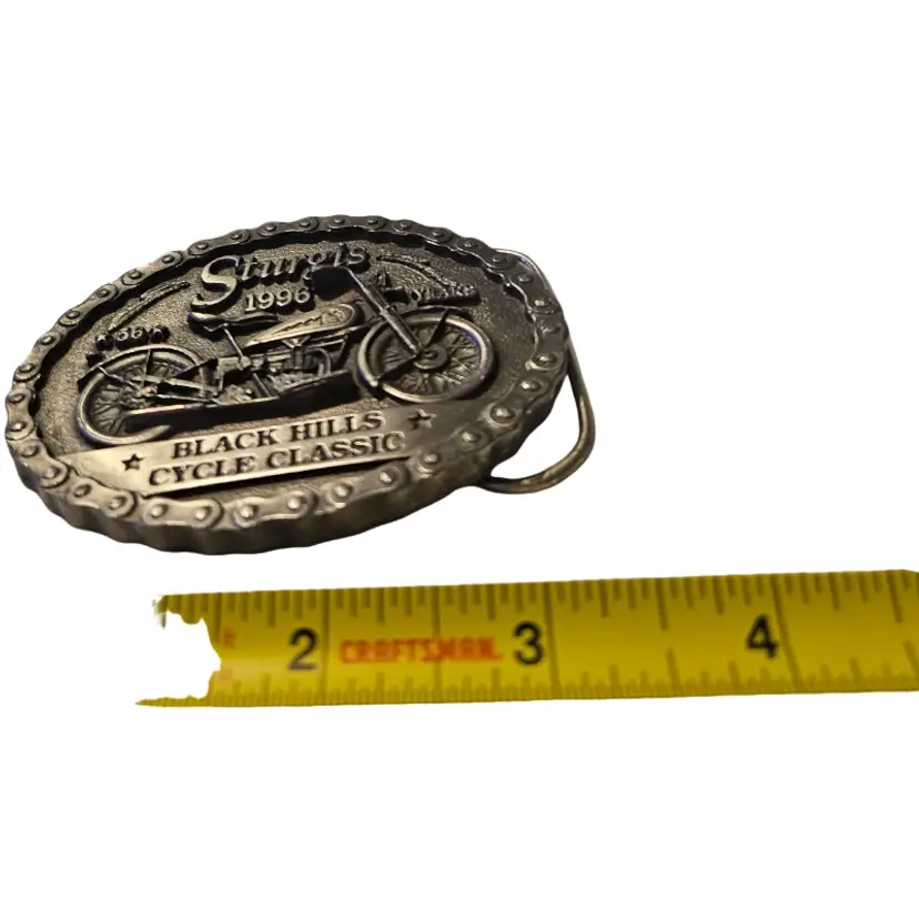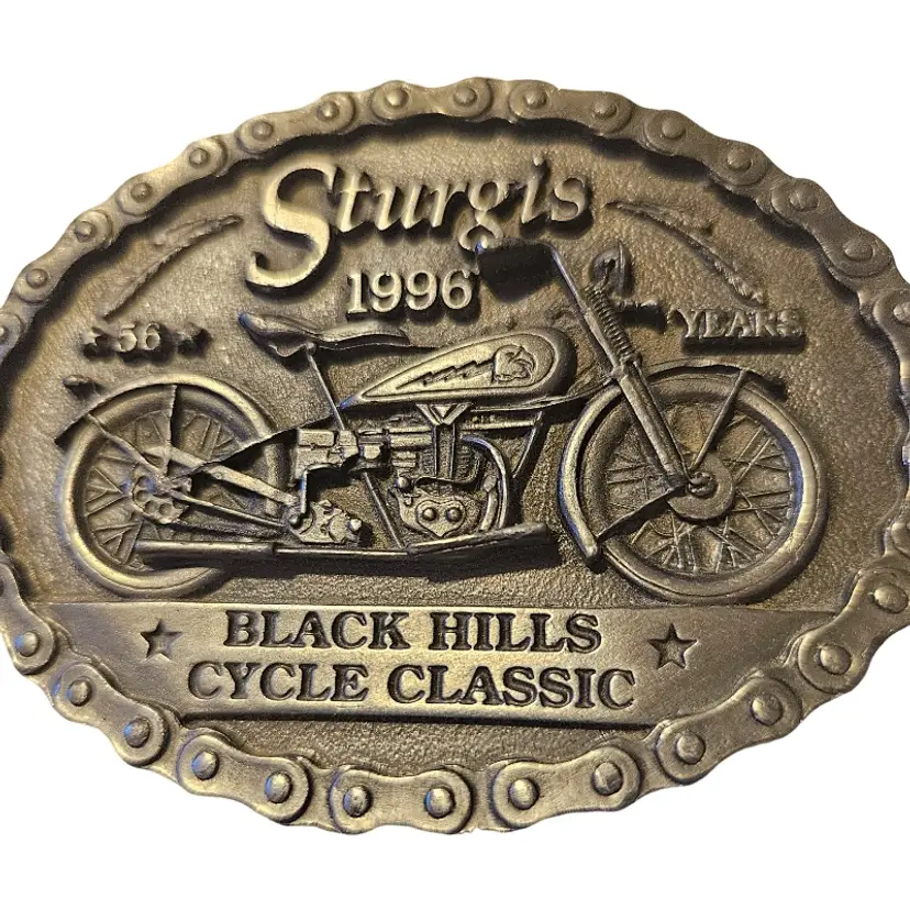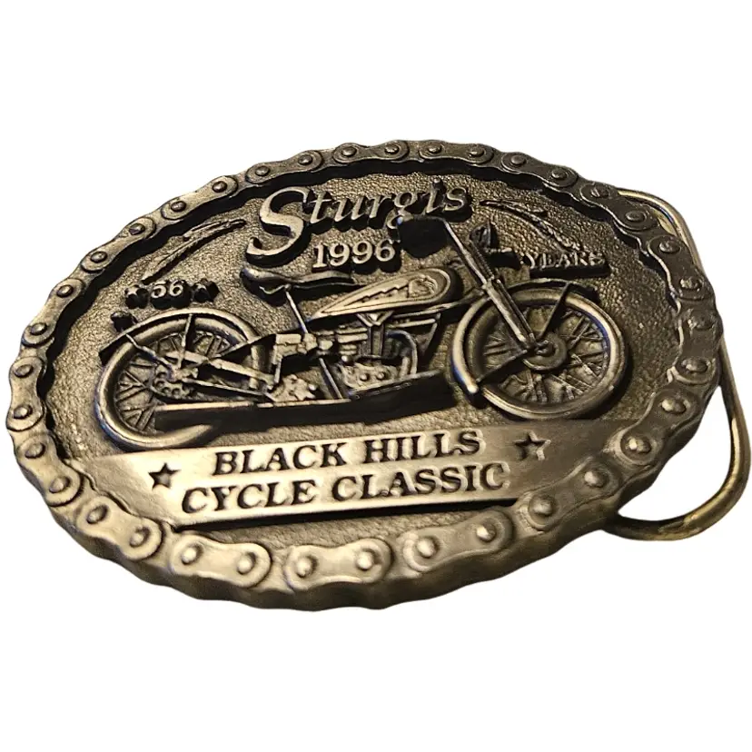 Vintage-style belt buckle featuring a motorcycle design. Sturgis 1996 Black Hills Cycle Classic theme. Perfect for motorcycle enthusiasts.