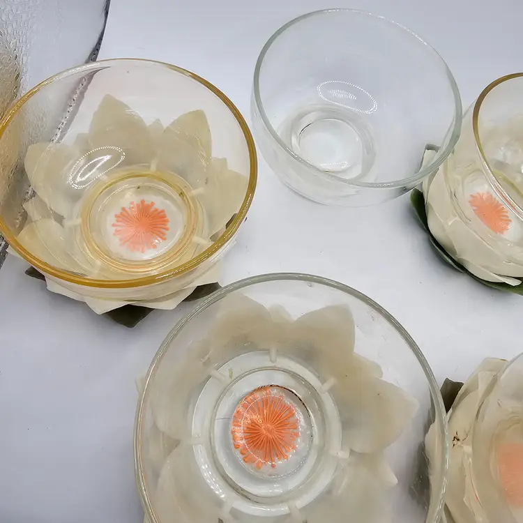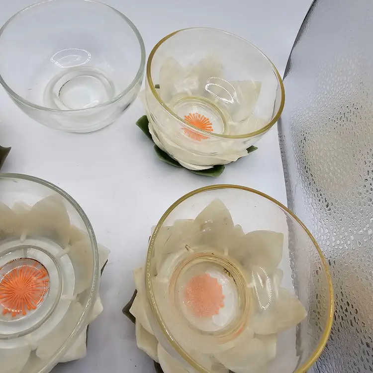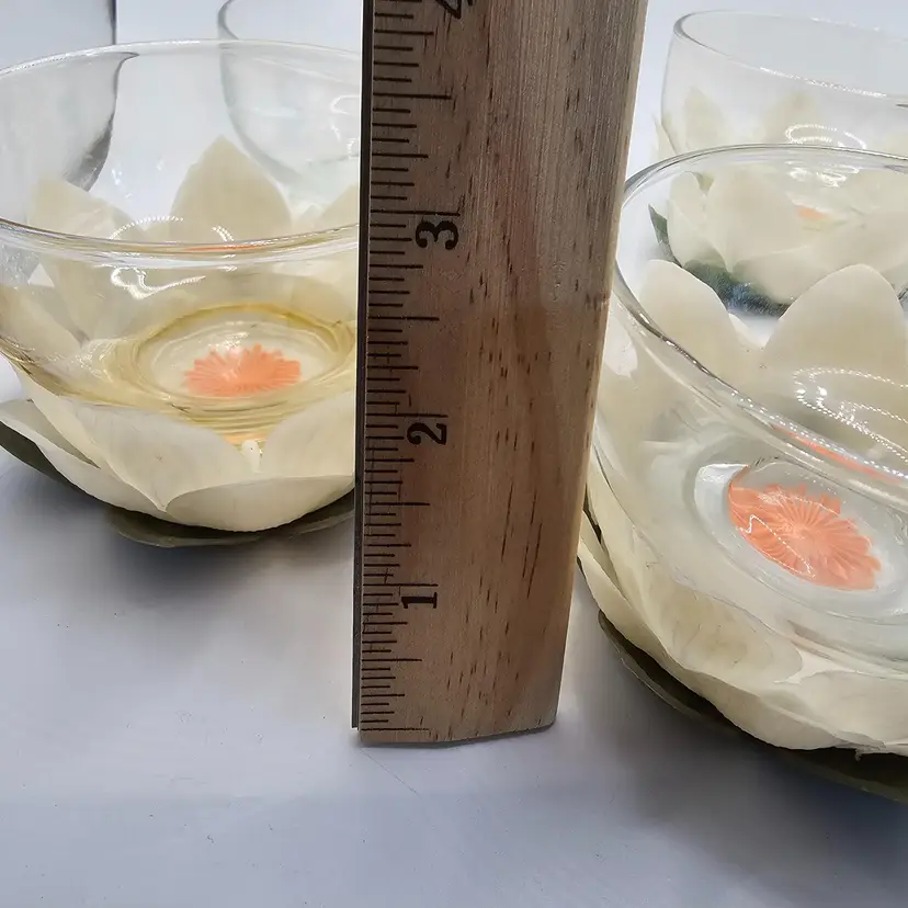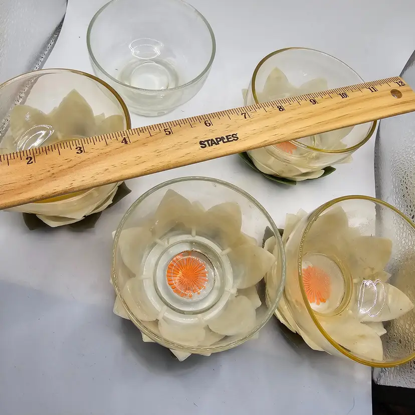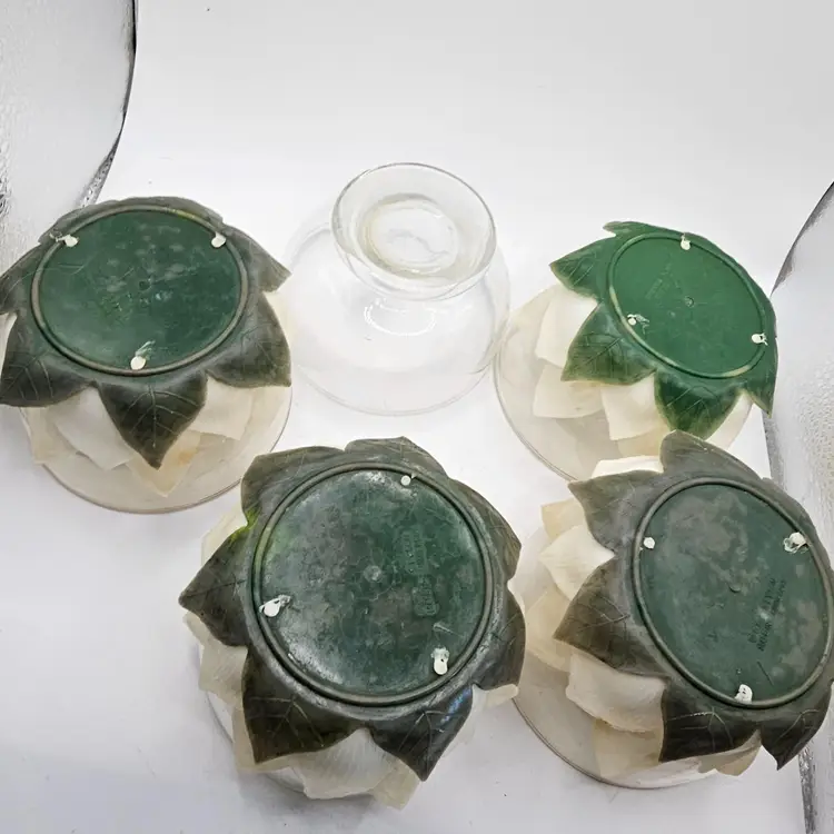 There is some staining. Comes with 4 with flowers plus one extra bowl without flowers