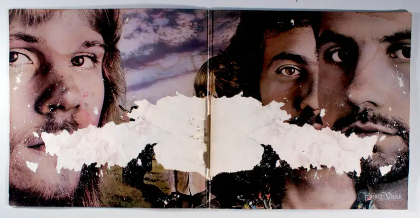 Vinyl plays with some crackles and a few light-clicks (play-graded). Gate-fold cover looks okay; moderate scuffing, creasing, discoloration with darker spots, surface abrasion and surface impressions (front/back); back has some water damage. Significant surface abrasion on inner-gate. Inner-sleeve is original (lyrics/credits); two seams partially split and some discoloration. Spine is mostly readable with wear. Shelf-wear along top/bottom/right-edge and corners. Opening is crisp with signs of use and divots; a few tears along back edge. Slight musty smell. (Not a cut-out.)