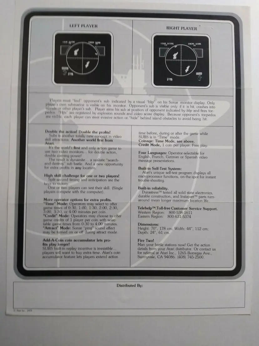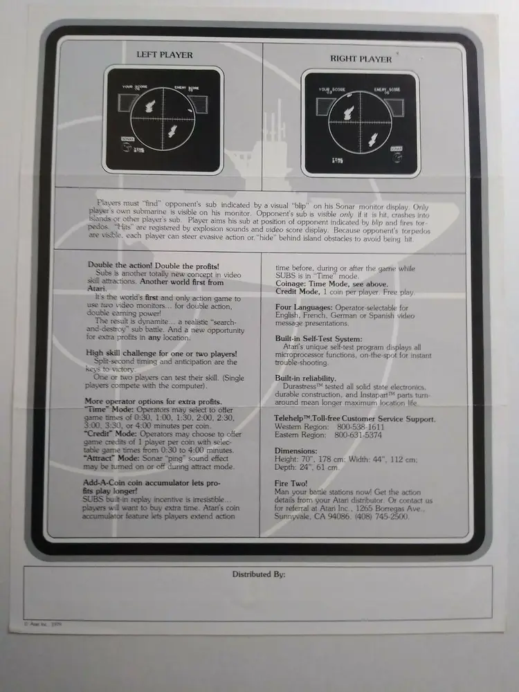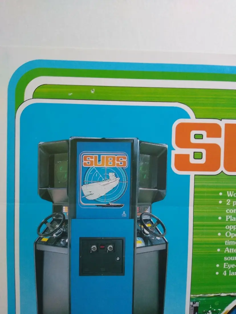 Modified Item: Yes Country/Region of Manufacture: United States Original/Reproduction: Original Year: 1979 Game Title: Subs Modification Description: Staple Holes. See notes. Brand: Atari Theme: Retro Gaming Arcade: Flyer