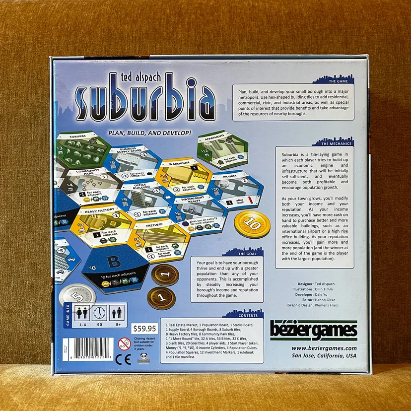 Suburbia is a tile-laying game in which each player tries to build up an economic engine and infrastructure that will be initially self-sufficient, and eventually become both profitable and encourage population growth. As your town grows, you'll modify both your income and your reputation. As your income increases, you'll have more cash on hand to purchase better and more valuable buildings, such as an international airport or a high-rise office building. As your reputation increases, you'll gain more and more population — and the player with the largest population at the end of the game wins.