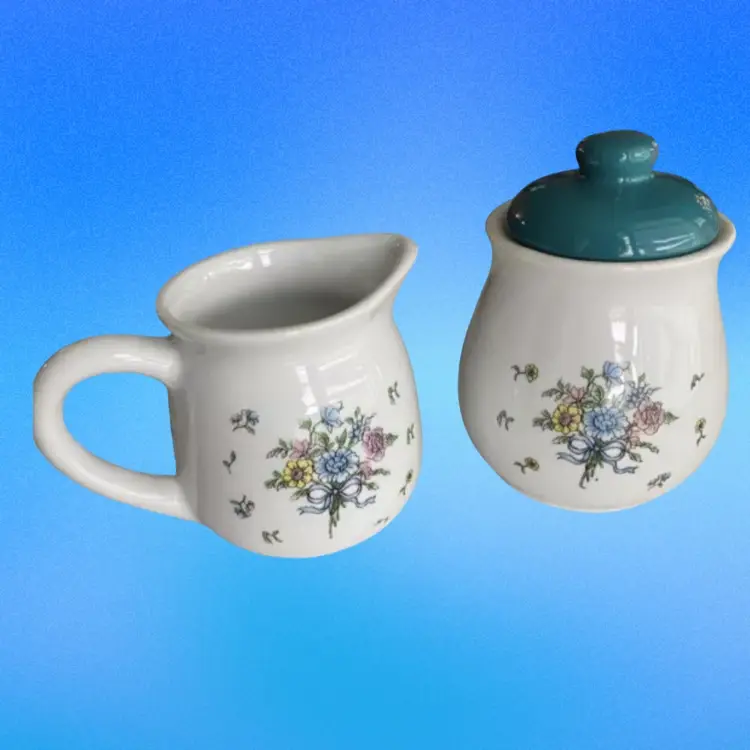 Adorable little sugar and creamer with beautiful flower design sugar has lid
