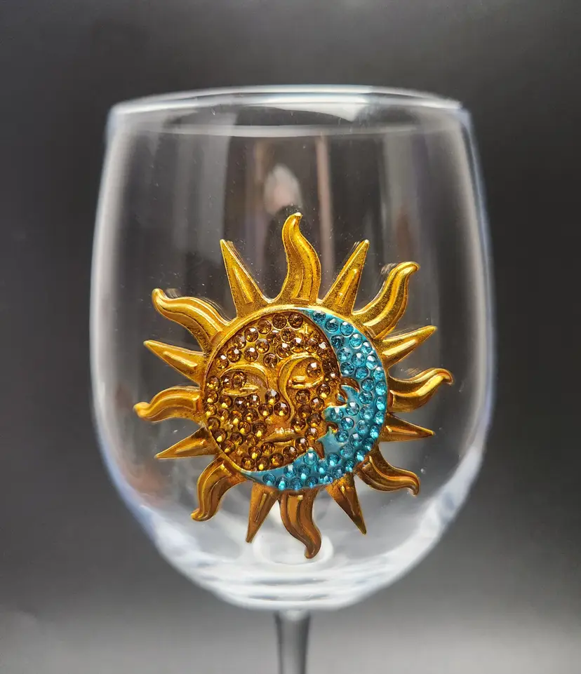 "Sun and Moon" jeweled stemmed wine glass from The Queens' Jewels. 9" tall, 3" opening.
