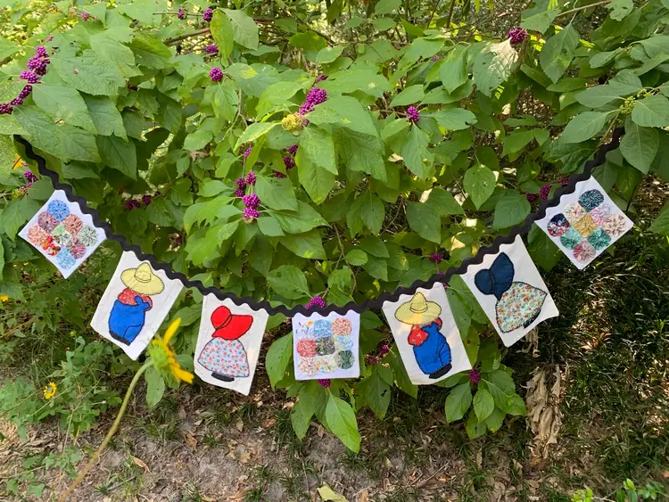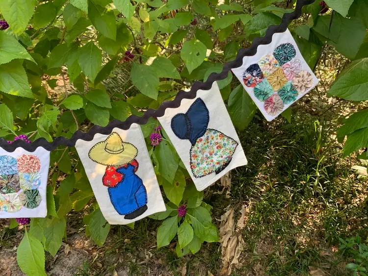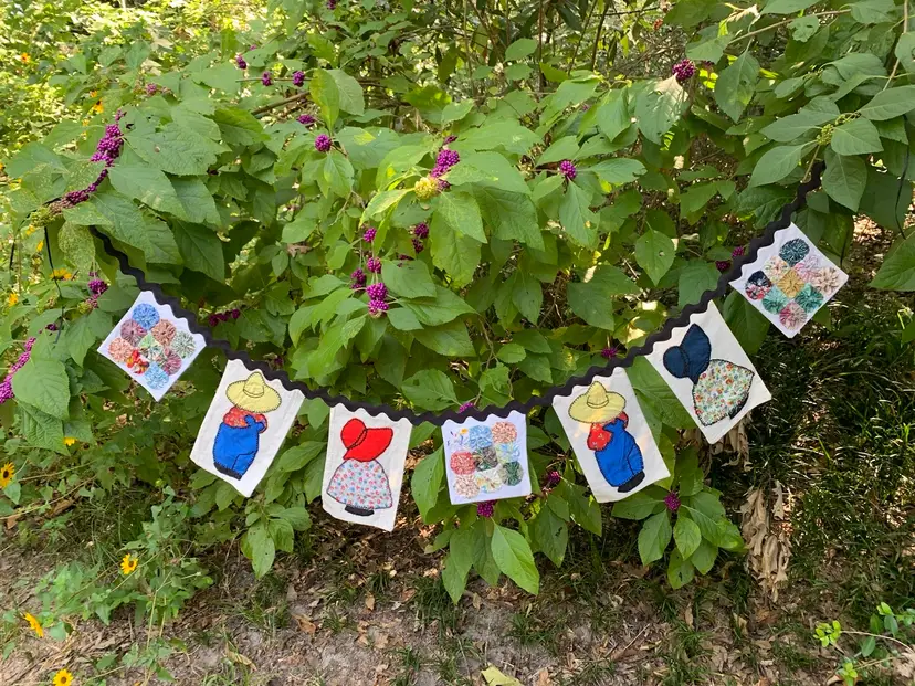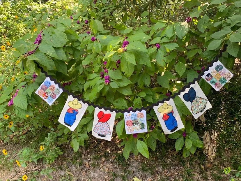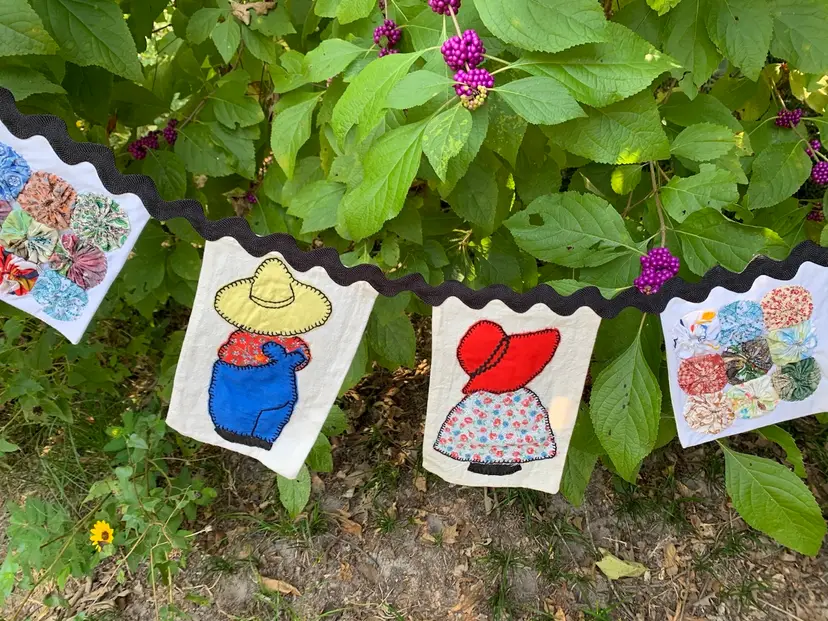 Pennant made from repurposed quilt blocks, Sunbonnet Sue, Overall Sam and squares of yo-yo’s. Backed with muslin and hand stitched on jumbo black ric-rac. Includes skinny satin ribbons on the ends for tying. Measures 60” in total length. Cute for farmhouse decor, granny chic or primitive country decor ! Can go on a mantle, over a window or over a baby crib.