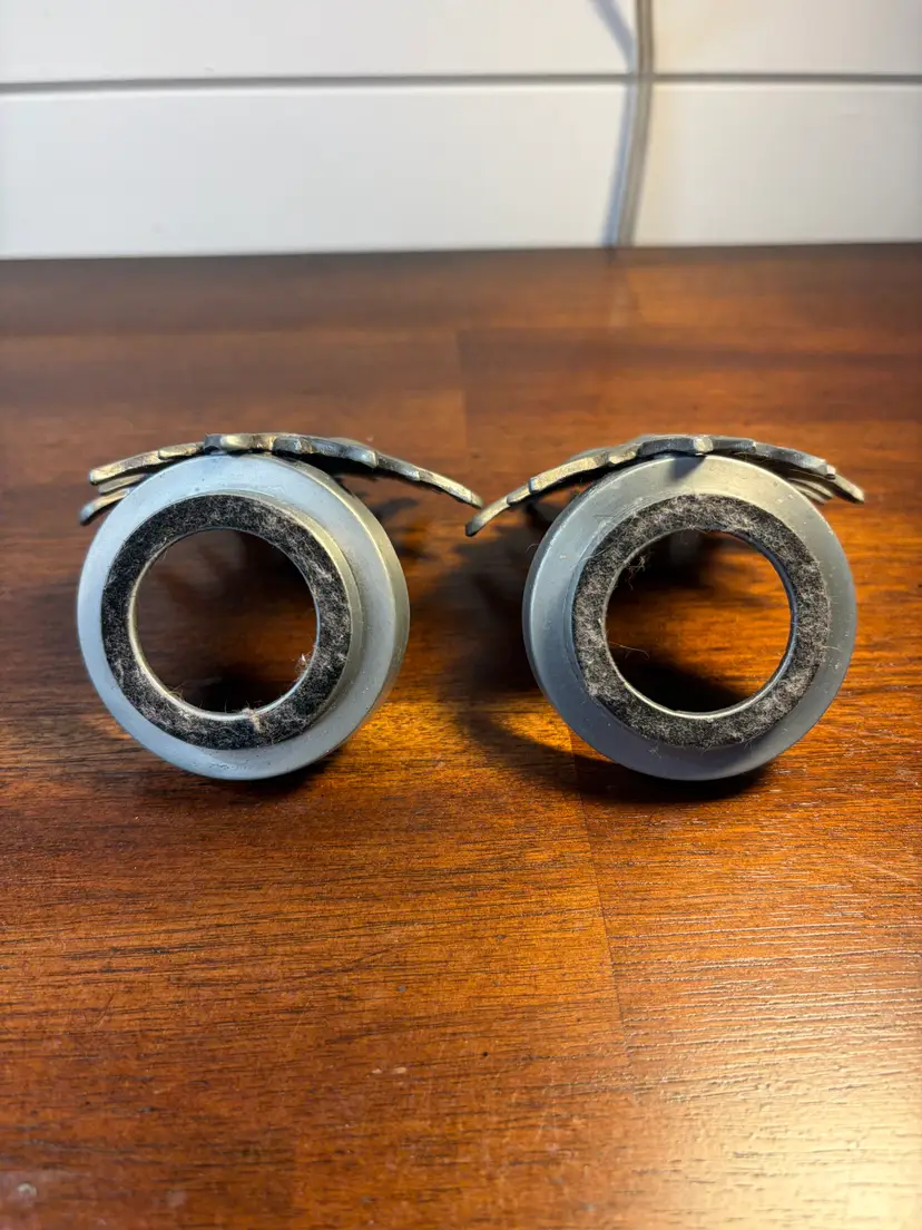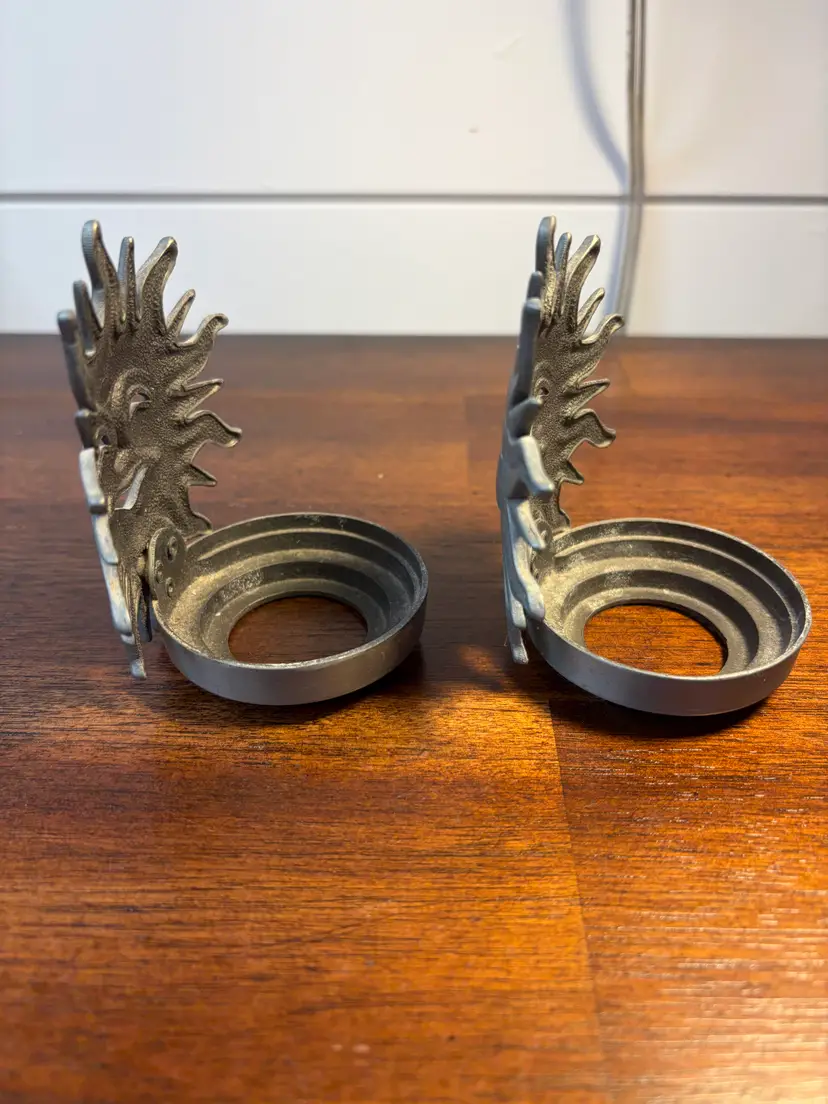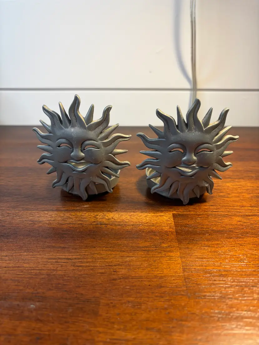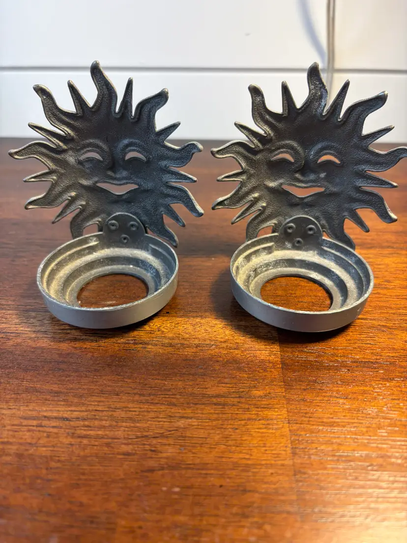 Pair of unique sunburst design metal candle holders. Perfect for adding a touch of flair to your decor. Each holder measures approximately 2 inches in diameter and 3 inches tall.