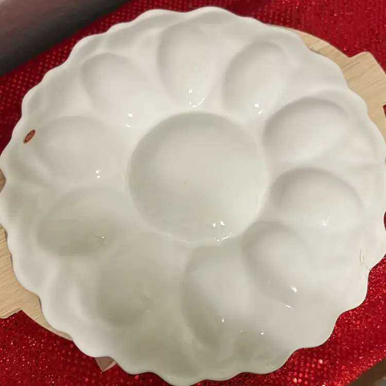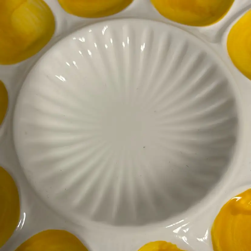 This is a white ceramic deviled egg serving platter with a sunflower design. Design: Features a white, scalloped edge with a bright yellow sunflower pattern in the center. Capacity: Designed to hold 10 deviled eggs in individual indentations. Material: Made from ceramic with a glazed finish. Features: Includes a central well for a dipping sauce or additional eggs. 9.5" diameter