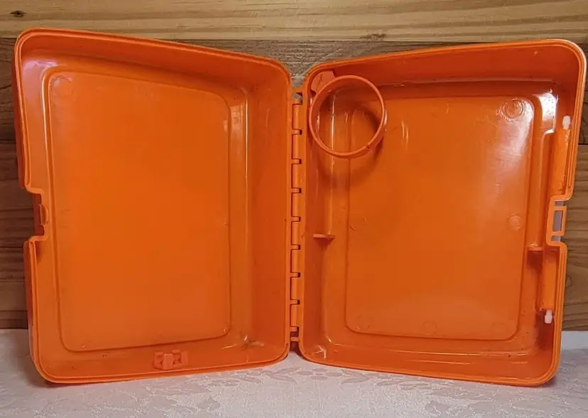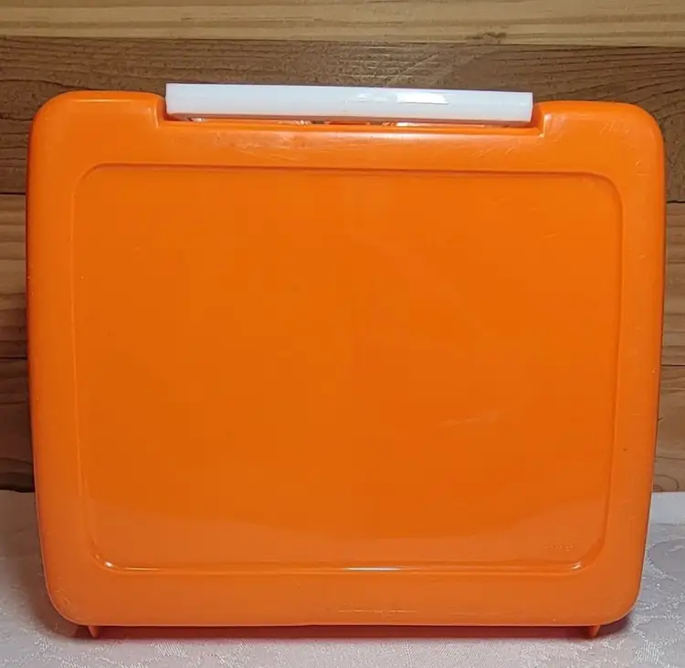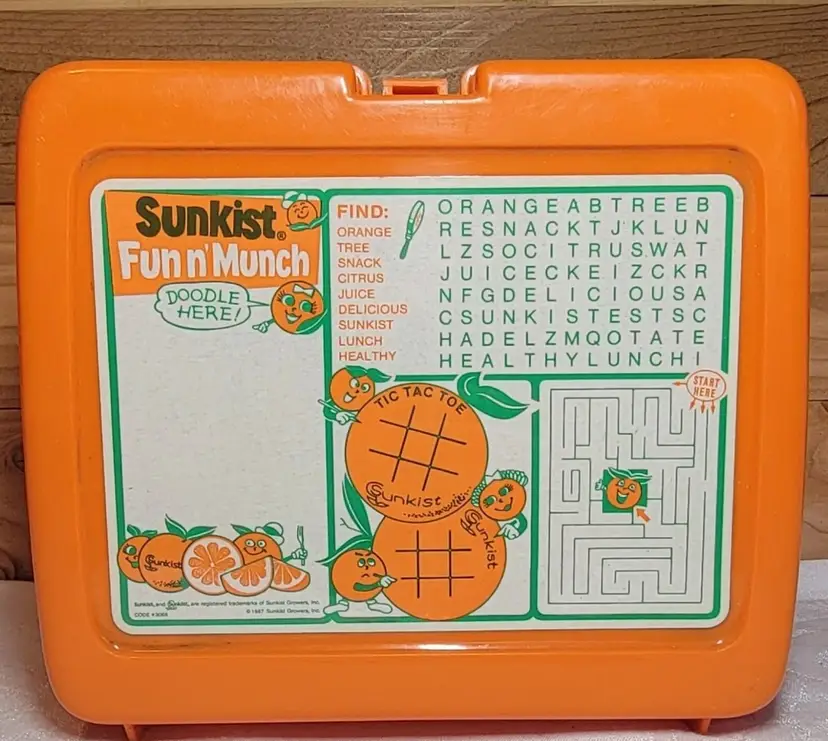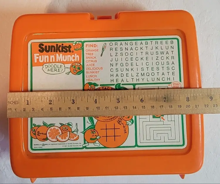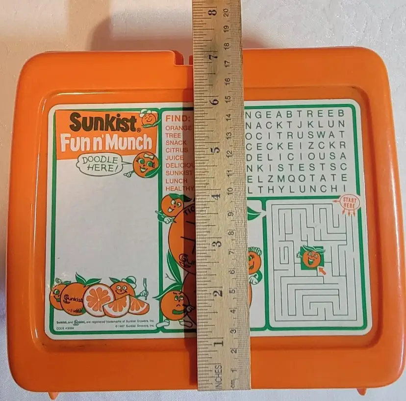 This Sunkist Fun N' Munch orange plastic snack/lunch box from 1987 is a fantastic addition to any collection. It features fun activities on the front and is perfect for carrying snacks or a small lunch. The box is in excellent shape and has been used, making it a rare find for collectors. The material of the box is durable plastic. The lunch box has no cracks or breaks. The brand of the box is Sunkist, which is a well-known brand in the food industry. This is a must-have item for anyone who loves collecting vintage lunch boxes.