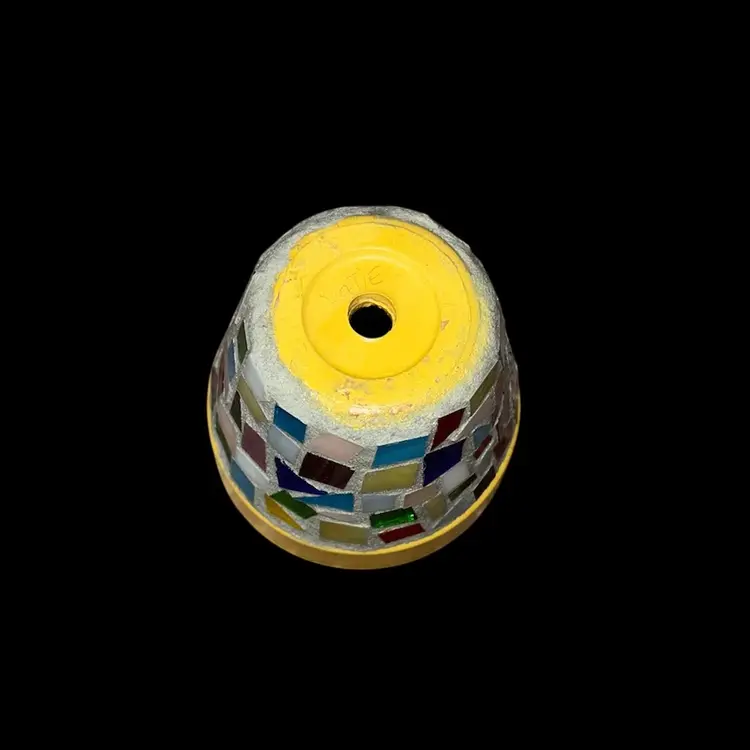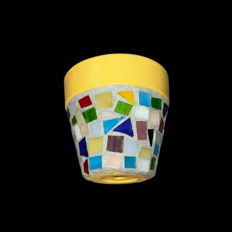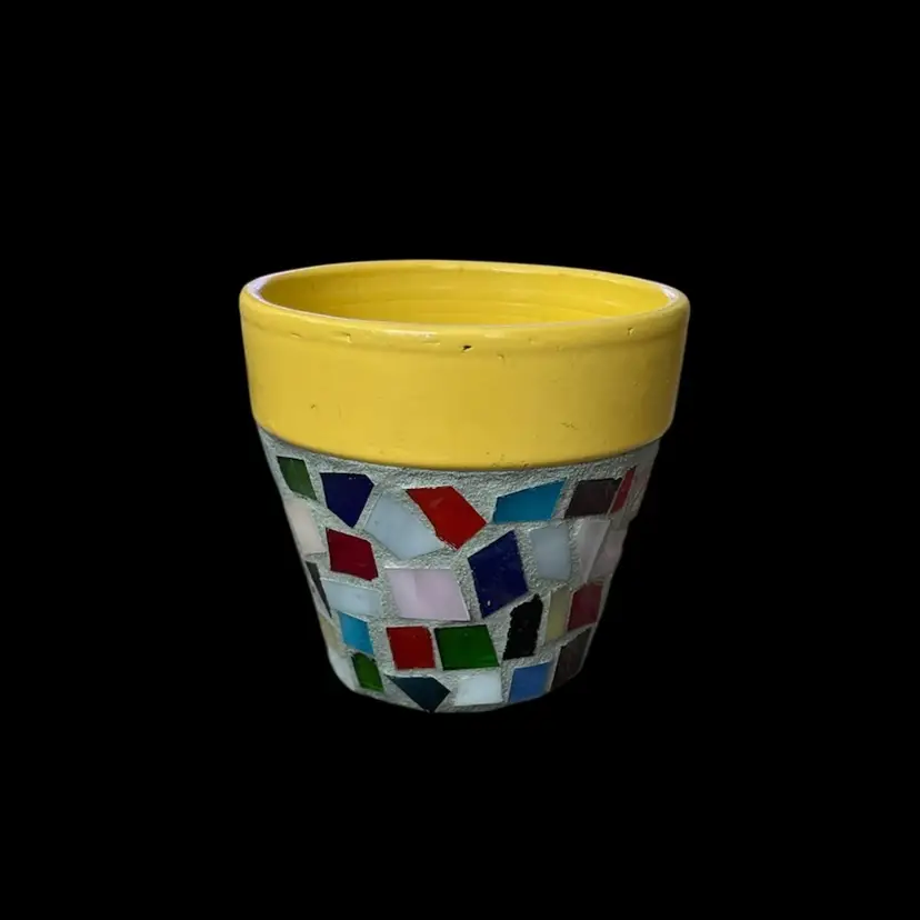 A happy, colorful mosaic stained glass 3.5” planter pot with drainage hole. In nice condition and ready to use for a succulent or plant of your choice. Pot is 3.5” tall x 3.5” in diameter (top of planter ) Chunky little planter