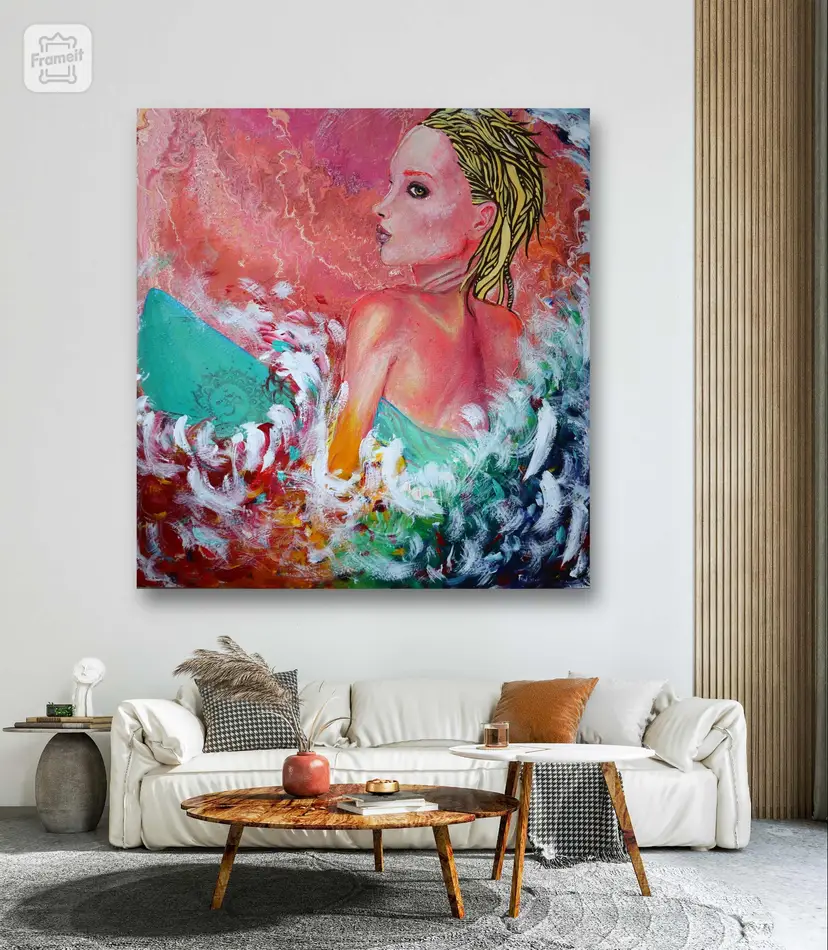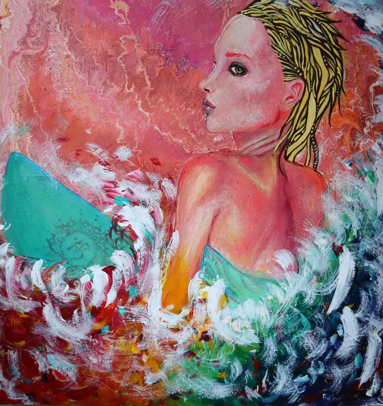 Acrylic painting by Christina Martine. 31.5 W x 31.5 H x 2 D in. Sunrise surfer girl, beach babe.