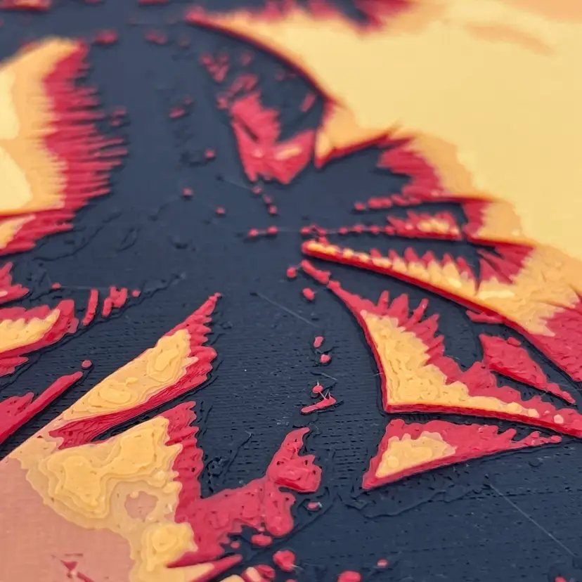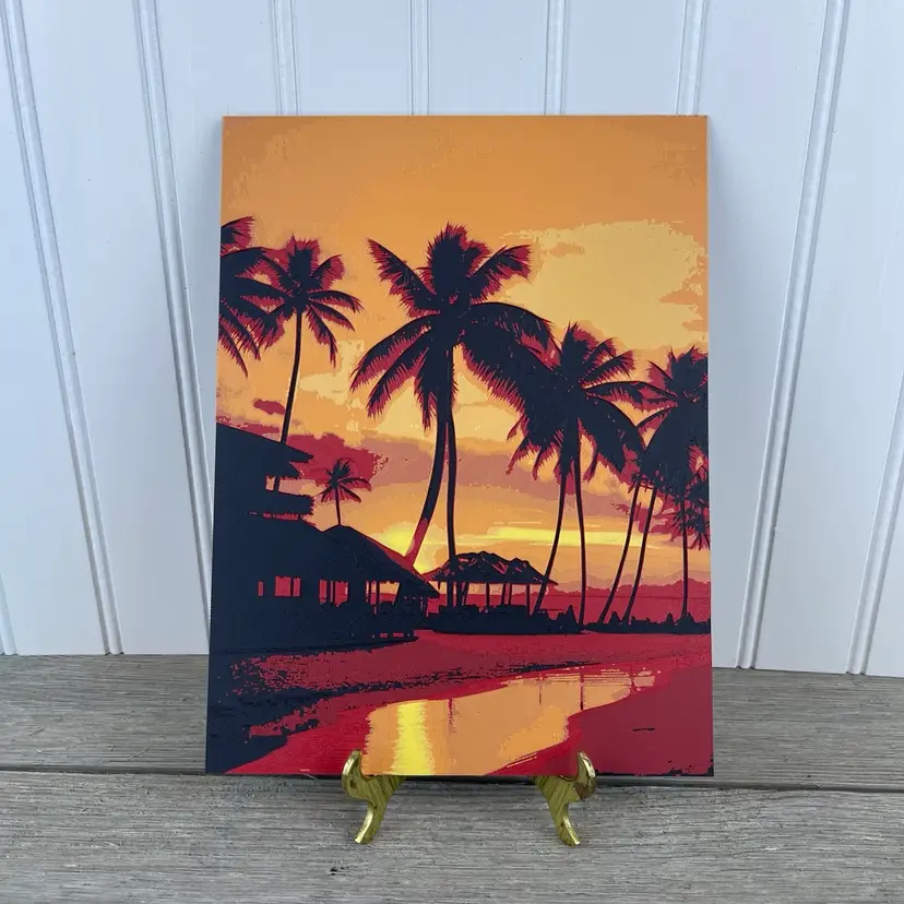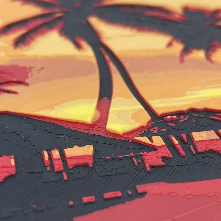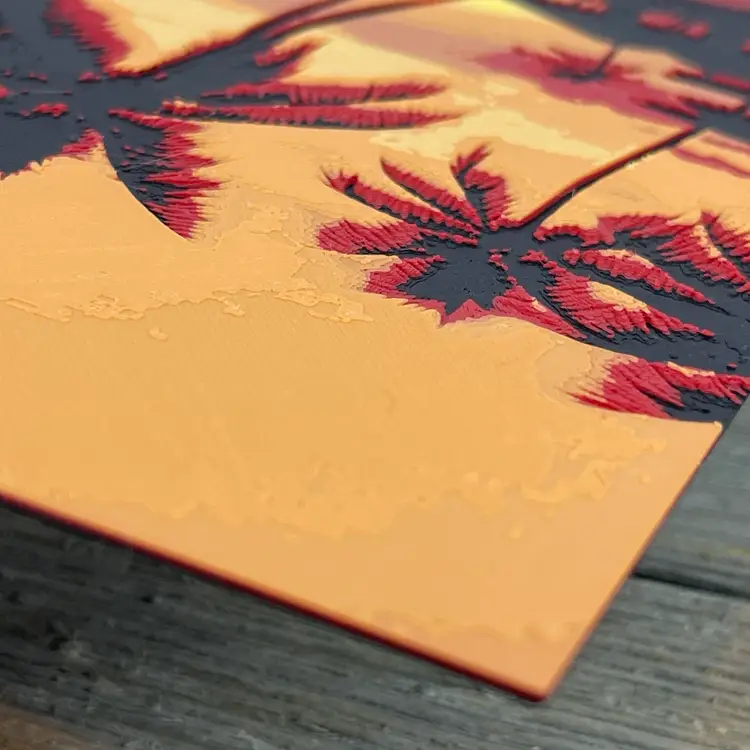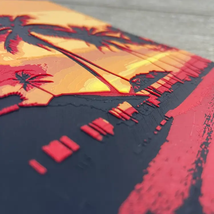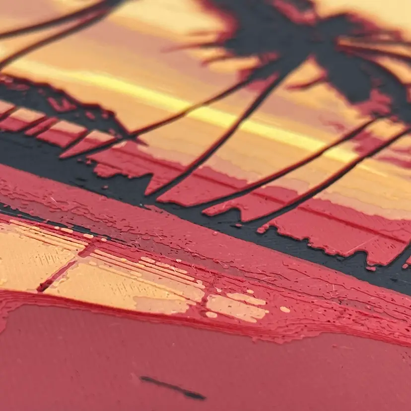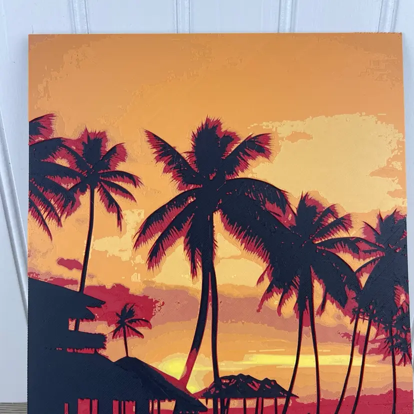 Celebrate the beauty of a seaside sunset with this beautiful 3D printed artwork. A row of palm trees and beach cabins set against a sky of yellows and oranges really displays the elegance and beauty of sunset. The colors and texture in this piece is bound to grab people’s attention.