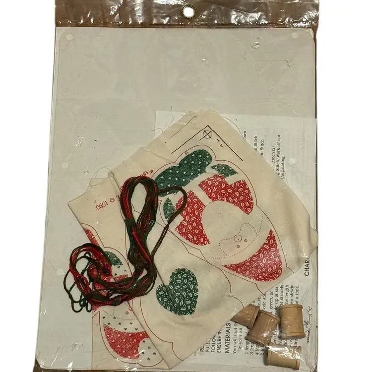 This kit contains cotton embroidery thread, perle cotton, design printed on muslin, wooden spools, needle and easy instructions. Stuffing is not included. There are four Santa figures to be made that range from 5" to 5 1/2" high. Brand new in sealed package. Package does show some wear. Please see photos and feel free to contact me with any questions. Thank you.