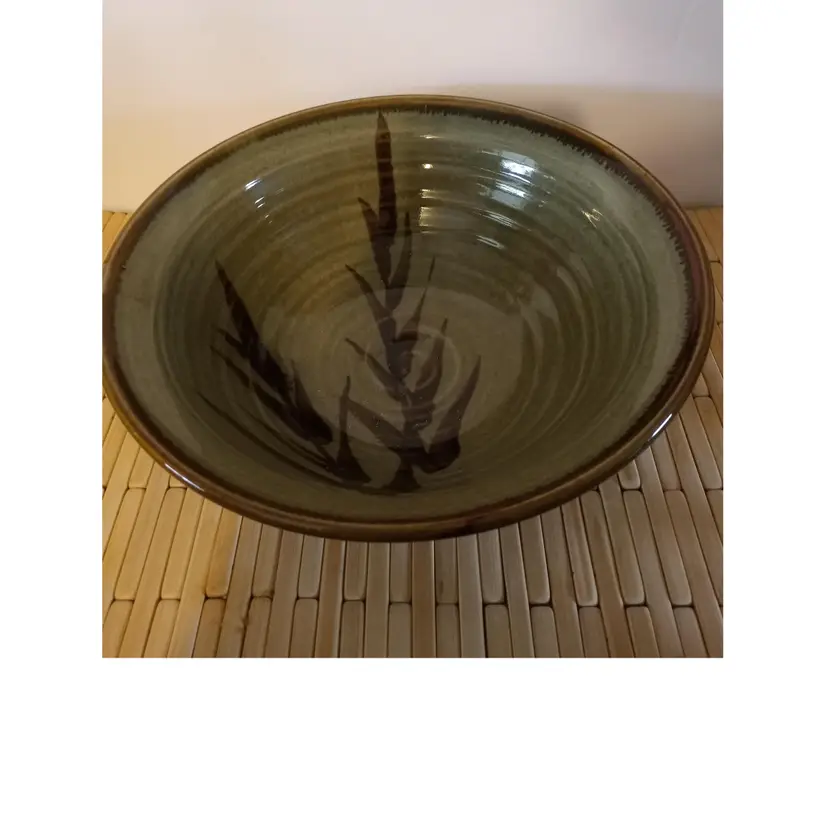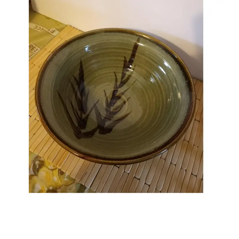Gorgeous Sunset Canyon Pottery handmade, handturned, Japanese brushstroke hand-painted pottery bowl with bamboo design and drip glaze rim, 1980s -1990s. Like-new condition. Measures 5" tall, 10" diameter. Earthy Zen beauty! Austin, Tx., USA