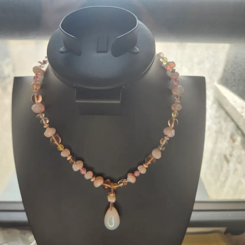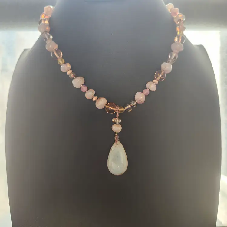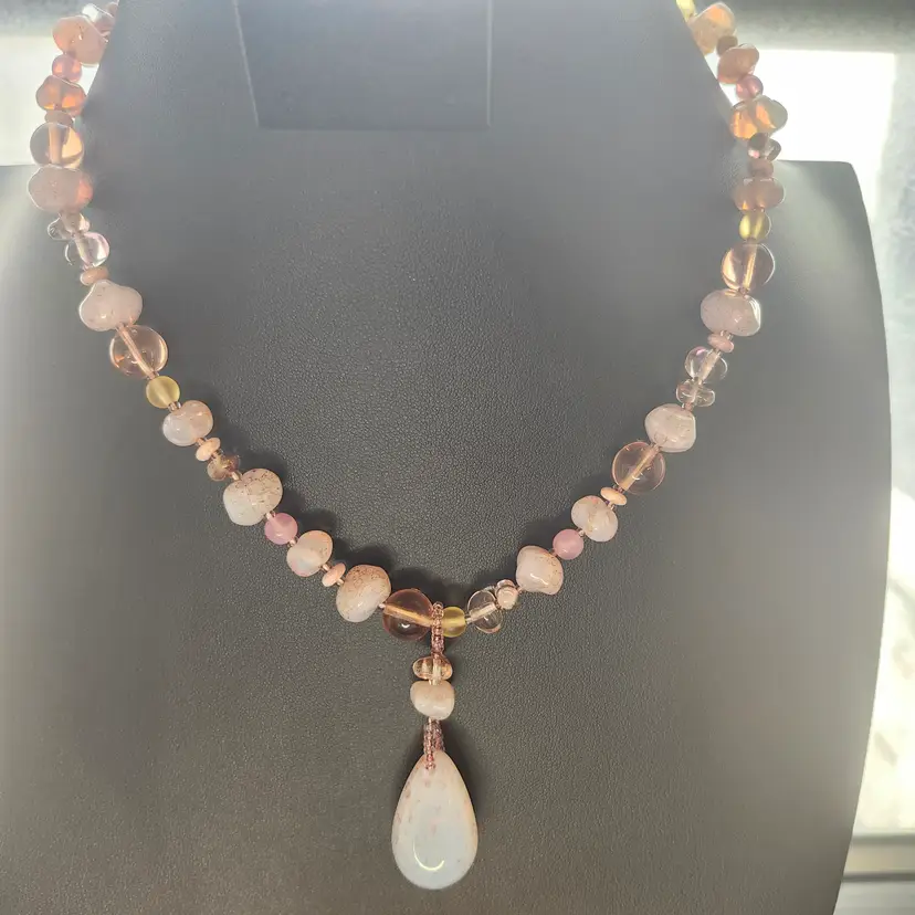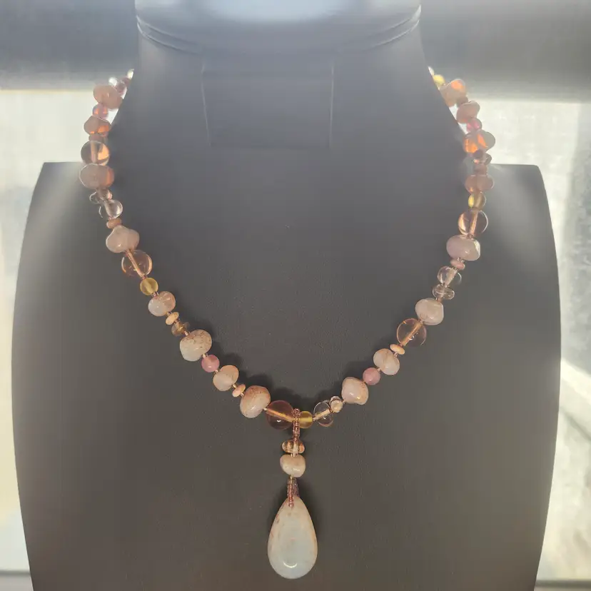 Embrace the warmth of a sunset with this stunning beaded necklace. Featuring a blend of amber and pink-hued beads, this piece is beautifully accented with a captivating teardrop pendant. Perfect for adding a touch of elegance to any outfit, whether you're dressing up for a special occasion or adding a bit of flair to your everyday look.
