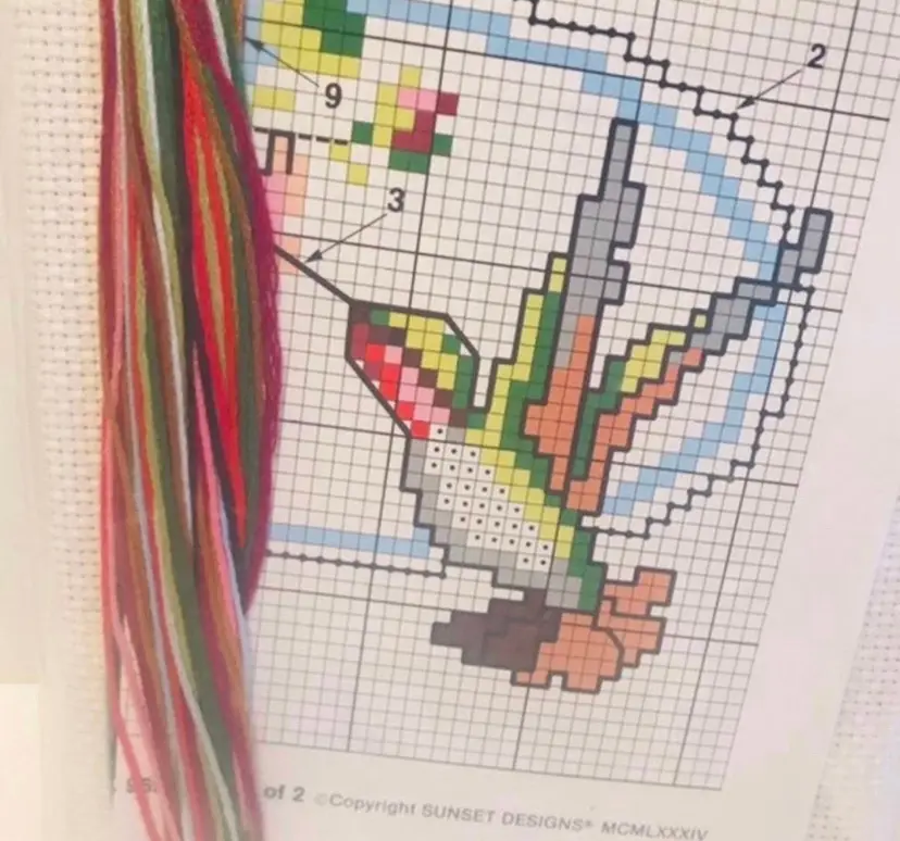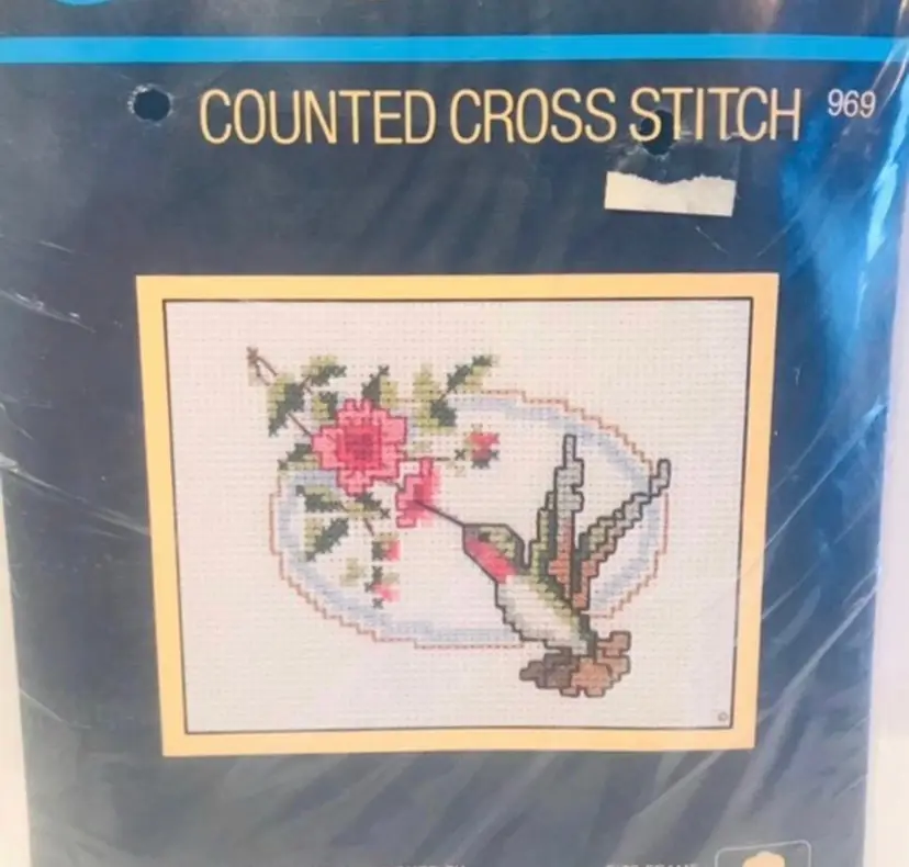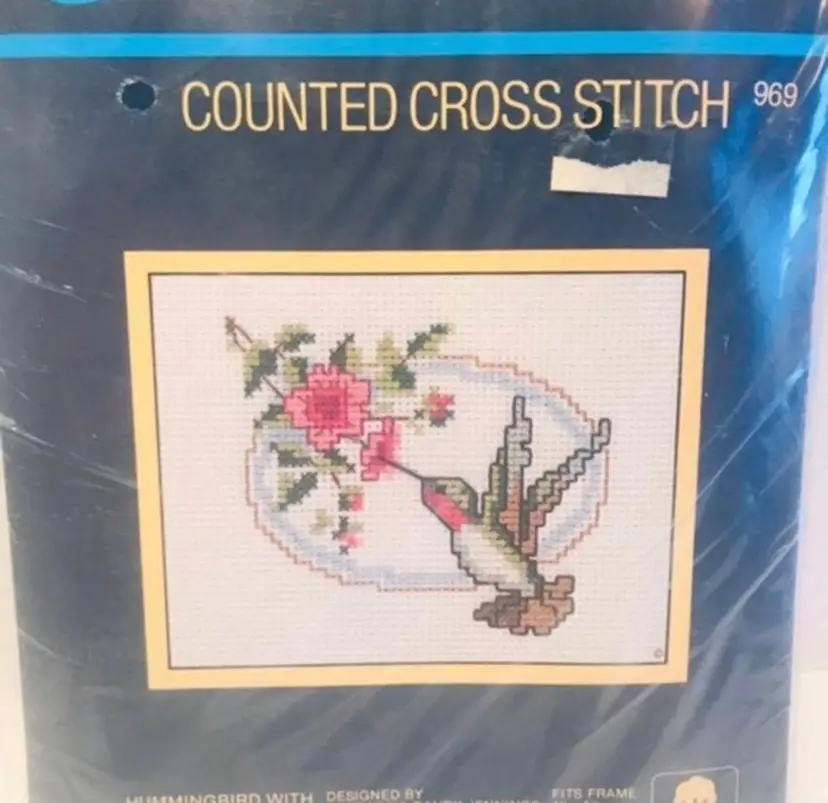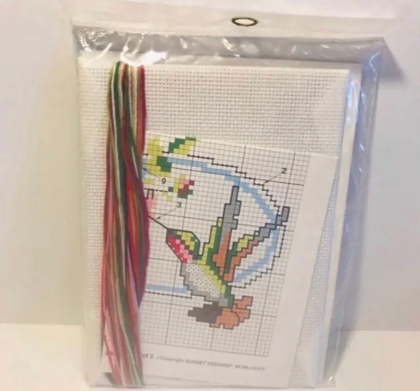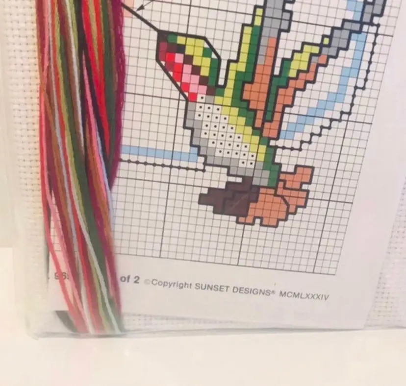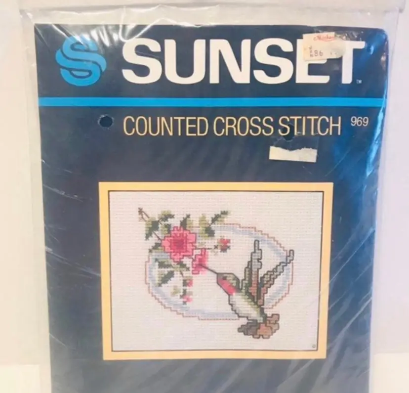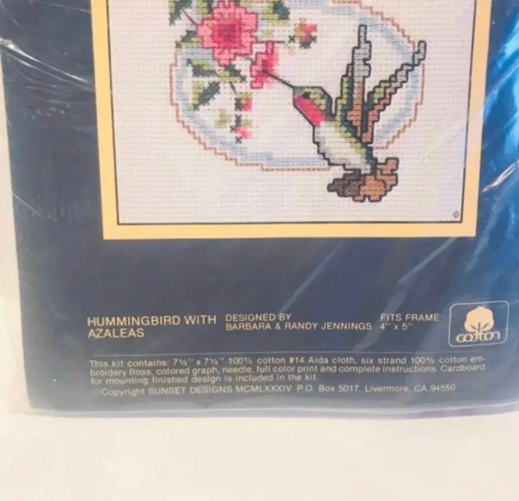 Sunset counted cross stitch Hummingbird with azaleas Colors include pink, greens, browns, white, blue gray New in package Vintage from 1984 Fits frame 4” x 5” Shipped in a poly mailer