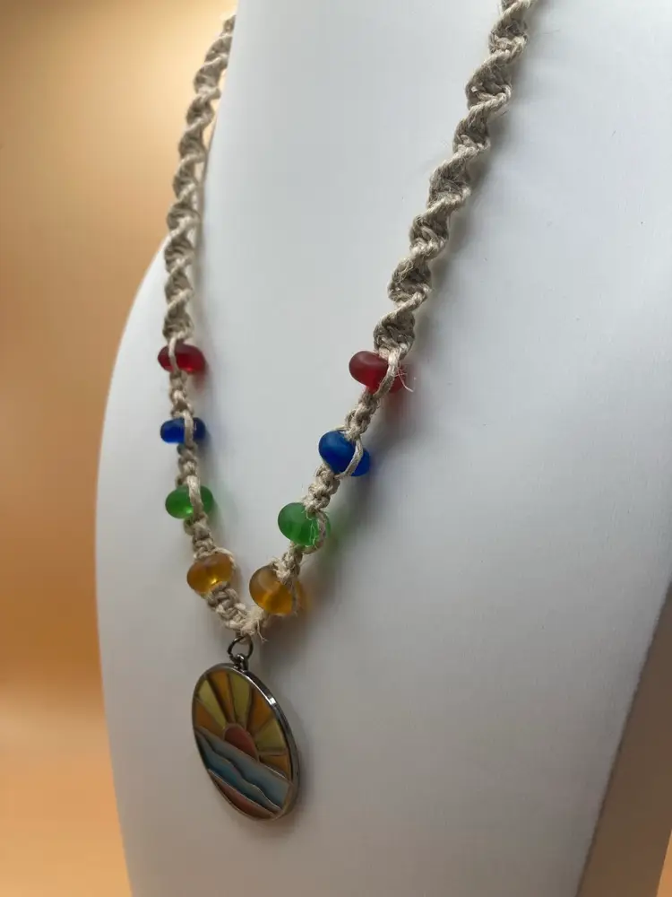 Handmade hemp necklace features resin sun pendant made to look like stained glass. The pendant is centered among yellow, green, blue, and red glass beads. Necklace features a bead and loop toggle style closure. Necklace measures 18inches.