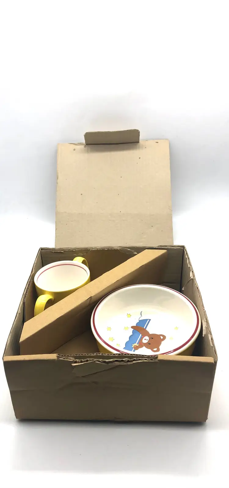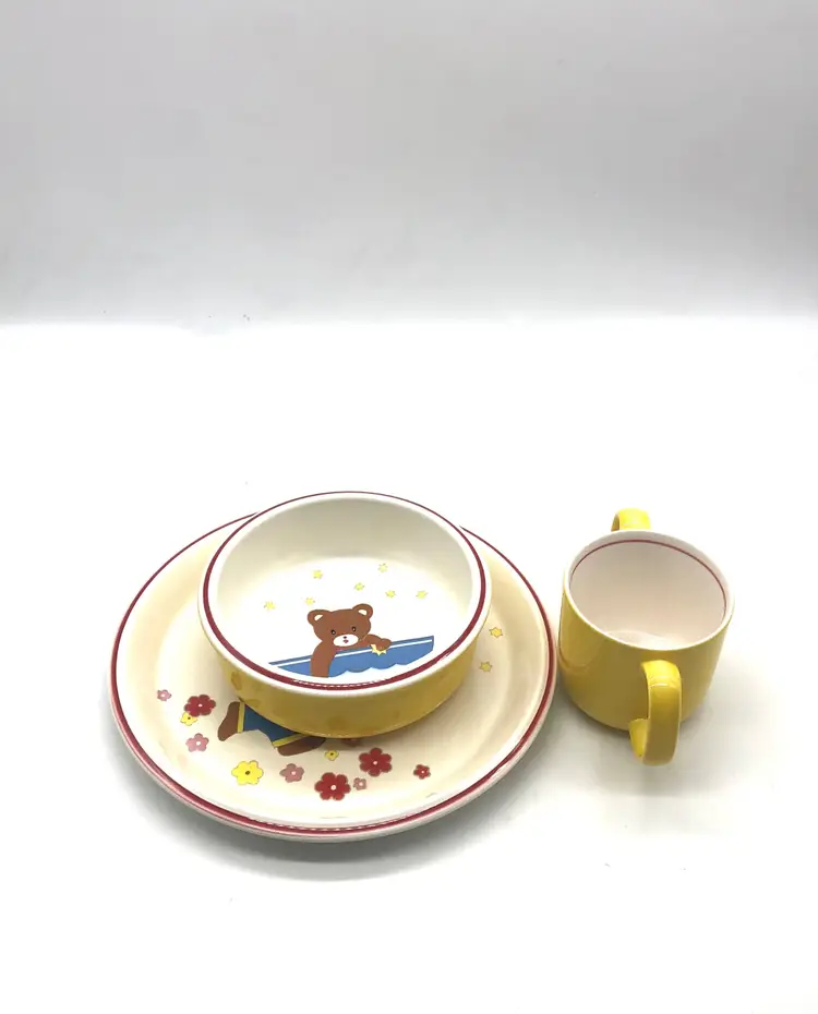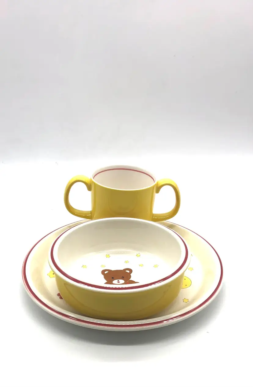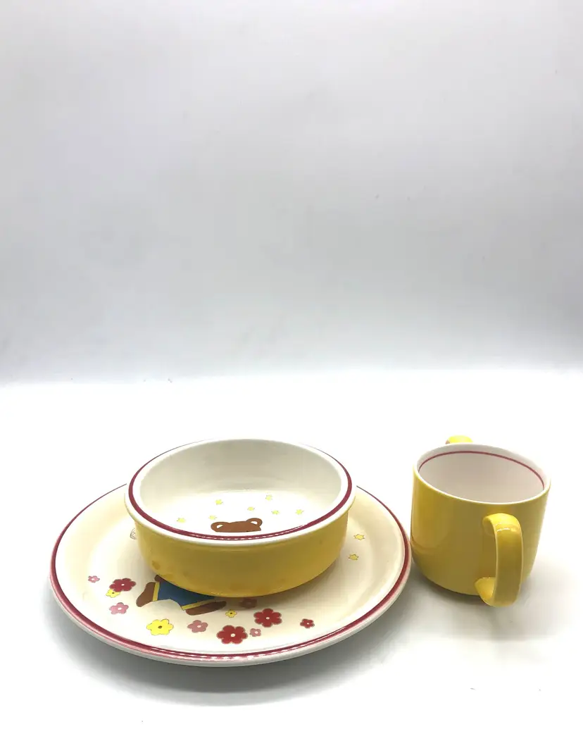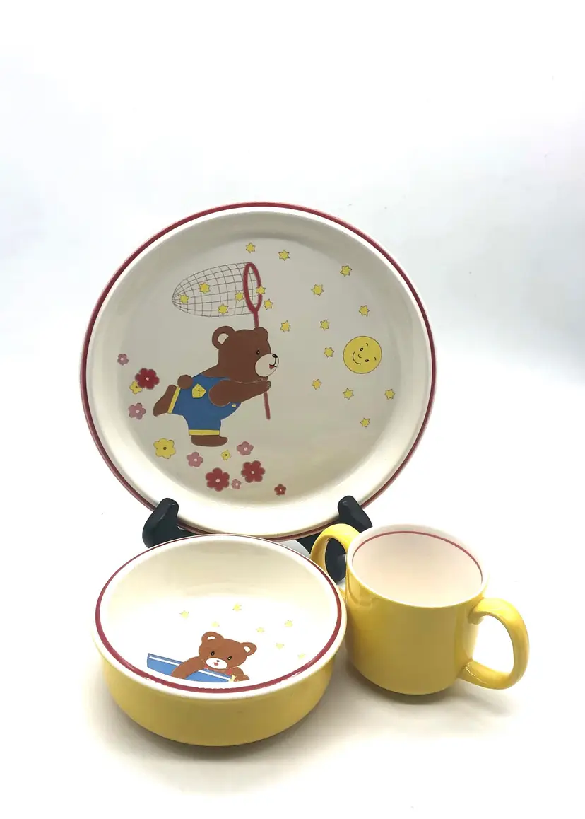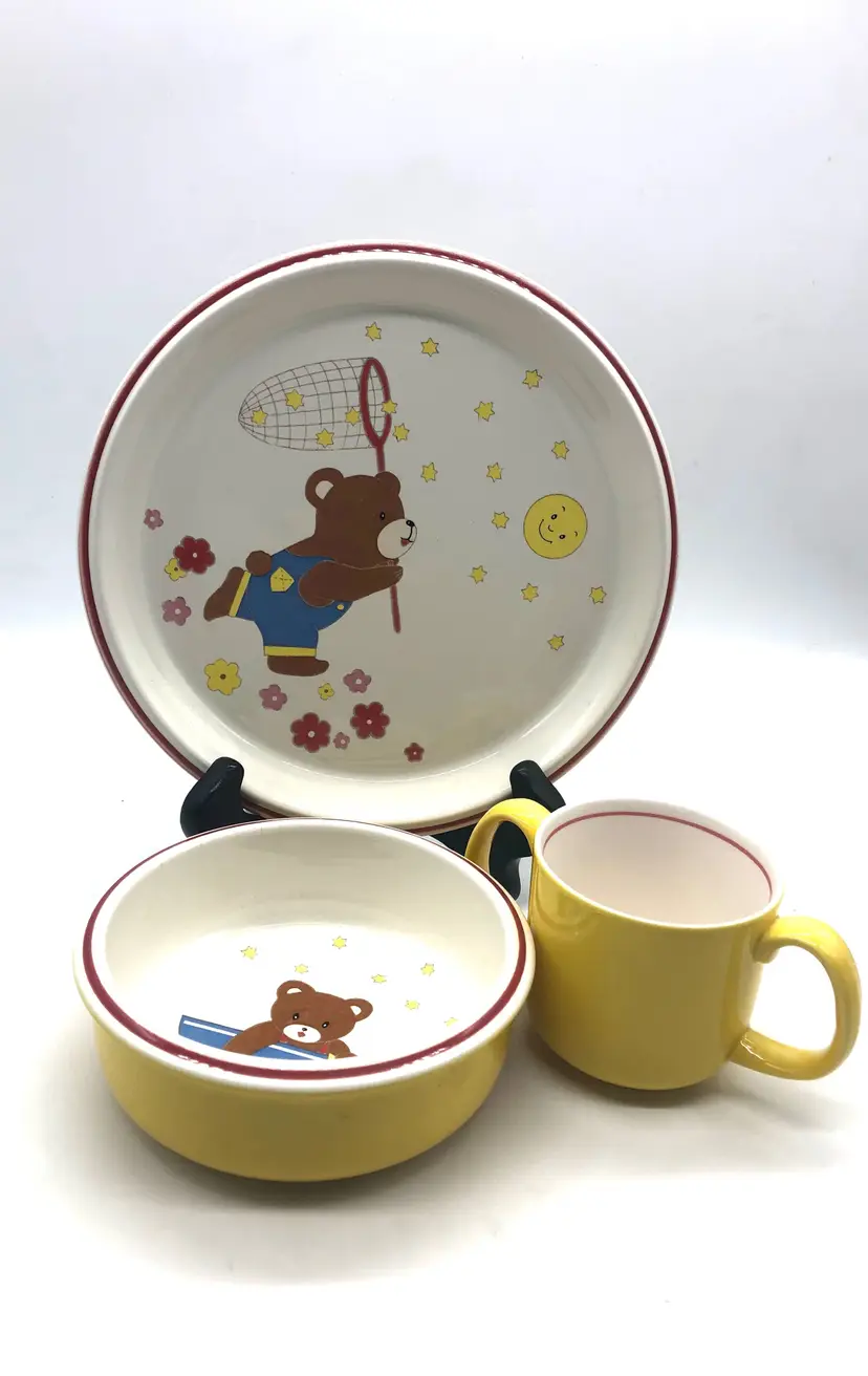 This adorable vintage children's dish set is perfect for young ones starting their culinary journey. Featuring a charming "Catch a Star" design, the set includes a two-handled cup, a plate, and a bowl, all ideal for little hands.