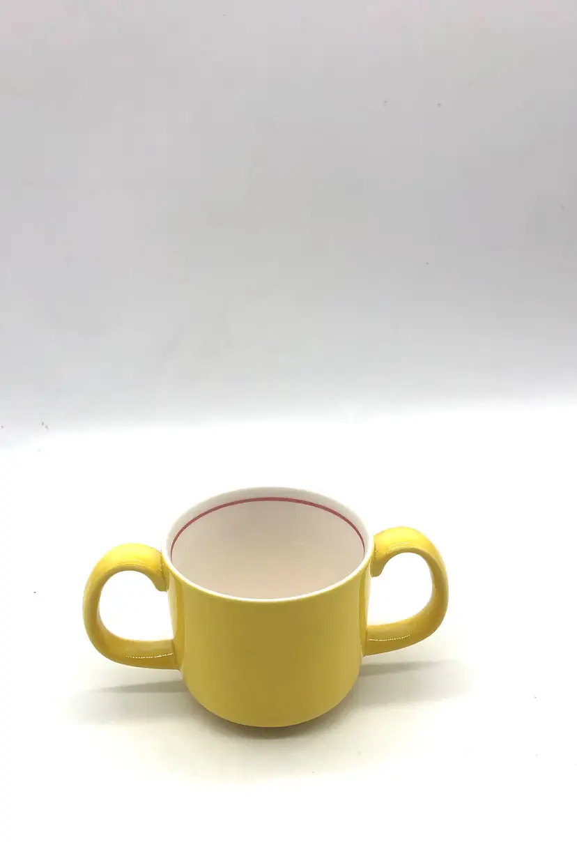 Two-handled cup: 2.5 inches tall, 3 inches wide Plate: 8 inches wide Bowl: 2 inches tall, 5.25 inches wide