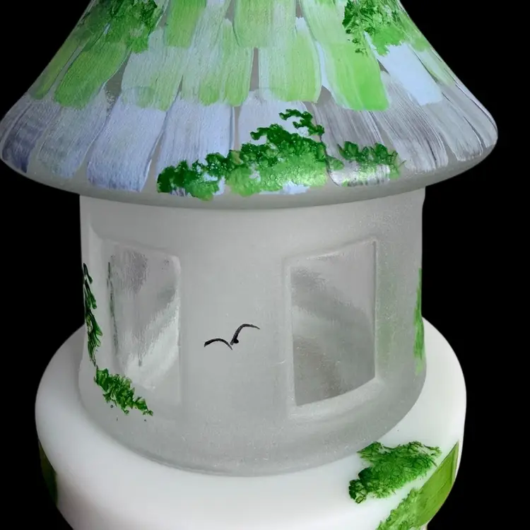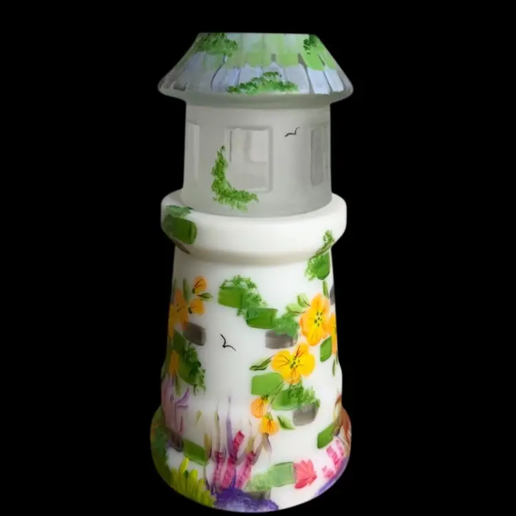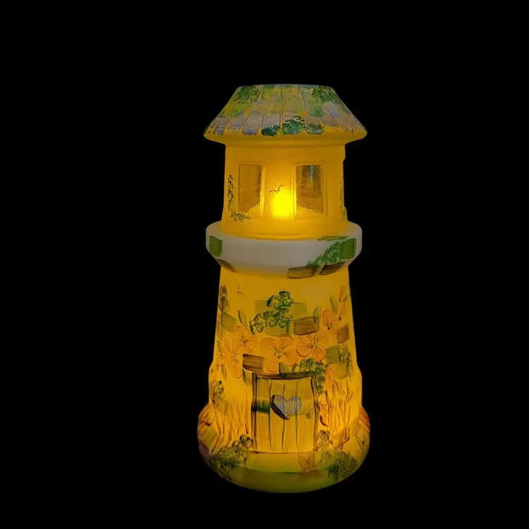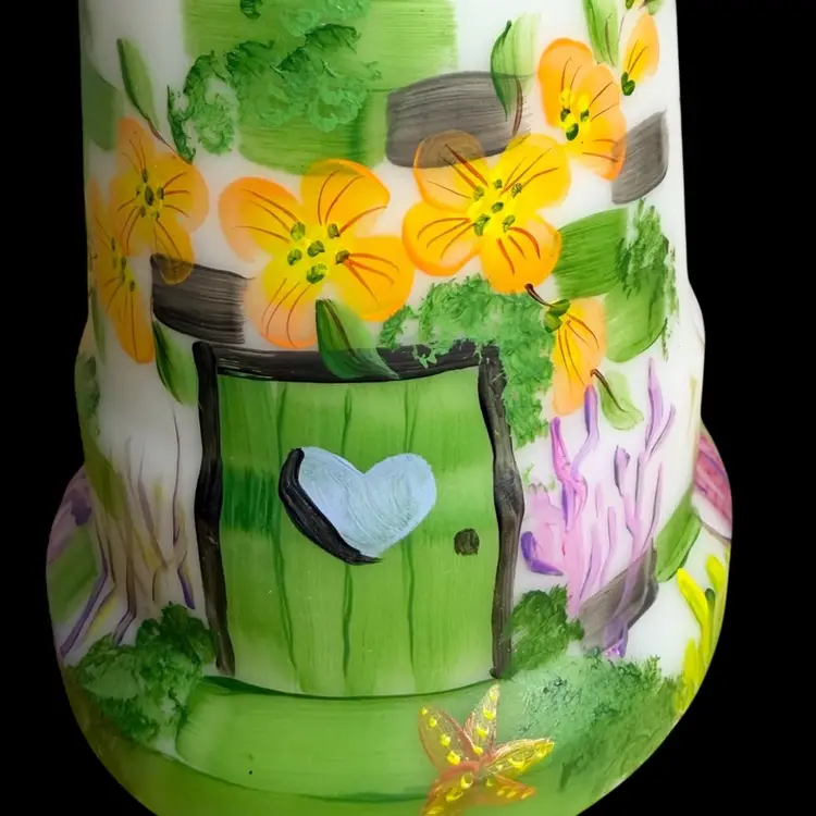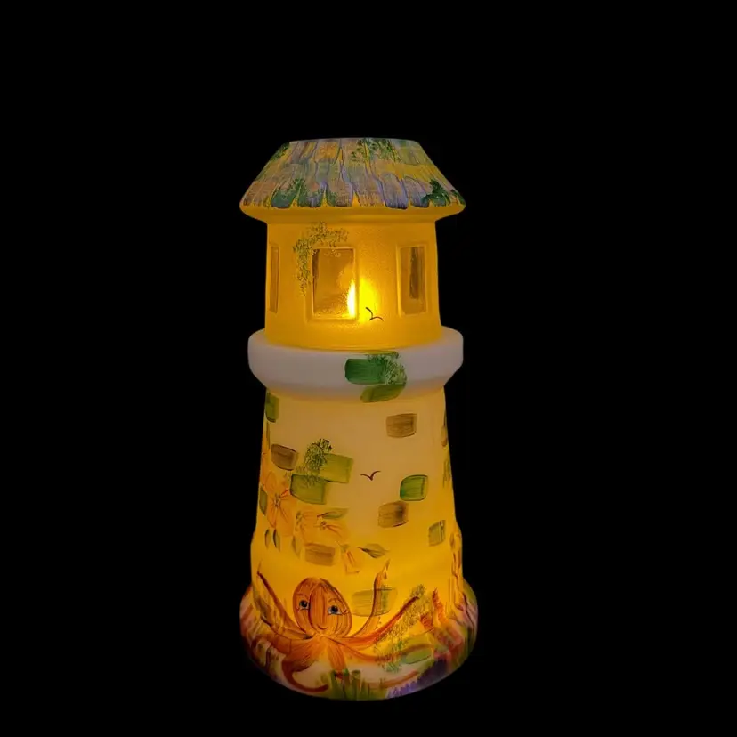 Super FENTON exclusive two light fairylight. Limited edition of 12. Change color of the tea lights to give it a different look. Light green glow to the top portion and orange flowers with a 365 UV Light. Tea lights not included.