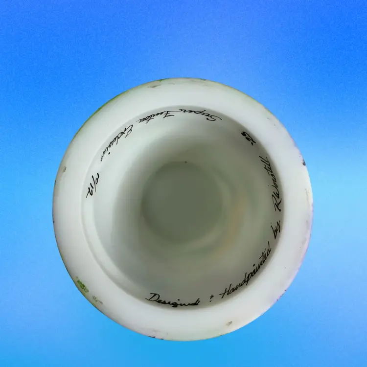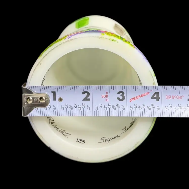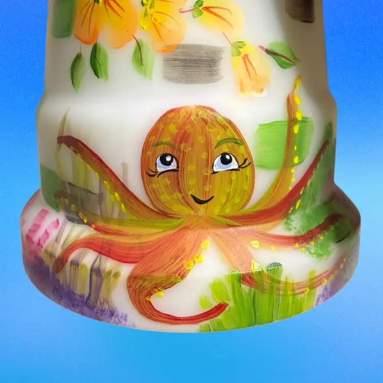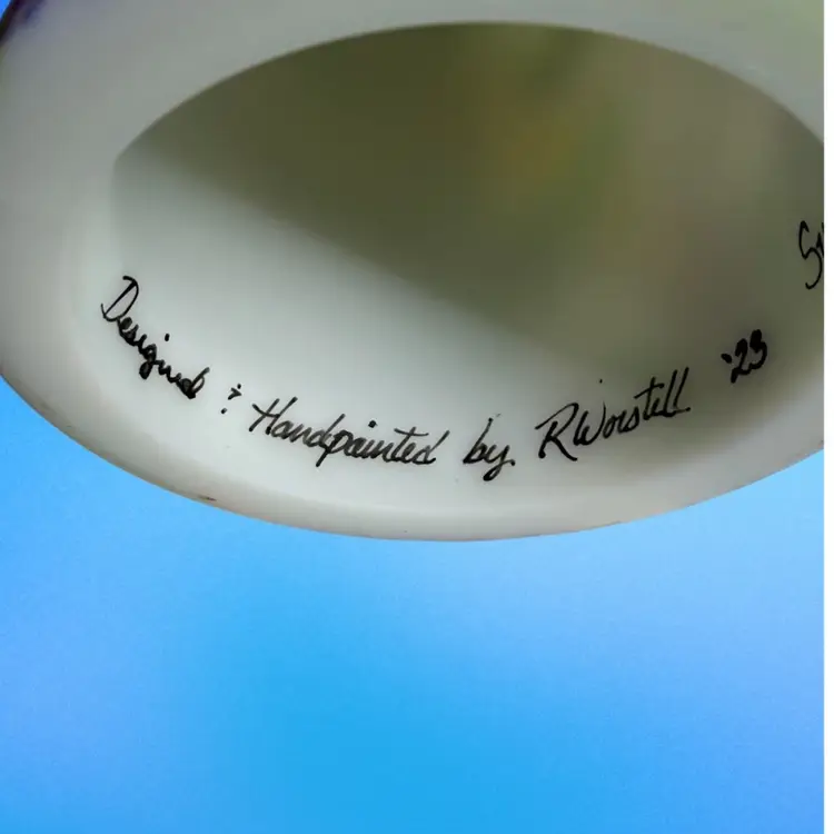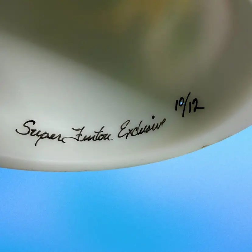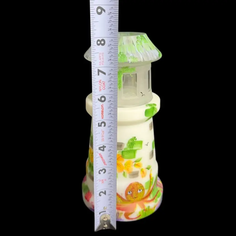 Super FENTON exclusive two light fairylight. Limited edition of 12. Change color of the tea lights to give it a different look. Light green glow to the top portion and orange flowers with a 365 UV Light. Tea lights not included.