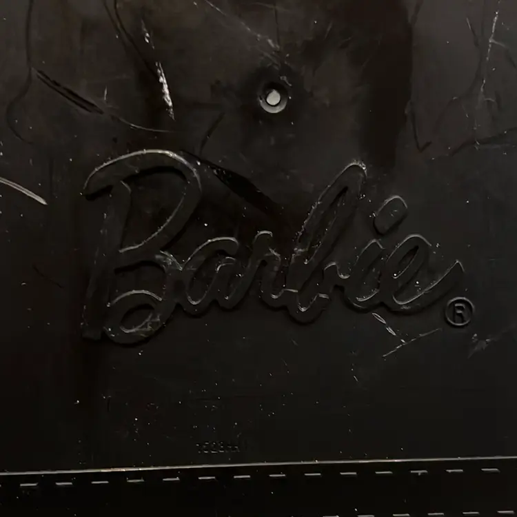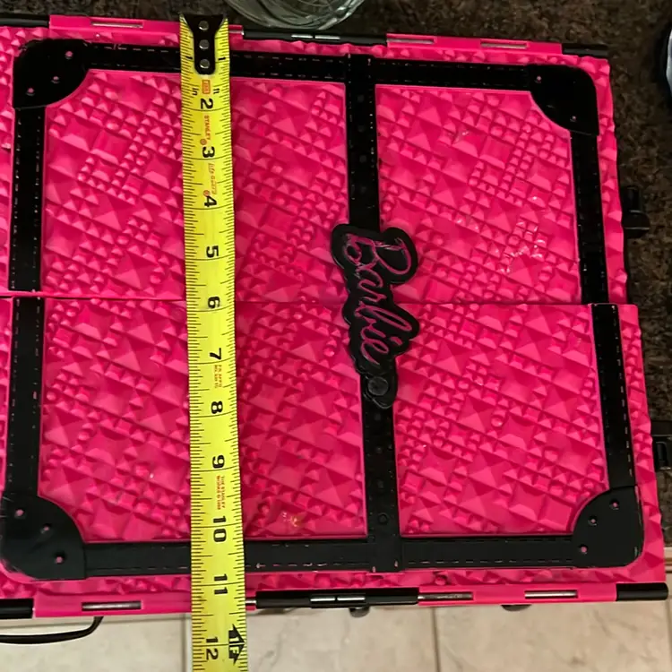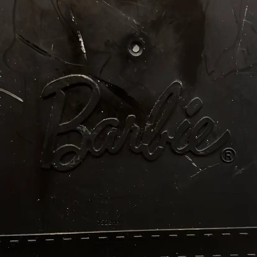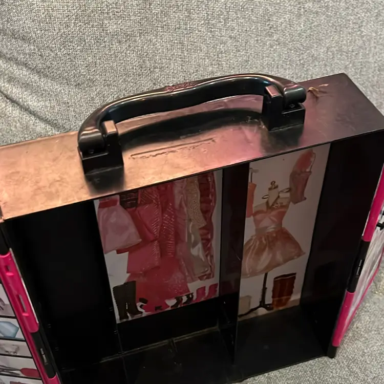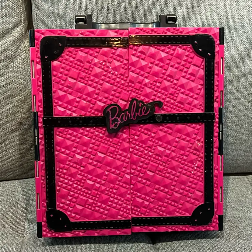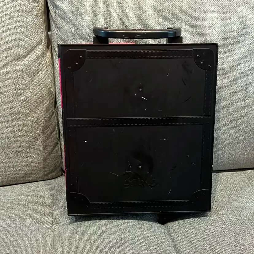 Fun, black and hot pink Barbie case. Handle works and inside of Barbie. Case in great condition with decals. Still attached. Fun interior love love love. The back of the case is a little bit worn with scratches but should cleans up well.