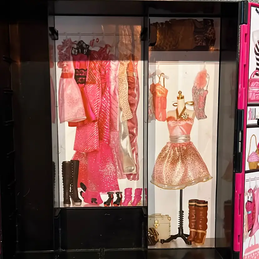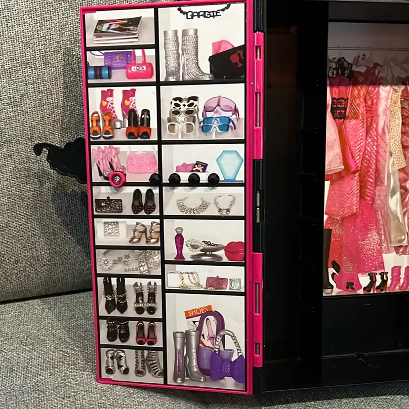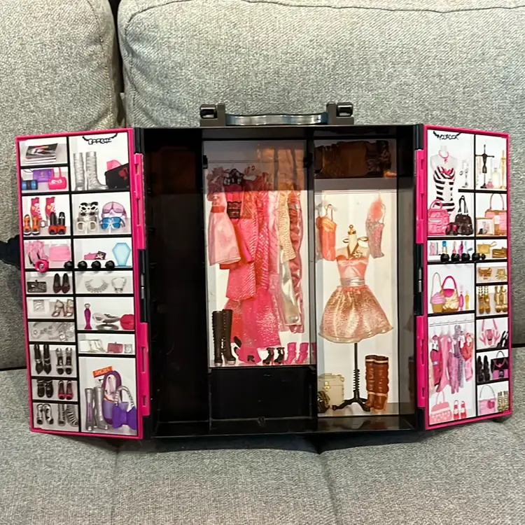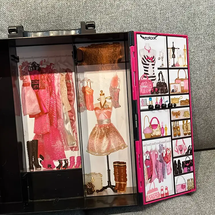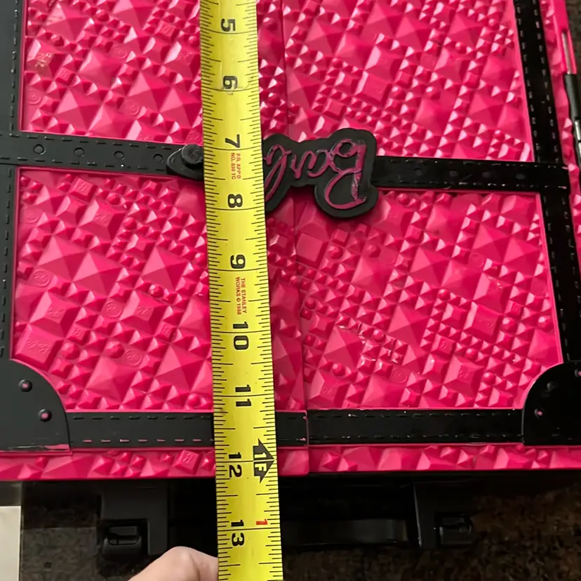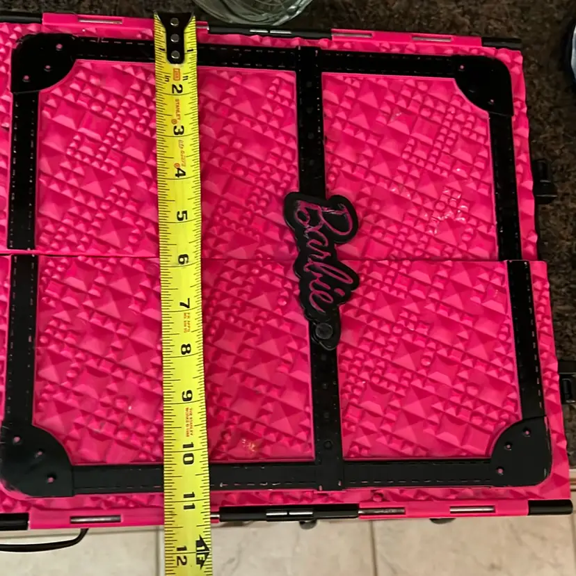 Fun, black and hot pink Barbie case. Handle works and inside of Barbie. Case in great condition with decals. Still attached. Fun interior love love love. The back of the case is a little bit worn with scratches but should cleans up well.