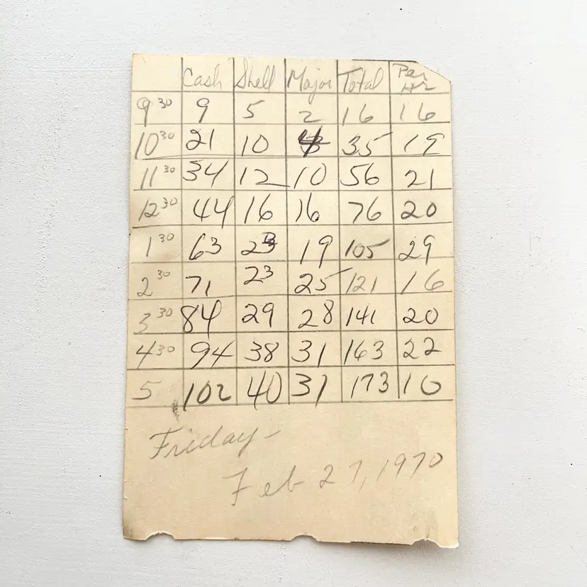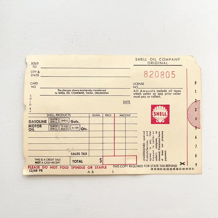 Super Shell Gasoline X-100 Motor Oil Credit Charge Card Sales Receipt Tulsa 60s Shell Products Services This Original Blank Shell Gas Station Credit Charge Sale Receipt was filled out by a Service Station Attendant With Purchaser and Seller Information: Sold To, City & State, Sold By, Date, Gallons & Quarts, Price, Amount, Sales Tax, Total, License No and a Signature This was Not a Cash Receipt The Charges were Transferred to Shell Oil Company, Tulsa, Oklahoma A Copy was Required for State Tax Refund Dated December 1968 The notes on the back side detail how many transactions were cash, Shell credit card, major credit card per hour for Friday February 27, 1970 Condition: Blank stub. The paper is toned, browned, discolored, Filling station attendant penciled notes on the back side. The number on this receipt is No 820805 (but this number will change depending on which card you buy). All other information on the receipt is the same. Measures 5 inches x 3-1/4 inches Packaged in a plastic sleeve inside a rigid envelope Visit my store to see more vintage ephemera, advertising, novelties, gifts, estate sale and yard sale finds https://district.net/u/finderspickerspaper SKU B15